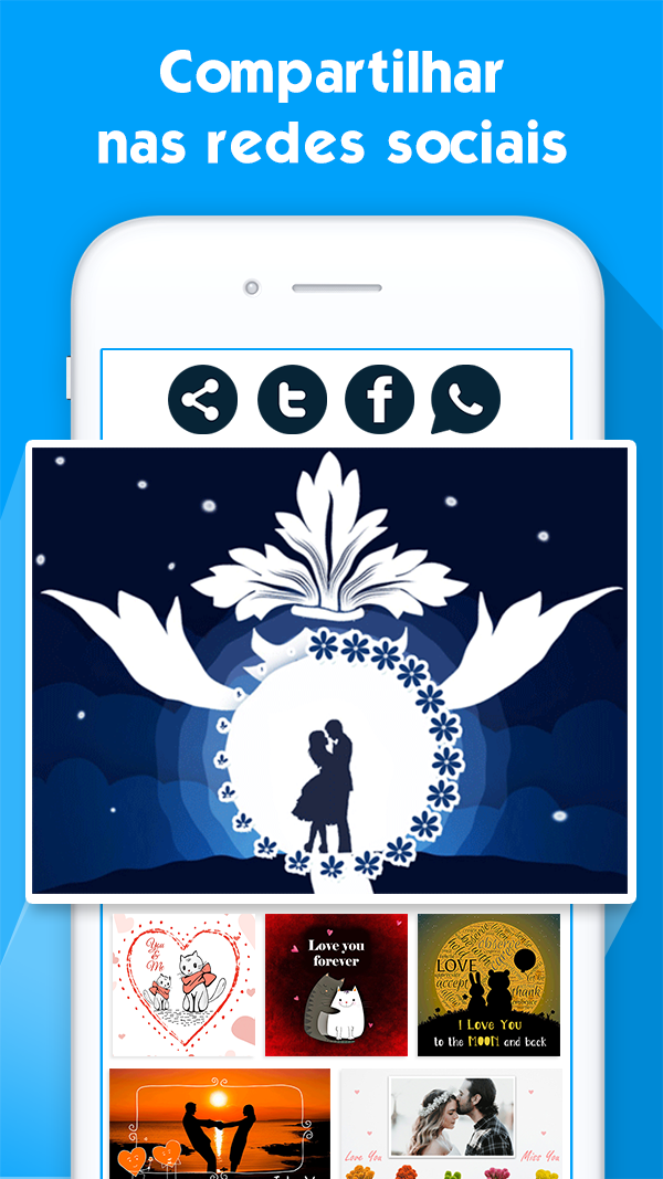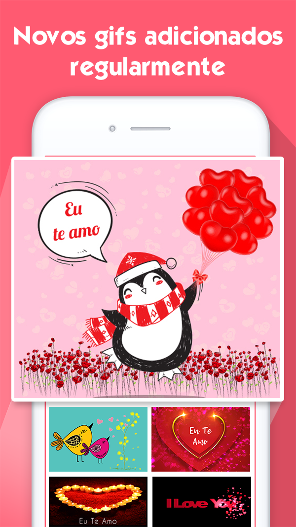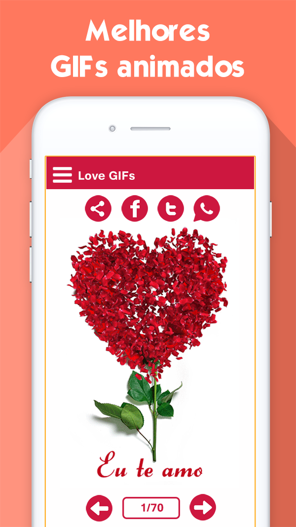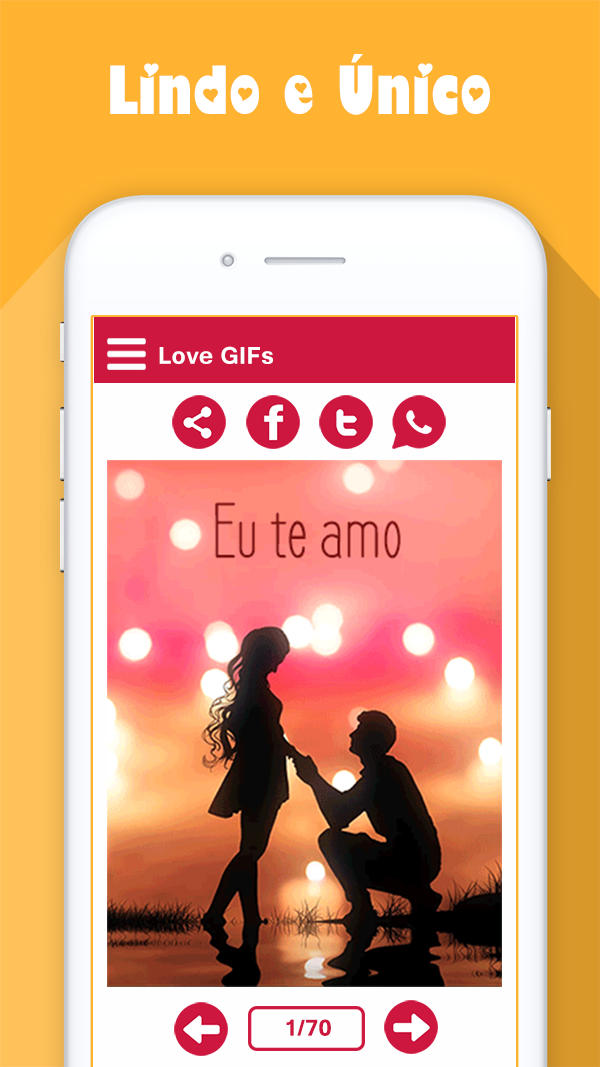 Eu te amo Gif é a melhor coleção de gif de amor e casal. Todos os gifs são lindos e únicos. Além do gif, o aplicativo possui uma enorme coleção de imagens de amor que são a melhor combinação de mensagens e citações românticas. Agora o aplicativo é compatível com 5 idiomas: Inglês, Espanhol, Português, Italiano e Alemão. Novas imagens serão adicionadas regularmente. Principais características: * Mais de 100 gif Eu te amo: você encontrará centenas de imagens animadas de amor para impressionar seu amante e derreter seu coração. * Mais de 300 imagens românticas para casal * Mais de 200 imagens de citações românticas * Compartilhe fotos facilmente em redes sociais. * Salve GIFs no cartão SD. * Adicione itens à seção de favoritos. * Navegue pelos itens por lista ou visualize em detalhes de forma rápida e conveniente. * Altere rapidamente as categorias pressionando a caixa suspensa no canto superior.