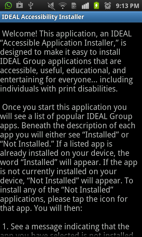 Welcome! This application, an IDEAL “Accessible Application Installer,” is designed to make it easy to install IDEAL Group applications that are accessible, useful, educational, and entertaining for everyone... including individuals with print disabilities.