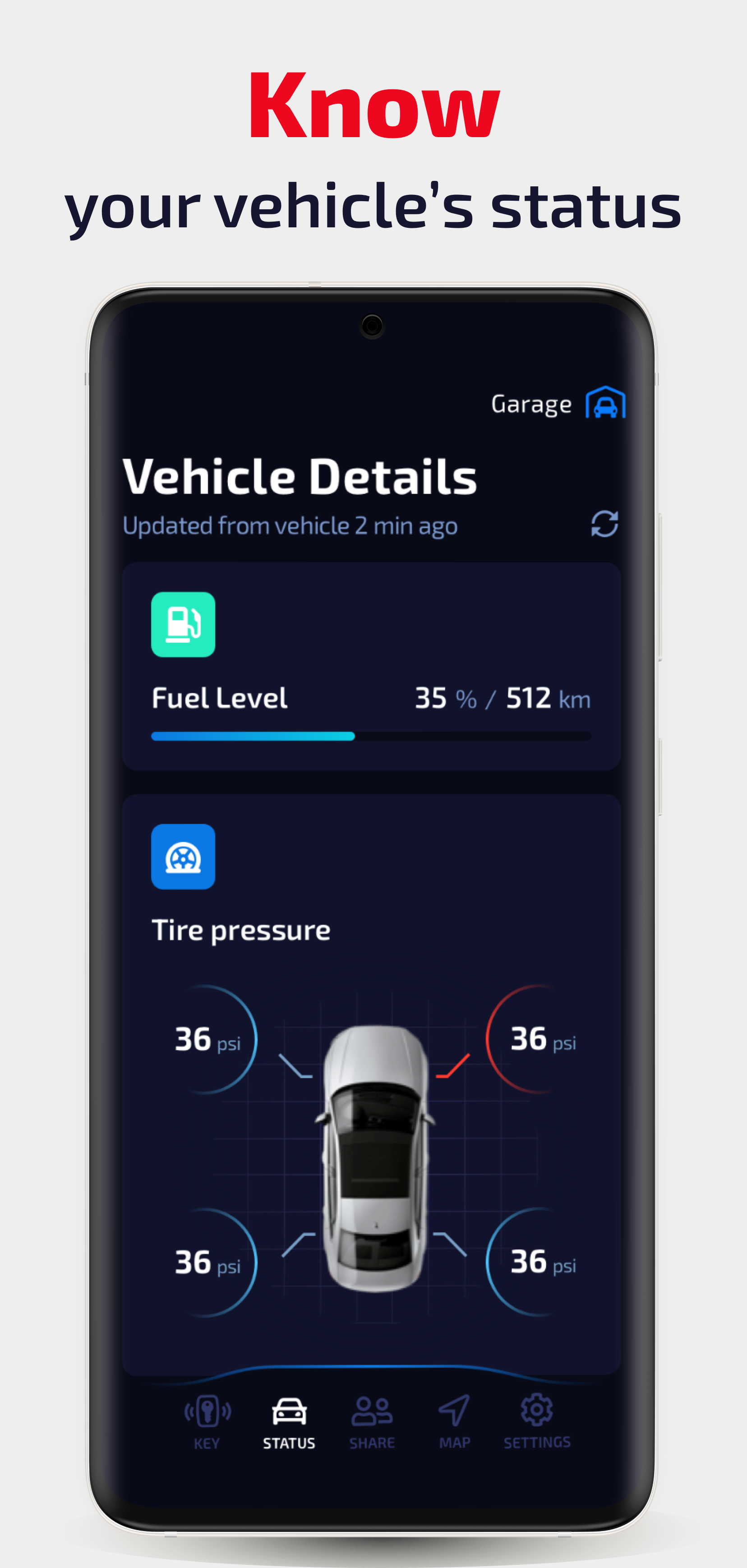 > Garanta a segurança da condução antes da partida. Verifique o status do motor do veículo ao vivo remotamente, incluindo a pressão dos pneus, óleo / nível da bateria EV e receba alertas de segurança para evitar riscos de acidentes rodoviários ou quebra do motor ao dirigir.