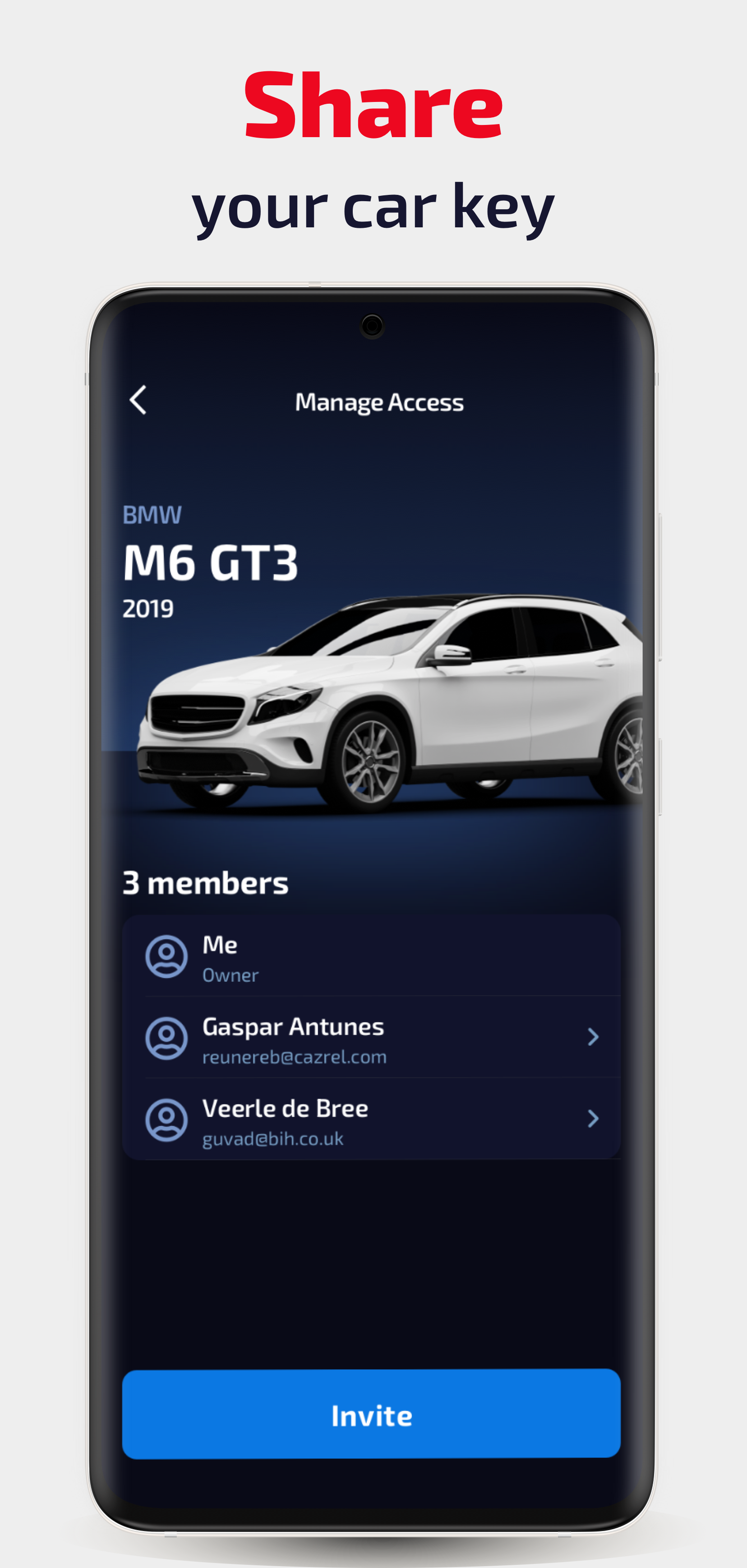 > Compartilhe a chave do carro com segurança com o protocolo BANK-GRADE SECURITY. Compartilhe a chave do carro digitalmente com os locatários sem troca de chaveiro física ou com outros membros da família necessitados.