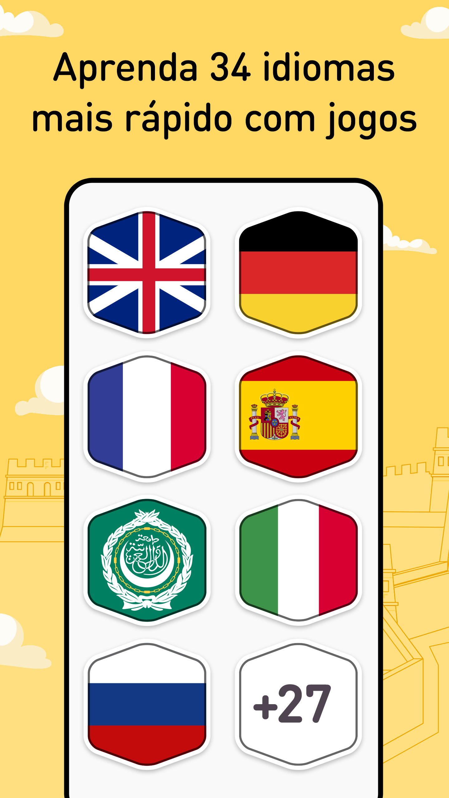 Você pode aprender 34 línguas: inglês, inglês americano, francês, alemão, italiano, espanhol, romeno, russo, árabe, búlgaro, catalão, chinês, chinês tradicional, croata, tcheco, dinamarquês, holandês, finlandês, grego, hebraico, hindi, húngaro, indonésio, japonês, coreano, norueguês, polonês, português, português brasileiro, eslovaco, sueco, tailandês, turco, ucraniano.
