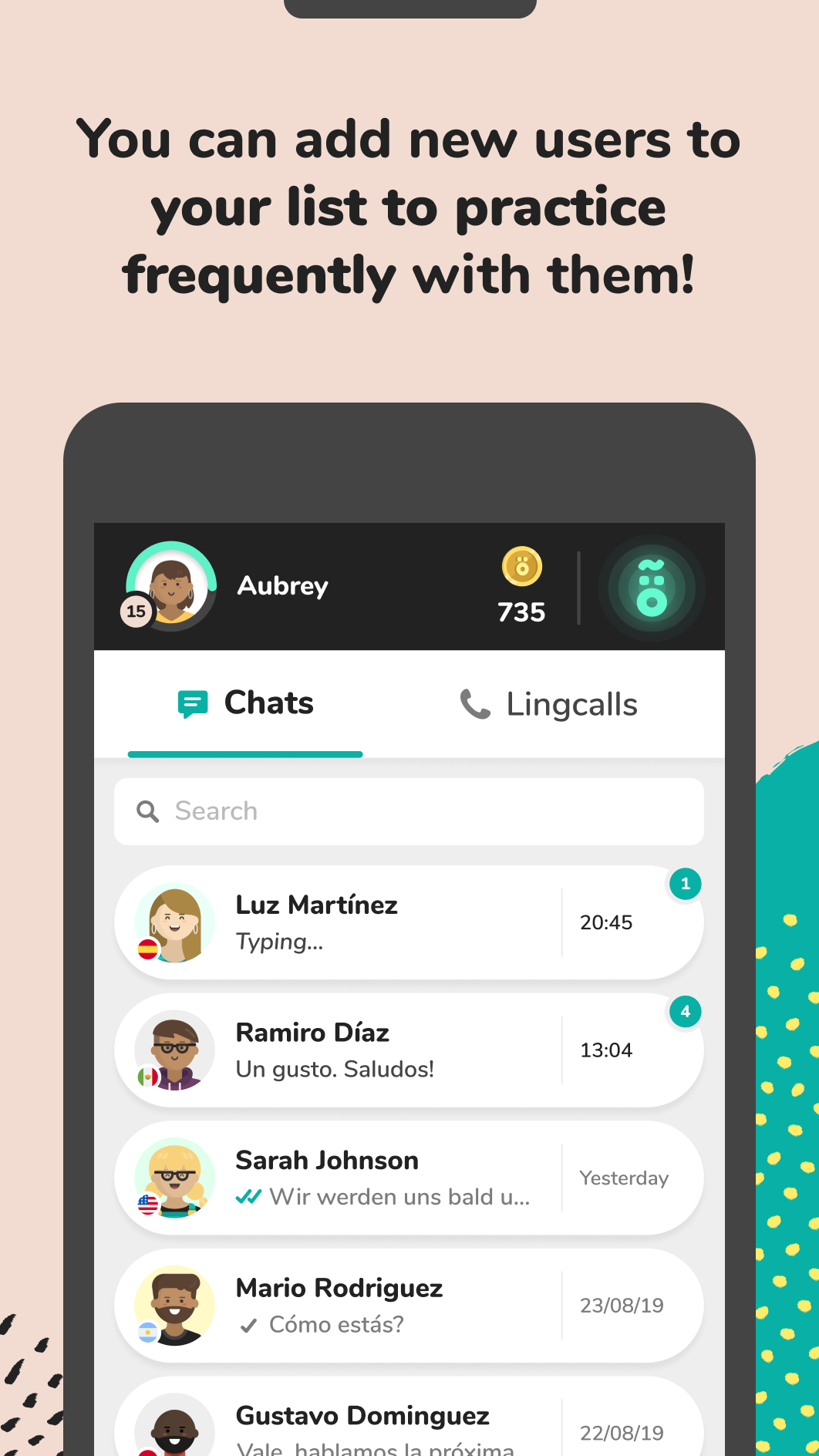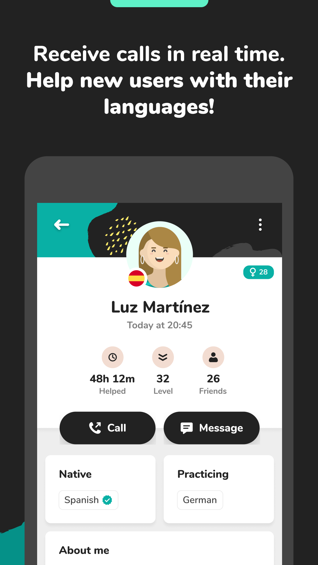 Pressionando o botão de chamada irá procurar por uma pessoa que vai ajudá-lo a praticar o idioma selecionado no momento. Se você gostou da conversa telefónica, dar "Like" em seu perfil. Se é mútuo, você vai se tornar amigos e você pode voltar a escrever através de chat ou ligar de volta a qualquer momento e praticar idiomas juntos.