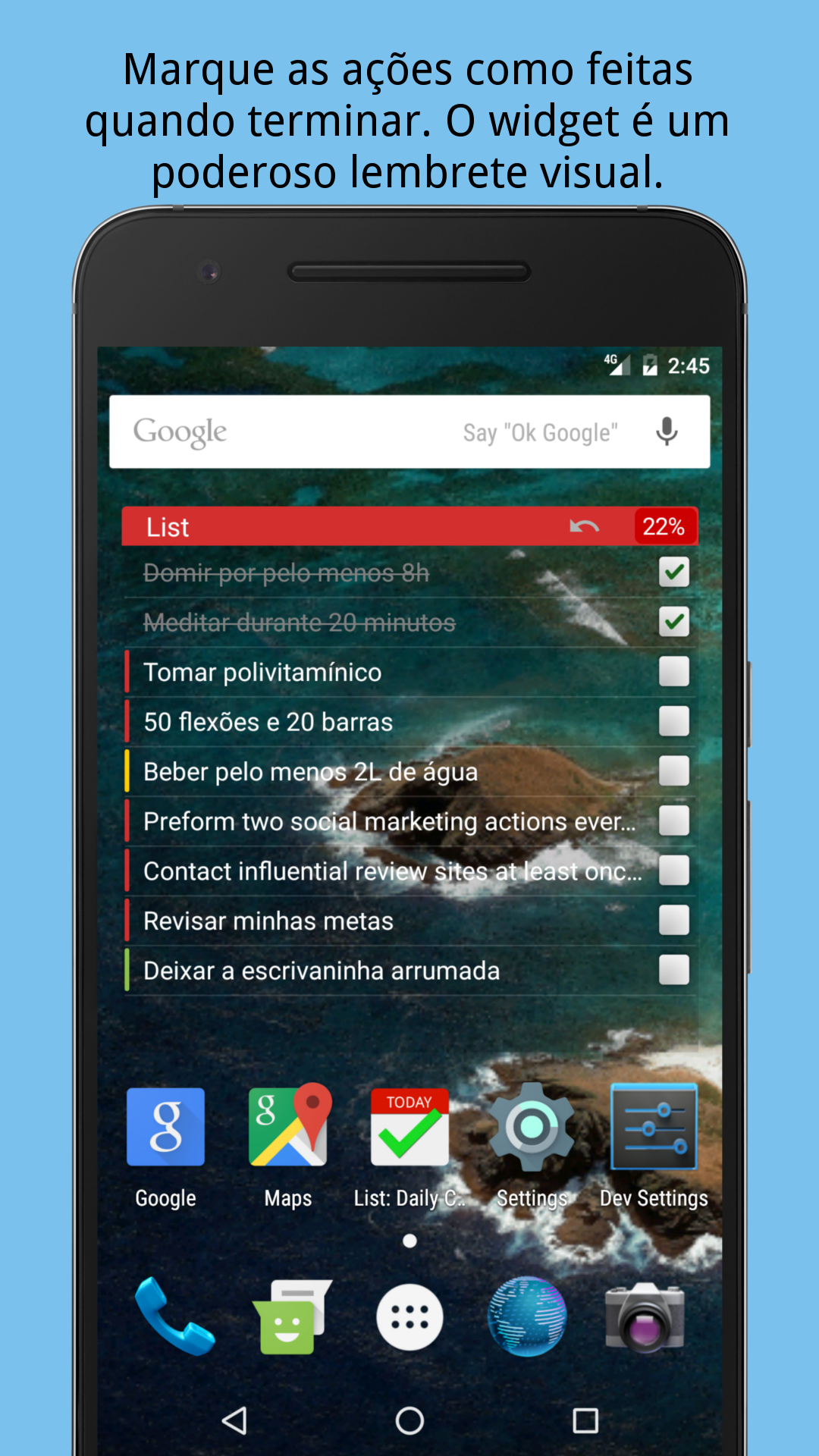 O widget da tela inicial também serve como um lembrete das ações que você precisa fazer hoje. Cada vez que você mexer em seu celular, você verá a lista e a quantidade de ações restantes.