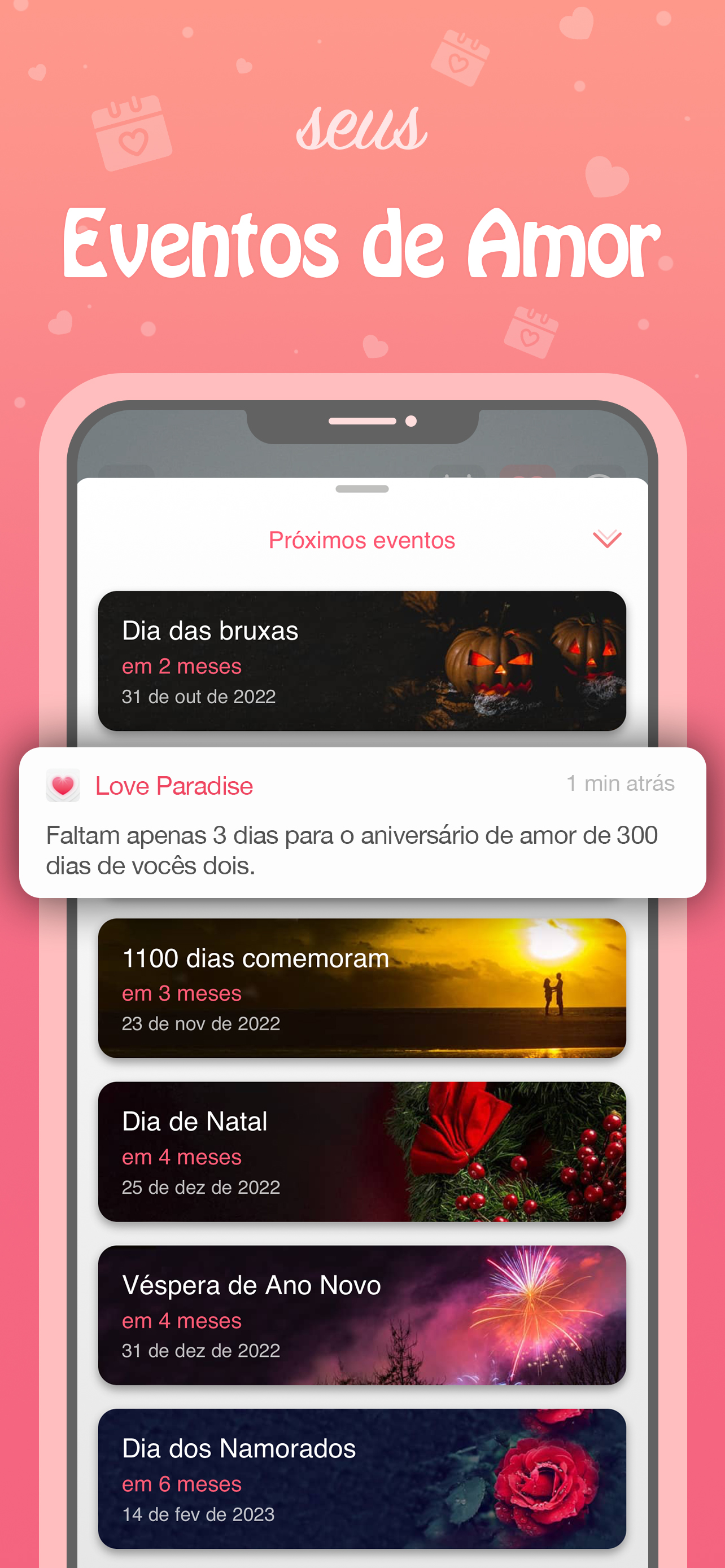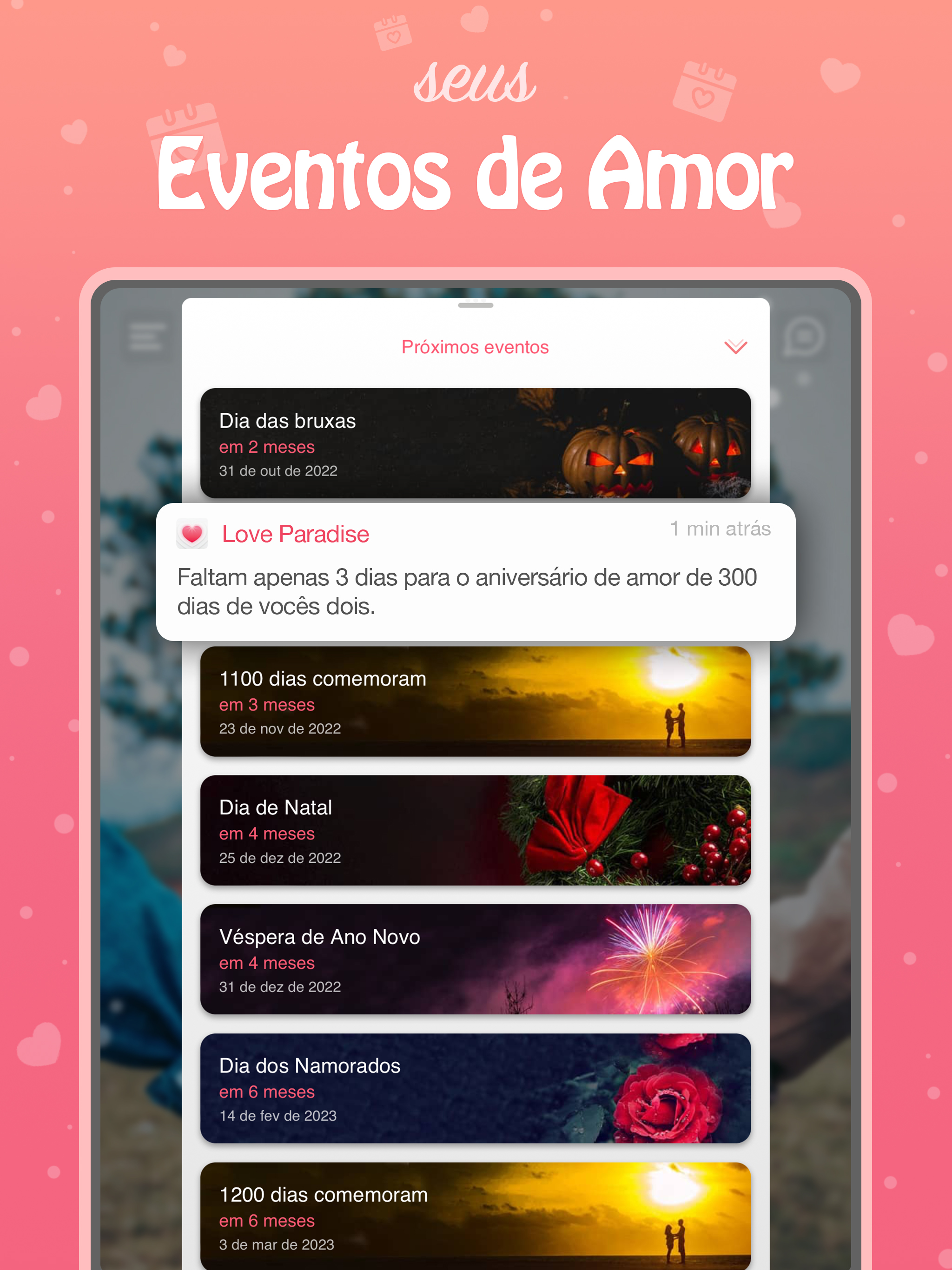 Love Paradise exibirá todos os próximos eventos de amor para você, e o melhor é que o aplicativo também enviará notificações para lembrá-lo de aniversários, feriados para amantes e até aniversários. de seu amante.