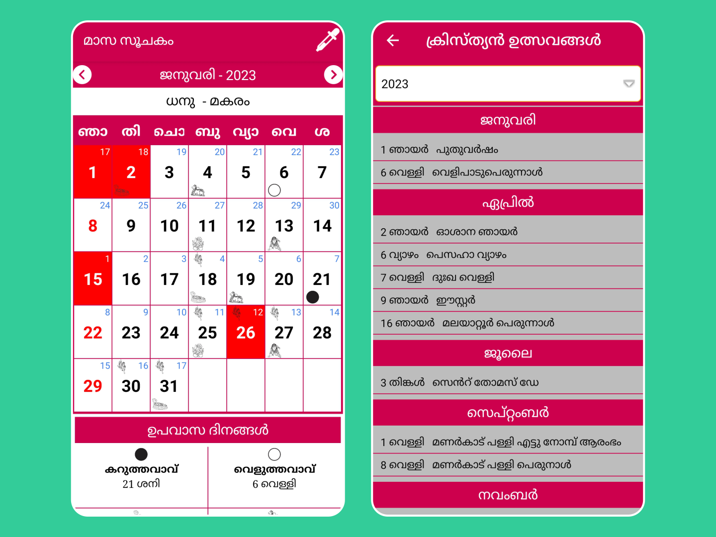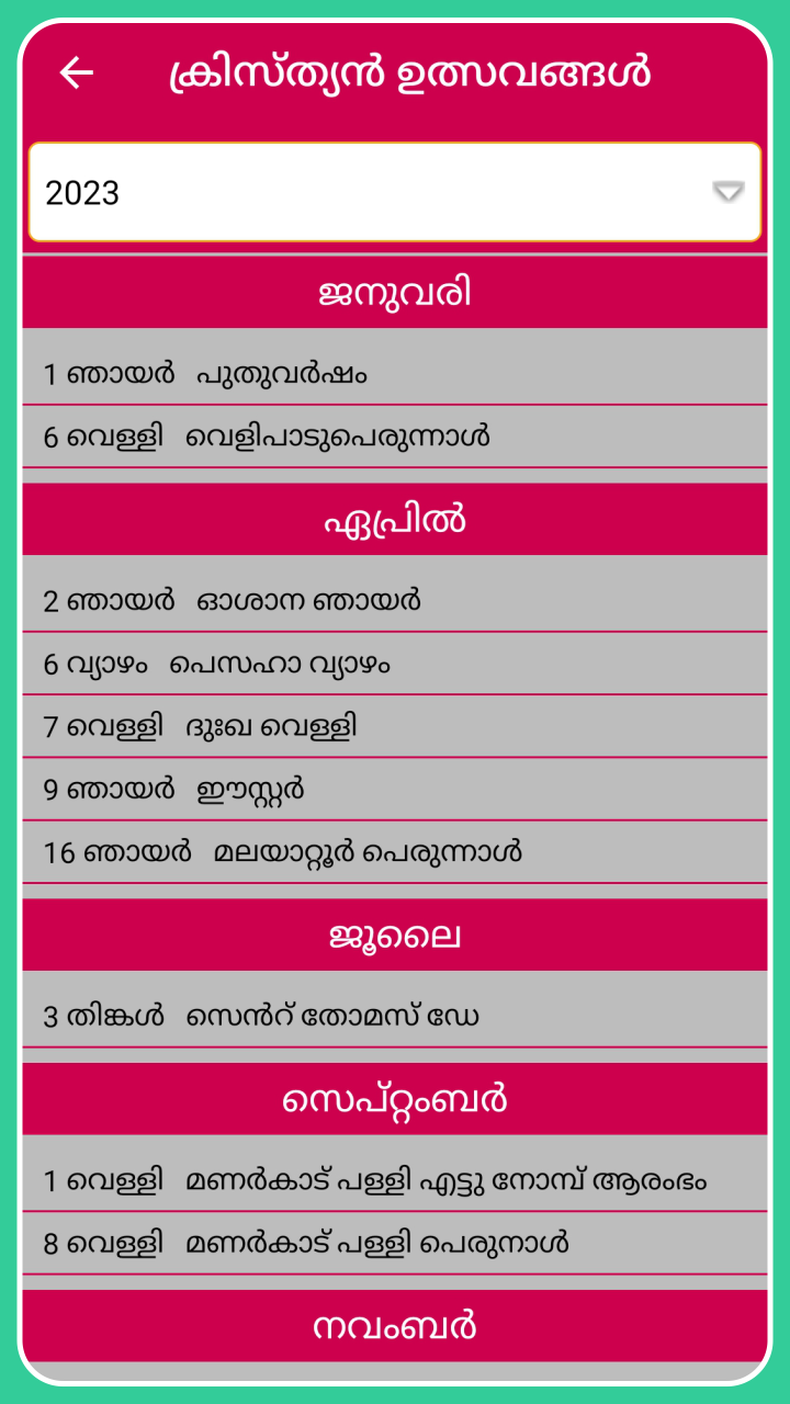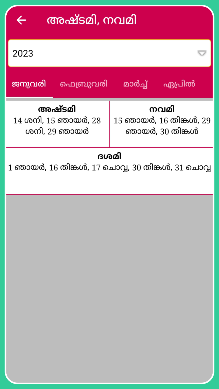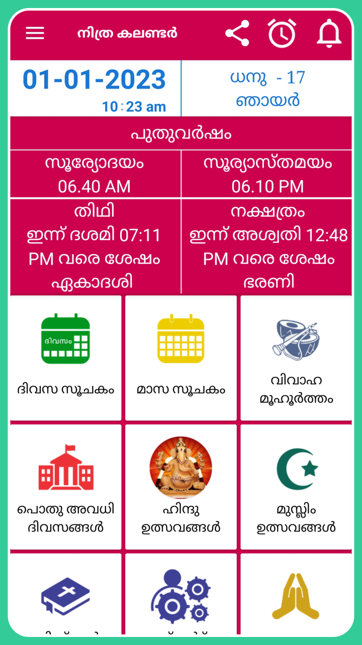 Calendário malaiala 2023 com o aplicativo de calendário panchangam malaiala 2023 contém todos os detalhes, como lista de feriados de 2023, lista de festivais, detalhes de panchangam de 2023, lista de dias shubh muhurat para pessoas que falam malaiala em todo o mundo. O aplicativo Nithra Malayalam Calendar 2023 funciona no modo offline, como você pode ver Nakshatra, Thithi, Muhurtham, Rahu Kalam, Gulika Kalam, Udayam, Asthamayam e Namaskarasamayam. Malayalam panchangam 2023 permite que você visualize o ano malaiala, o mês malaiala, Kalam, Sooryodayam, Sooryaasthamam por todos os dias do ano de 2023 no modo offline. Este Calendário Malayalam 2023 traz para você os detalhes sobre feriados, como feriados governamentais, festivais malayalam, feriados Pooja em celebrações culturais de Kerala para pessoas que falam malayalam. As opções de lembrete estão disponíveis neste aplicativo 2023 മലയാളം കലണ്ടർ para continuar lembrando você do dia-a-dia, adicionando-o ao Notes Recursos do calendário malayalam 2023 / 2023 മലയാളം കലണ്ടർ : * Opção de exibição de dia e mês para o calendário Nithra malayalam de 2023 * Você pode ver o tempo exato para Tithi, Nakshatra, Yoga, Karana para 2023 malayalam panchangam * Pournami, Amavasya, Ekadasi, Pradosham, Masa sivarathri, Sankatahara chaturthi Datas para malayalam panchangam * Datas de casamento para o calendário do ano de 2023 * Calendário Kolla Varsham para o calendário malaiala de 2023 * Calendário Hijara Varsham para calendário malayalam 2023 * Você pode compartilhar todas as informações neste aplicativo de calendário malayalam 2023 via mídia social * Mais de 27 ferramentas inteligentes adicionadas como Cash Tally, Age Difference, Age Calculator, Om sound, Bell sound etc. Obrigado por baixar o aplicativo Malayalam Panchangam 2023 Calendário Malayalam 2023