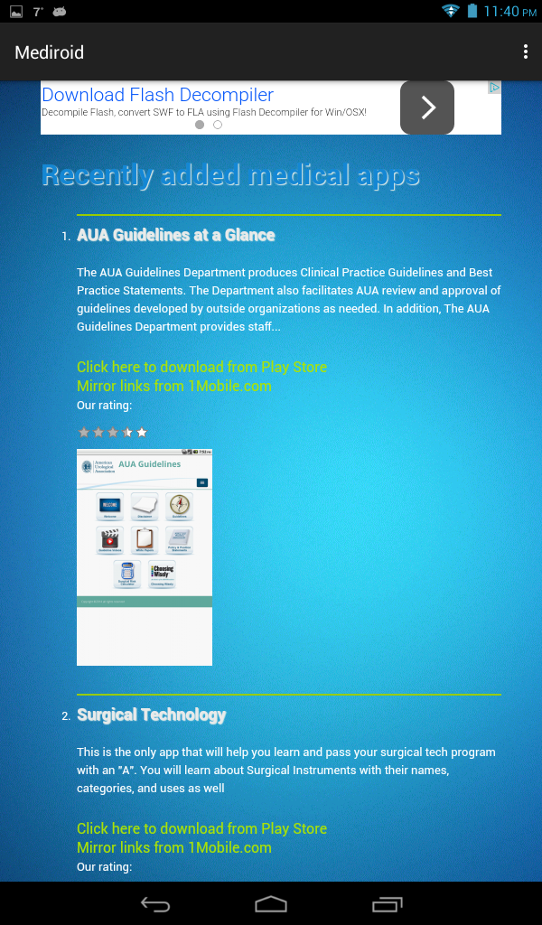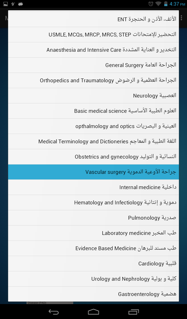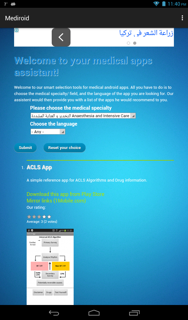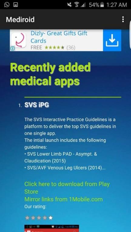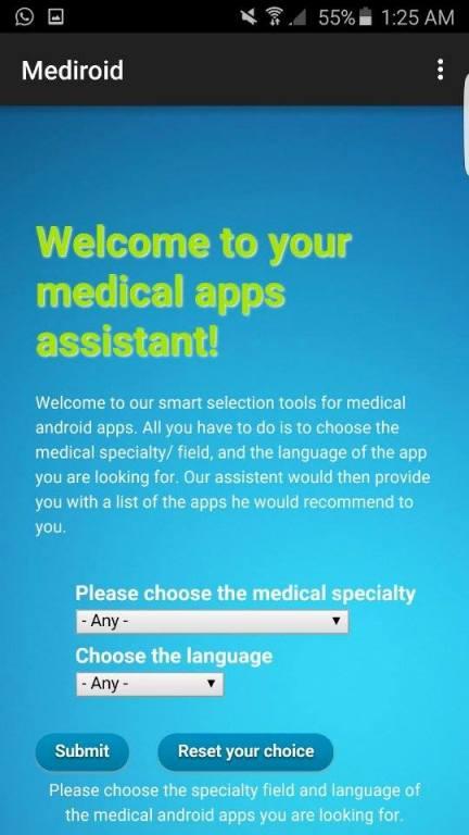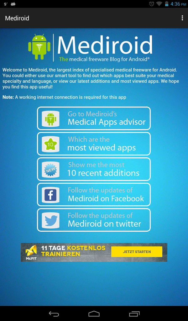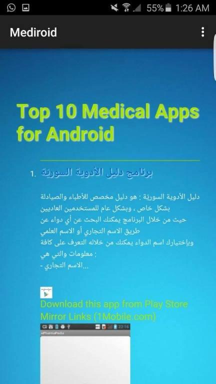 This app helps you find out which free medical apps for android best meet your needs and assist you with your medical study or clinical practice. You could either use our smart tool to find out which medical apps best suite your medical specialty and language, or view our latest additions and most viewed apps. Mediroid's collection of medical apps get updated regularly. This app needs an internet connection, and provides an internet connection diagnostic tool in case things go wrong. ---------------- Q. Which medical specialties? A. They include general surgical medical apps, orthopedics and trauma, Pediatrics, Pharmacology and Antibiotics, Radiology and nuclear medicine, ENT, Apps to help you prepare for USMLE, MCQs, MRCP, MRCS, STEP Exams, Anaesthesia and Intensive Care, Neurology, Basic medical science, opthalmology and optics, Medical Terminology and Dictioneries, Obstetrics and gynecology, Internal medicine, Hematology and Infectiology, Pulmonology, Laboratory medicine, Evidence Based Medicine, Cardiology, Urology and Nephrology, and finally Gastroenterology Q. What are the new modifications in the new release? A. we are just doing some facelifting according to the feedback we are recieving. Q. What about privacy? A. Mediroid is a web-based app which uses cookies. This would provide us with annonymous data that would help us further improve the app and add more features. You can follow us on facebook here: https://www.facebook.com/mediroid/ You can download the arabic version here: https://play.google.com/store/apps/details?id=com.medroid.medroid Visit mediroid online here: http://medroid.me/en/start