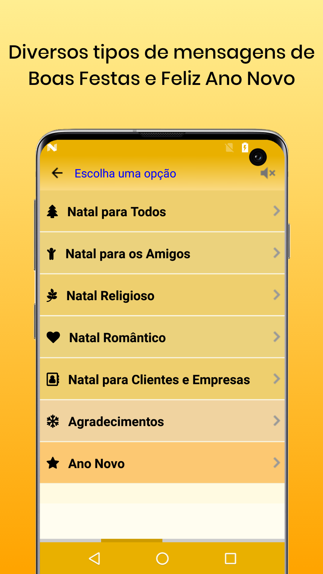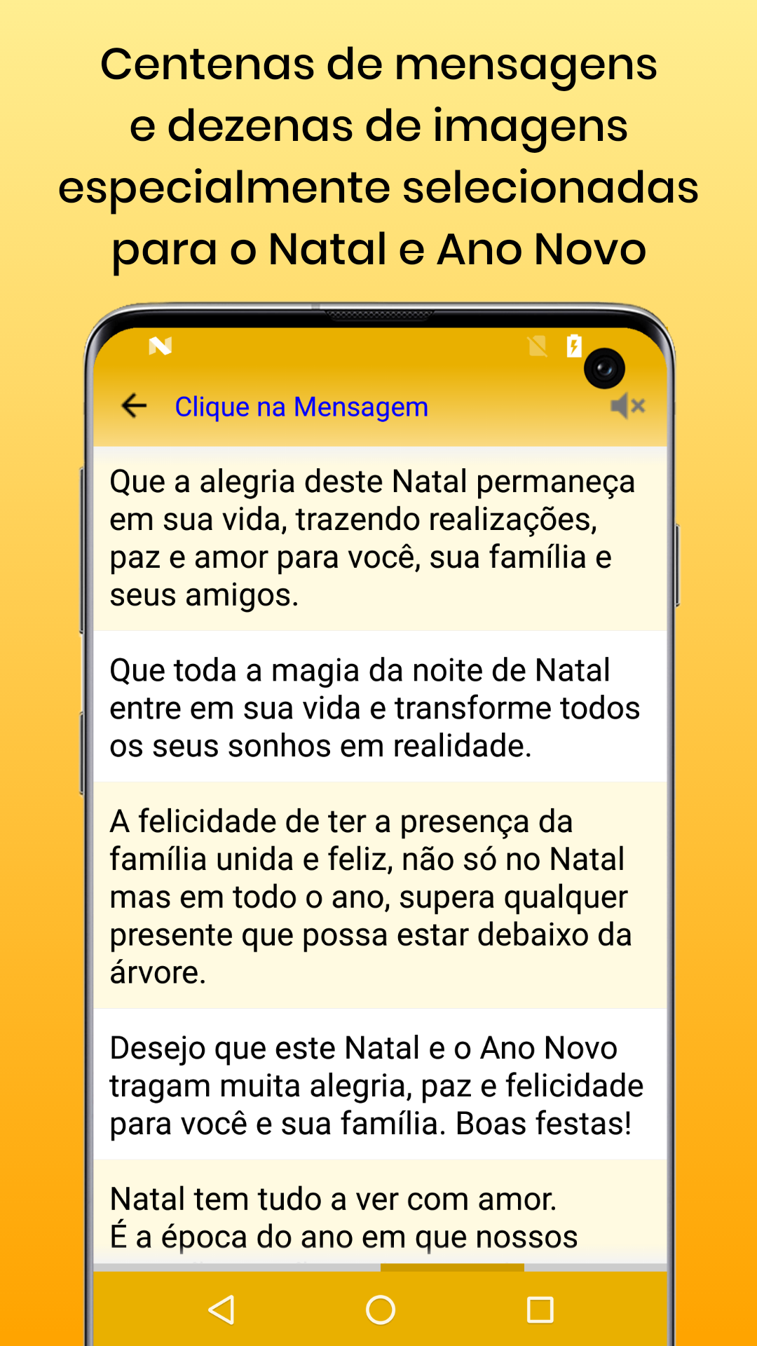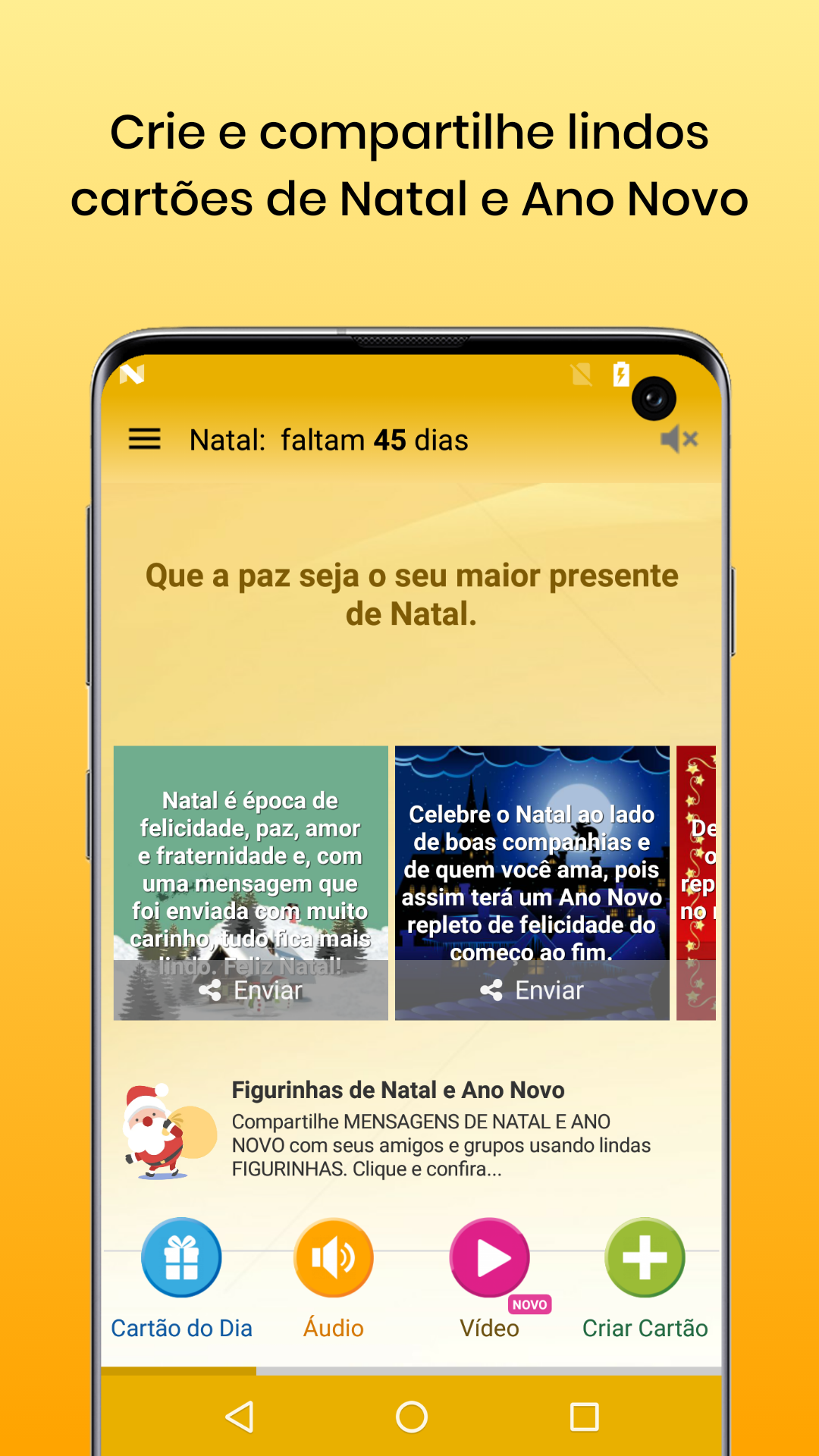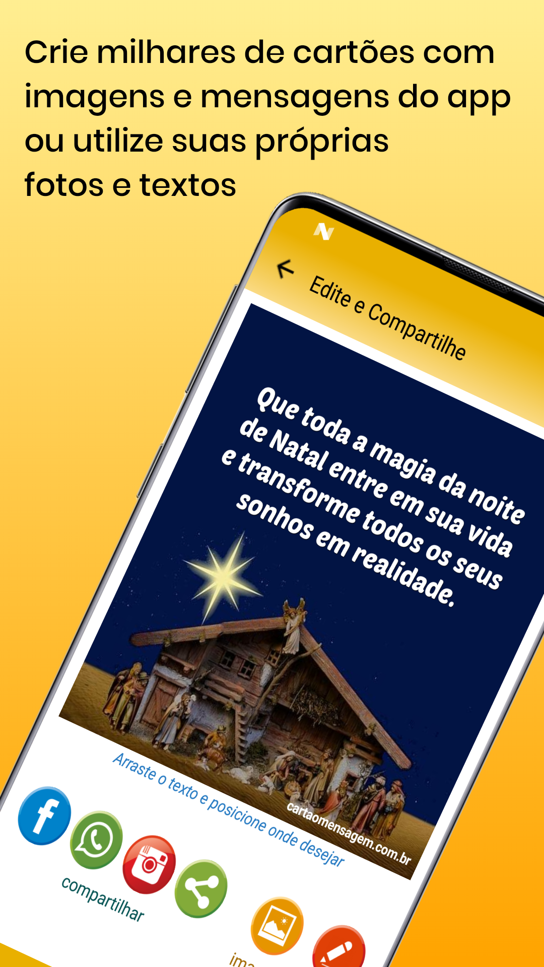 Continue compartilhando solidariedade, esperança e otimismo durante todo o ano. ★ NOVIDADE: Lindas figurinhas exclusivas para instalar no WhatsApp e compartilhar com seus amigos e em grupos. ★ Vídeos para compartilhar nas suas redes sociais, status e stories. ★ Crie e compartilhe com seus amigos, colegas, familiares ou a pessoa amada cartões especiais de Natal e Ano Novo com as melhores frases e imagens. Baixe agora totalmente GRÁTIS! Acesse cartaomensagem.com.br e confira nossos outros aplicativos na Google Play. Aqui você encontra centenas de mensagens e dezenas de imagens especialmente selecionadas para o Natal e Ano Novo, que você pode selecionar, de forma rápida e fácil, criar seu cartão e compartilhar por e-mail, SMS, Facebook, Google+, Twitter, Instagram, WhatsApp ou outro aplicativo instalado em seu telefone ou tablet. ★ Principais características: • Escolha entre centenas de belas mensagens de Natal, Agradecimento e Ano Novo, divididas por categorias, e dezenas de imagens de fundos. • PERSONALIZE a cor, o tipo, alinhamento e tamanho da fonte e altere o texto do cartão da forma que desejar. • Crie, de forma fácil e rápida, mais de 10.000 encantadores cartões personalizados com diferentes estilos e mensagens. • Basta escolher o tipo de mensagem natalina, uma imagem, uma mensagem e o cartão será criado automaticamente. • COMPARTILHE o cartão mensagem através do FACEBOOK, WHATSAPP, INSTAGRAM, GOOGLE+, SMS, e-mail ou diversas outras opções disponíveis. • Novas IMAGENS ONLINE (requer conexão internet) com temas de Natal e Ano Novo • As imagens internas e as principais mensagens estão disponíveis para criar o cartão sem a necessidade de conexão internet, após baixar o aplicativo. • Ouça todos os dias MENSAGENS DE ÁUDIO online (opção não disponível para compartilhamento). • Assista e compartilhe VÍDEOS de Natal e Ano Novo em seus status e stories do Instagram, Facebook, WhatsApp, etc. Use sua criatividade e a facilidade de uso do aplicativo para criar milhares de cartões personalizados. Natal é tempo de compartilhar, com os verdadeiros amigos, os sinceros votos de prosperidade e felicidade para o novo ano que se inicia. Desejamos a todos um Feliz Natal e um Ano Novo repleto de realizações.