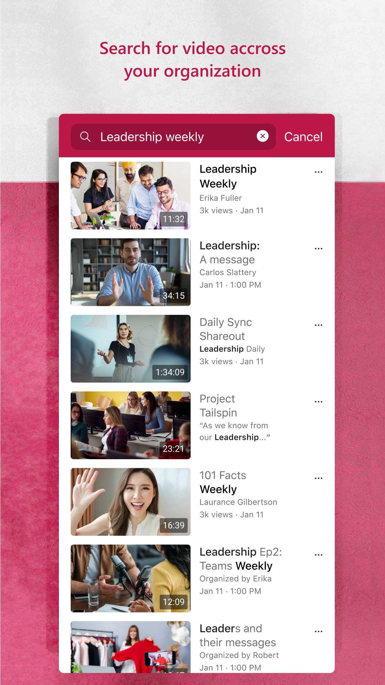• Pesquisar vídeos em sua organização usando palavras-chave ou nomes de autor