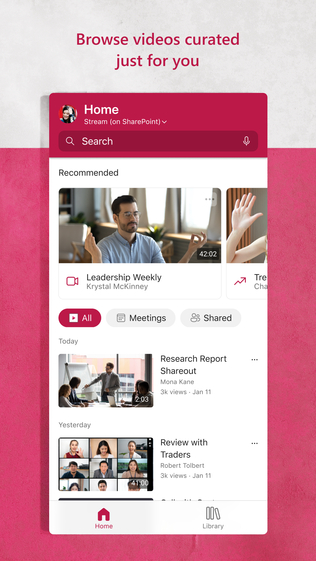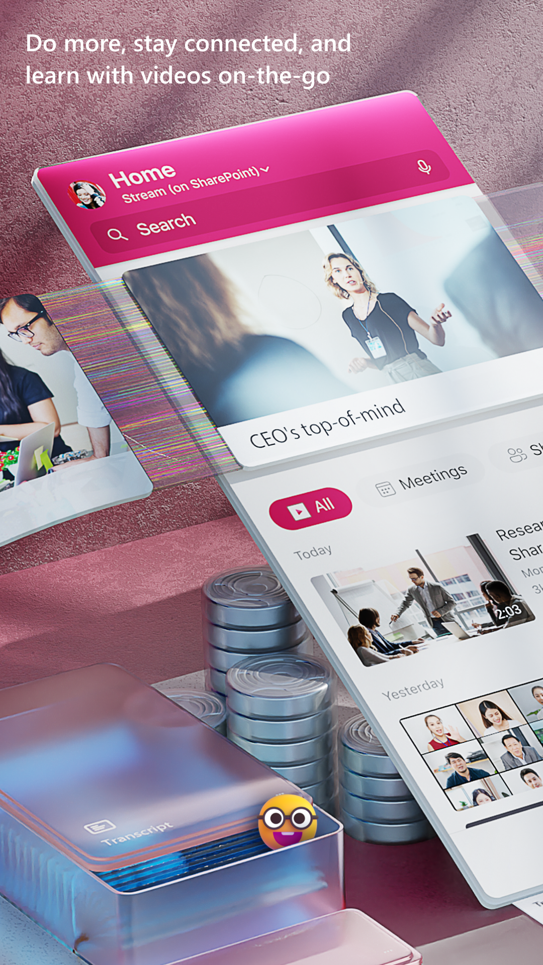 Com o aplicativo móvel do Stream, você pode assistir a vídeos do trabalho ou da escola e acompanhar o que perdeu com as gravações de reuniões do Microsoft Teams. O aplicativo passou por uma atualização de design completa e agora oferece acesso contínuo ao conteúdo do Stream (Clássico) e do Stream (no SharePoint) com um feed inicial personalizado e uma experiência de visualização de vídeo mais avançada.