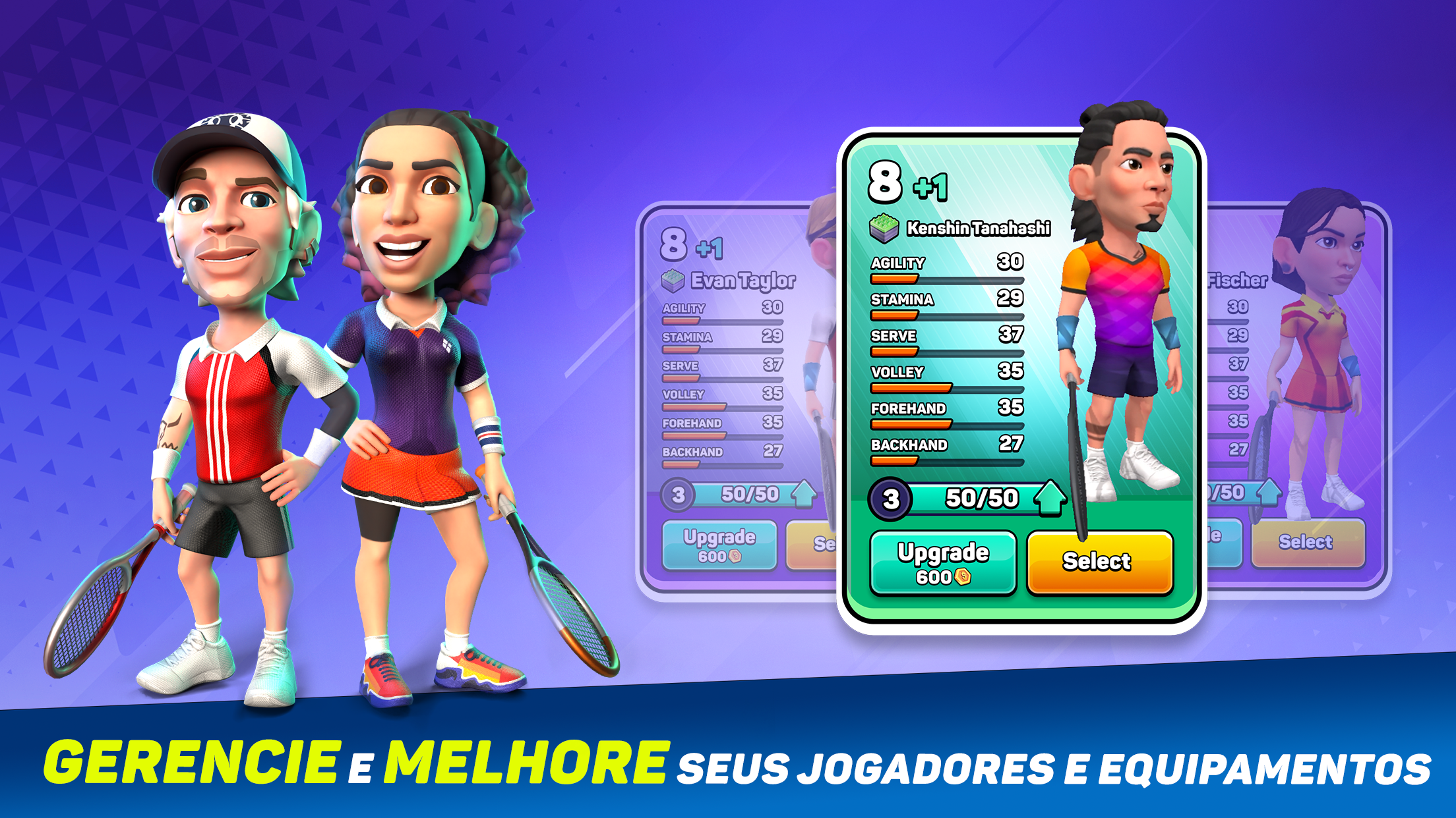 Em Mini Tennis, você pode ganhar jogadores, do tipo normal ao épico, e melhorá-los para transformá-los nos maiores adversários das quadras. Você pode criar seu jogador e também personalizá-lo totalmente com mais de 100 opções, que incluem: