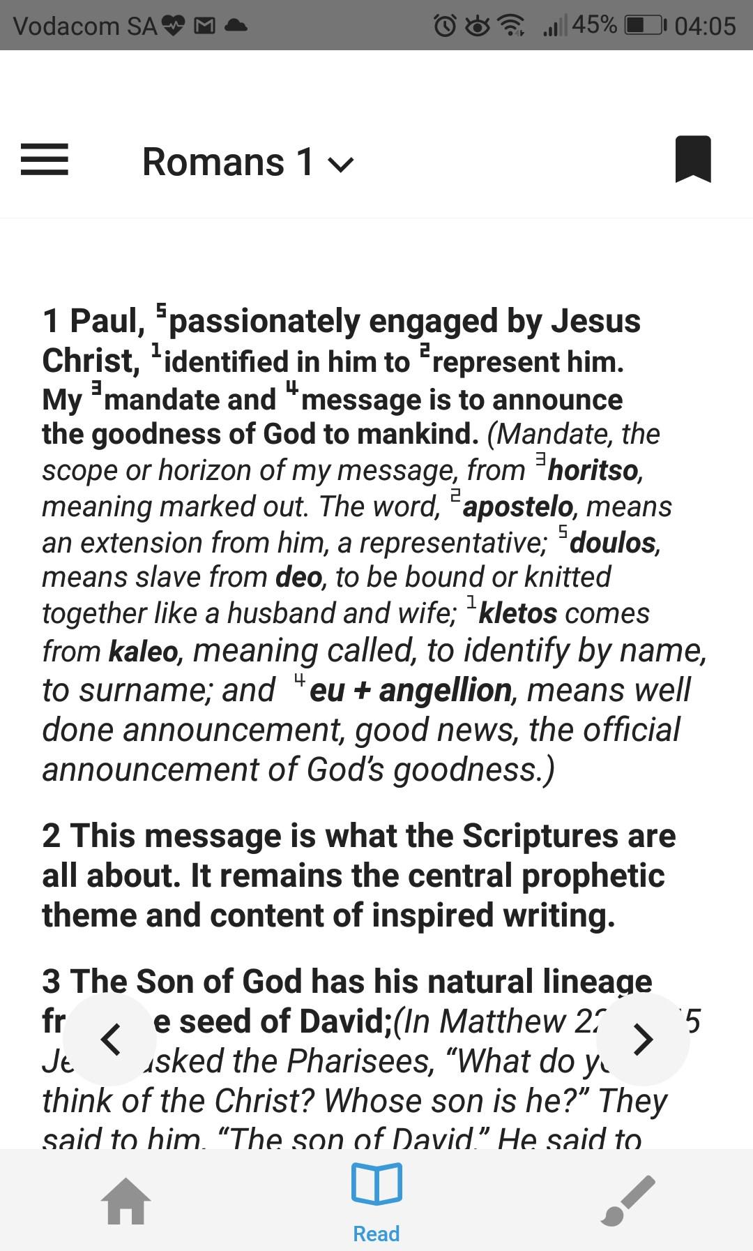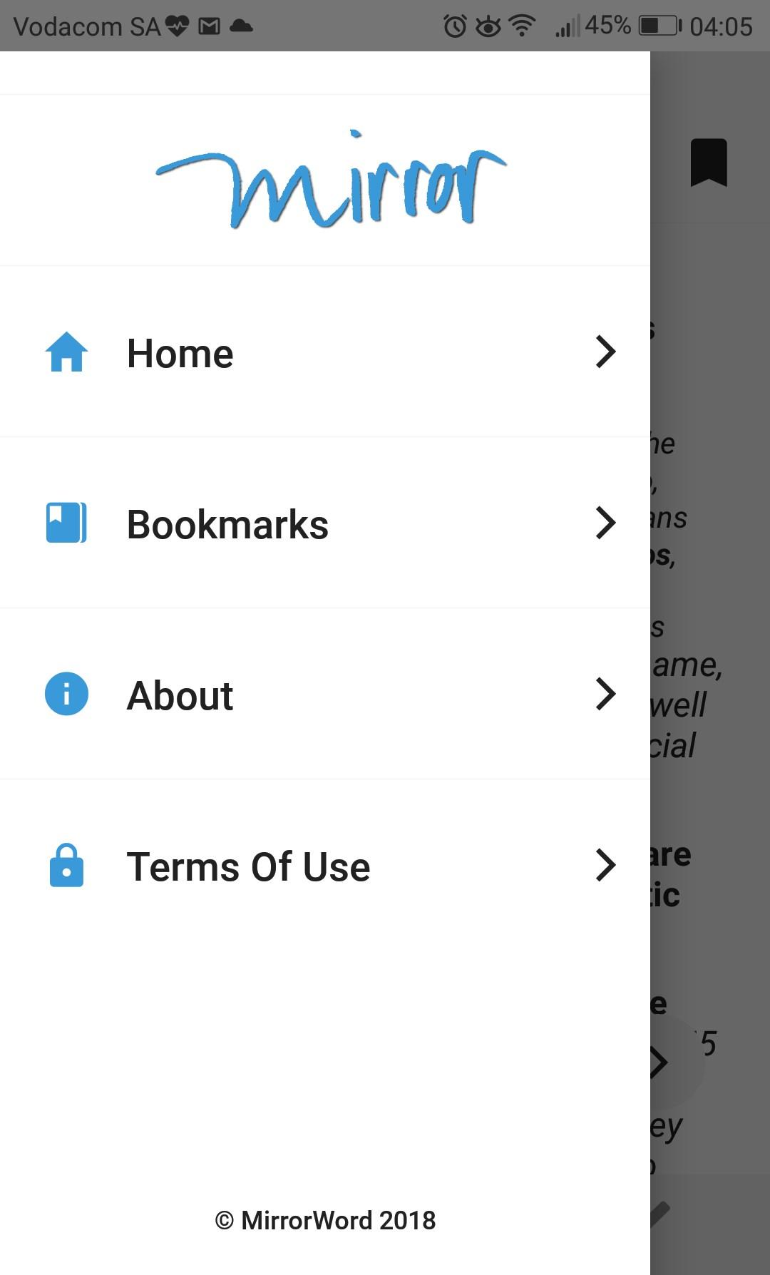 THE MIRROR is a translation by Francois du Toit from the original text of the New Testament and paraphrased in contemporary speech with in depth commentary. The free version provides a “taster” for those who wish to purchase the full content.