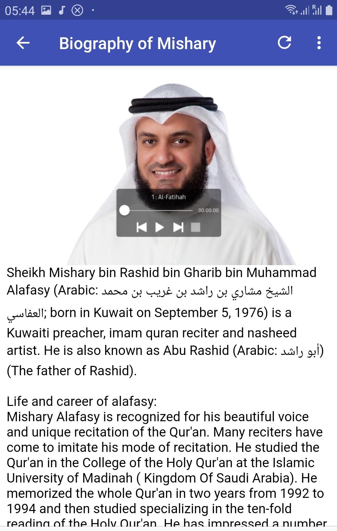 Assalamu alaikum, Esta aplicação é a recitação offline completa do Alcorão em mp3 do sheik Mishary Rashid Alafasy. Isso ocorre porque o Google aumentou o tamanho do APK que pode ser carregado para armazenar a loja em até 100MB, mas este aplicativo de mishary Rashid é inferior a 100mb. الشيخ مشاري العفاسي بدون نت Se você gosta deste offline Quran mishary rashid offline, considere deixar um comentário e / ou uma avaliação positivos na loja. Isso aumentará a posição do aplicativo e outros muçulmanos podem encontrar esse aplicativo mishary facilmente. قرأن كامل بصوت العفاسي بدون نت Resumo do recitador mishari Rashid: Seu nome completo: Sheikh Mishary bin Rashid bin Gharib bin Muhammad Alafasy (nascido em Kuwait em 5 de setembro de 1976) é um pregador do Kuwait, um artista de Alcorão imã e nasheed. Ele também é conhecido como Abu Rashid (em árabe: أبو راشد) (pai de Rashid). Vida e carreira de alafasy: Mishary Alafasy é reconhecido por sua bela voz e recitação única do Alcorão. Muitos recitadores passaram a imitar seu modo de recitação. Ele estudou o Alcorão no Colégio do Sagrado Alcorão na Universidade Islâmica de Madinah (Reino da Arábia Saudita). Ele memorizou o Alcorão inteiro em dois anos, de 1992 a 1994, e depois estudou especializando-se na leitura dez vezes do Alcorão Sagrado. Ele impressionou vários recitadores do Alcorão com sua recitação. Mishary Rashid - MP3 completo Alcorão offline Mishary Al Afasy é o imã da Grande Mesquita (Kuwait), e todo Ramadã ele lidera as orações de Taraweeh nesta mesquita. Ele muitas vezes lidera as orações de Taraweeh nos Emirados Árabes Unidos e em outros países vizinhos no Golfo Pérsico. Em 2007, ele visitou duas mesquitas nos Estados Unidos da América: o Centro Islâmico de Irvine (ICOI) na Califórnia e o Centro Islâmico de Detroit (ICD) em Michigan. Alafasy possui 2 canais espaciais especializados na recitação do Alcorão Sagrado, o primeiro é o Alafasy TV e o segundo é o Alafasy Q. Prêmios e reconhecimento: Em 25 de outubro de 2008, Mishary recebeu o primeiro Oscar da Criatividade Árabe pela União da Criatividade Árabe no Egito. O evento foi patrocinado pelo secretário-geral da Liga Árabe, Amr Moussa, como um reconhecimento do papel de Mishary Alafasy na promoção de princípios e ensinamentos islâmicos. Al-Afasy foi eleito pelos leitores como o Melhor Recitador do Alcorão no 2012 About.com Readers 'Choice Awards.