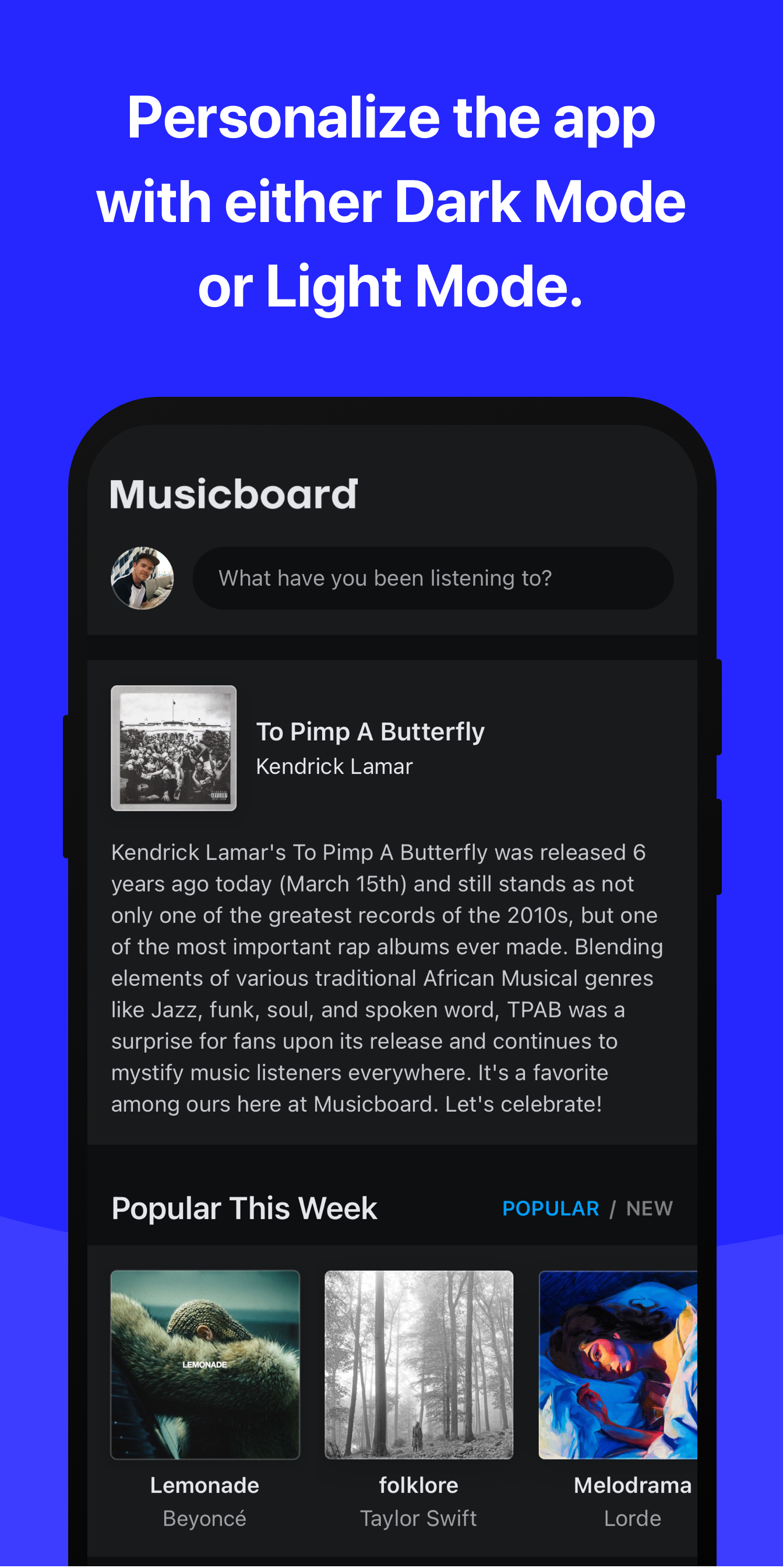 Dezenas de milhares já usam o Musicboard para compartilhar seus pensamentos e opiniões na música. Com uma combinação de classificações, resenhas e listas, seu perfil rapidamente se torna um centro central para sua vida na música.