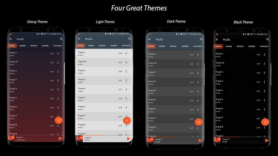 • Quatro grandes temas - Gloss Theme, Light Theme, Dark Theme e Black Theme.