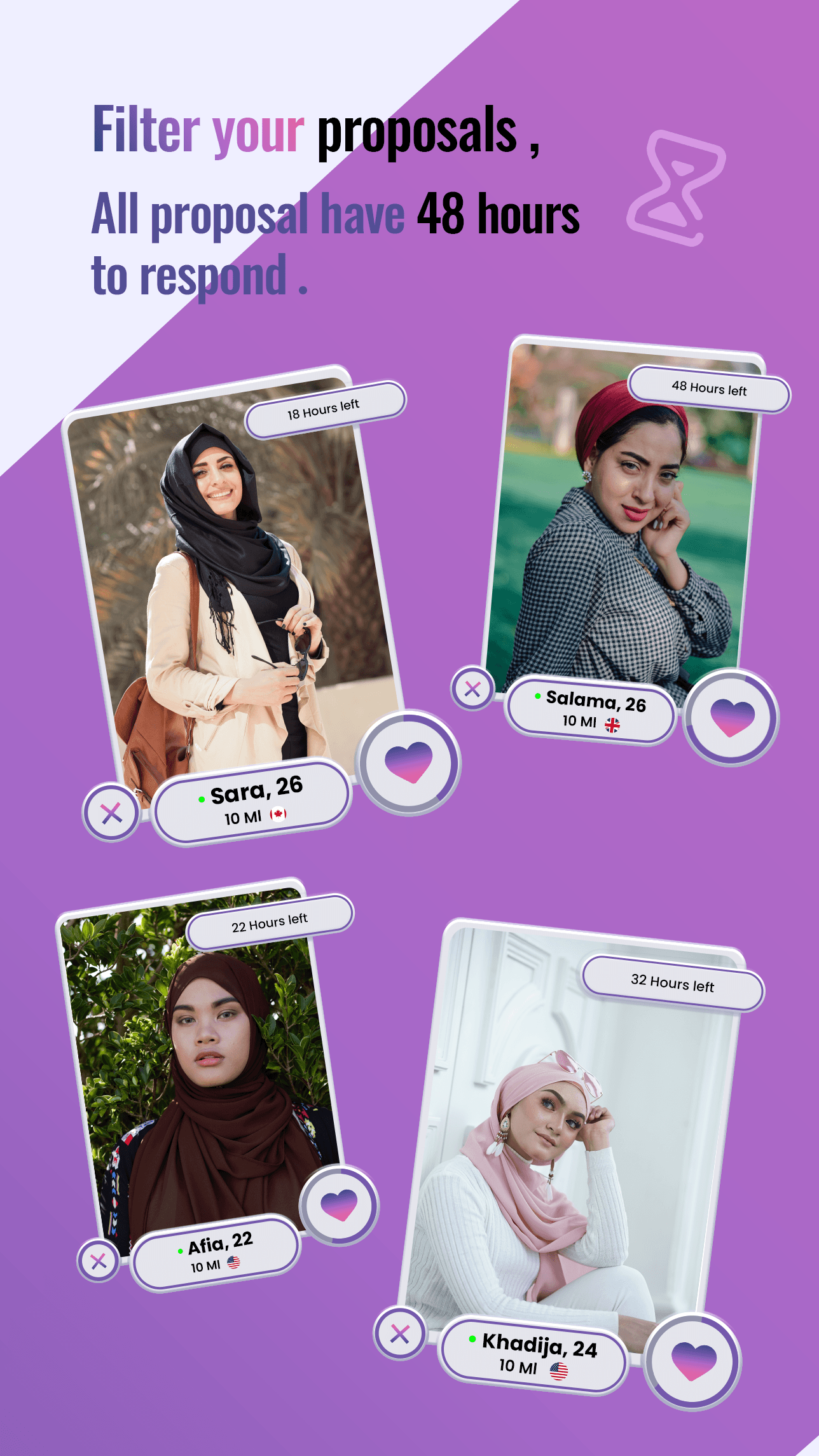 Proposal-Muslim Dating & Matchmaking Looking for your single Muslim partner? Tired of traditional Muslim dating apps in USA? Exhausted by endless swiping on halal dating apps and Muslim marriage apps? Salam & welcome to the world’s fastest growing and most interactive single Muslims marriage and halal dating app in USA. At Proposal, we do everything differently; we are the trend setter, leader, and change agent. Proposal-Halal Muslim dating app and Muslim marriage app is where your journey begins and ends on Nikah with everything in between. Download it today... and get married, Inshallah. We’ve reduced the halal dating process on our app. Our goal is to reduce the number of unwanted matches on our Muslim marriage and Muslim dating app. Proposal makes halal dating fast, easy, safe, and secure for single Muslims. We bring you and others out of the comfort zone. Unlike the prolonged halal dating app process on other free Muslim dating apps, we only show users based on your personality and interest. Fill out the compatibility test on our app & match your score with others for compatibility. Proposal is fast and simple to use - tap on heart to like or tap on cross to pass. Users who liked you appears your “Liked You” section where you have 48 hours to filter them. Once matched, you have 48 hours to start the conversation. Proposal-Muslim marriage app is time sensitive app where likes, matches, and messages expire after 48 hours so that you can connect with your Muslim partner. PROPOSAL-MUSLIM MARRIAGE APP HELPS YOU IN MANY WAYS: 🆕 1000s of new single Muslims find Muslim match & meet with other US single Muslims on Muslim marriage app every day, and 100s of successful Muslim halal dating app stories. 💬 All likes, matches, and messages are FREE on our halal free dating app as long as user responds within 48 hours. ⌛ Filter profiles based on your preferences on our single Muslim marriage app in 48 hours and select only those who you really like. ☑ Muslim dating profiles are verified by selfie, so rest assured that you only talk to real authentic users. 🔒 Take complete control of your privacy and who to share your profile with on our Muslim dating app. 🤓Find the ONE based on your compatibility on our halal dating app. 👨Invite a guardian into your chats to keep Islamic dating halal. 👵 Be your own matchmaker on the most needed Muslim dating app & enjoy the process on your own. 🎉 Experience PROPOSALIRL (in real life) events near you. So, Let’s get started, whether you are looking for a US Muslim dating app, Muslim marriage app or Nikah app, Download Proposal to sign up… and get married today, Inshallah. Proposal is the US fastest growing and interactive halal dating app free, marriage app free & chatting app. Proposal is free to download & use, and that will never change for our main features. However, if you are looking to give your profile a boost and want to get married faster, you can subscribe to Proposal premium. Proposal premium offers many features that can help you find your partner. Full details can be found in our app! Please note if you decide to subscribe to Proposal premium: - Prices are clearly displayed in the app. Prices may vary per country. - Payment will be charged to your Google Play Store account at confirmation of purchase. - Your subscription will automatically renew itself unless auto-renewal is turned off at least 24 hours before the end of the current period. - You can manage your subscriptions and turn off auto-renewal by going to your account under Payments and subscriptions. PRIVACY Your privacy is very important to us, and we assure you that we do not post to your social media page. We do not share your personal information with other parties in any way. You may delete your Proposal account at any time. ----------------------------------------------------- Privacy- https://www.proposalapp.co/privacy-policy Terms- https://www.proposalapp.co/terms-and-conditions