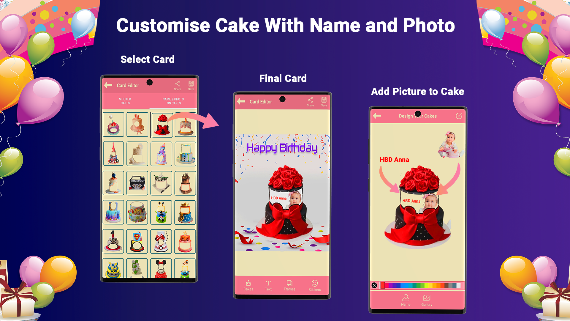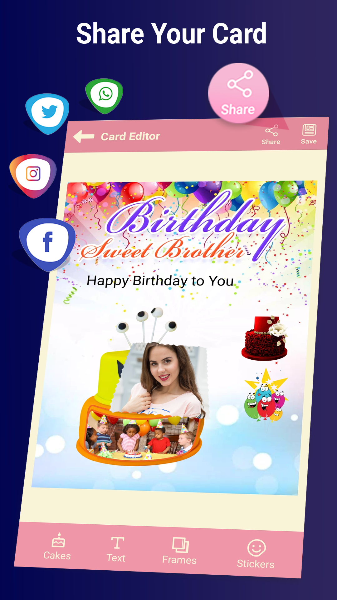 Encontre cartões de feliz aniversário fofos e emocionantes que você pode compartilhar com seus amigos e familiares no aniversário deles! Coloque a foto do aniversariante em cartões e adicione texto ou um nome. Basta editar o nome com suporte a cores e fontes. Você pode enviar desejos e cartões de aniversário. Você pode salvar cartões e desejos no desejo de cartões e mensagens de aniversário e enviá-los facilmente para várias pessoas.