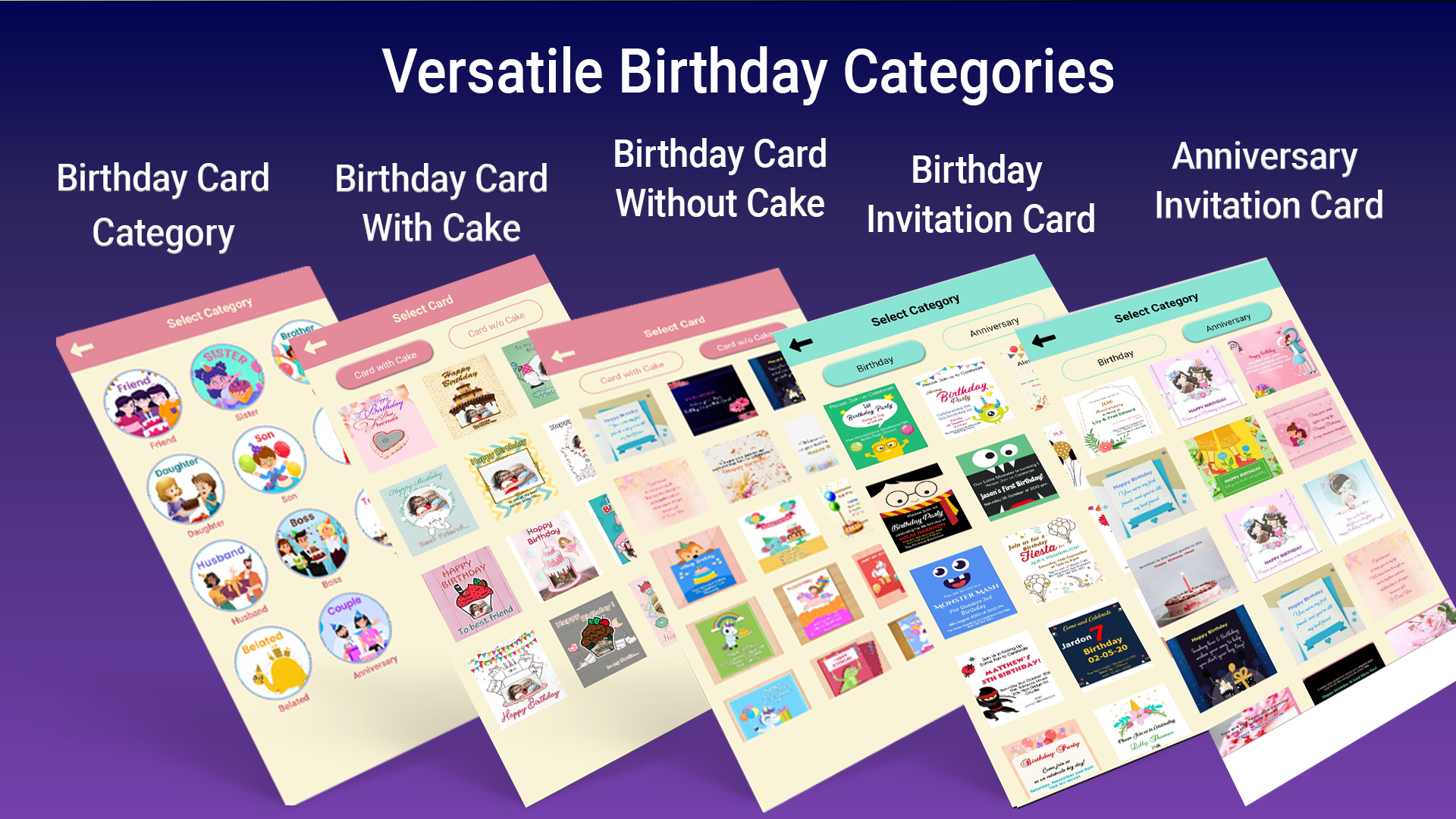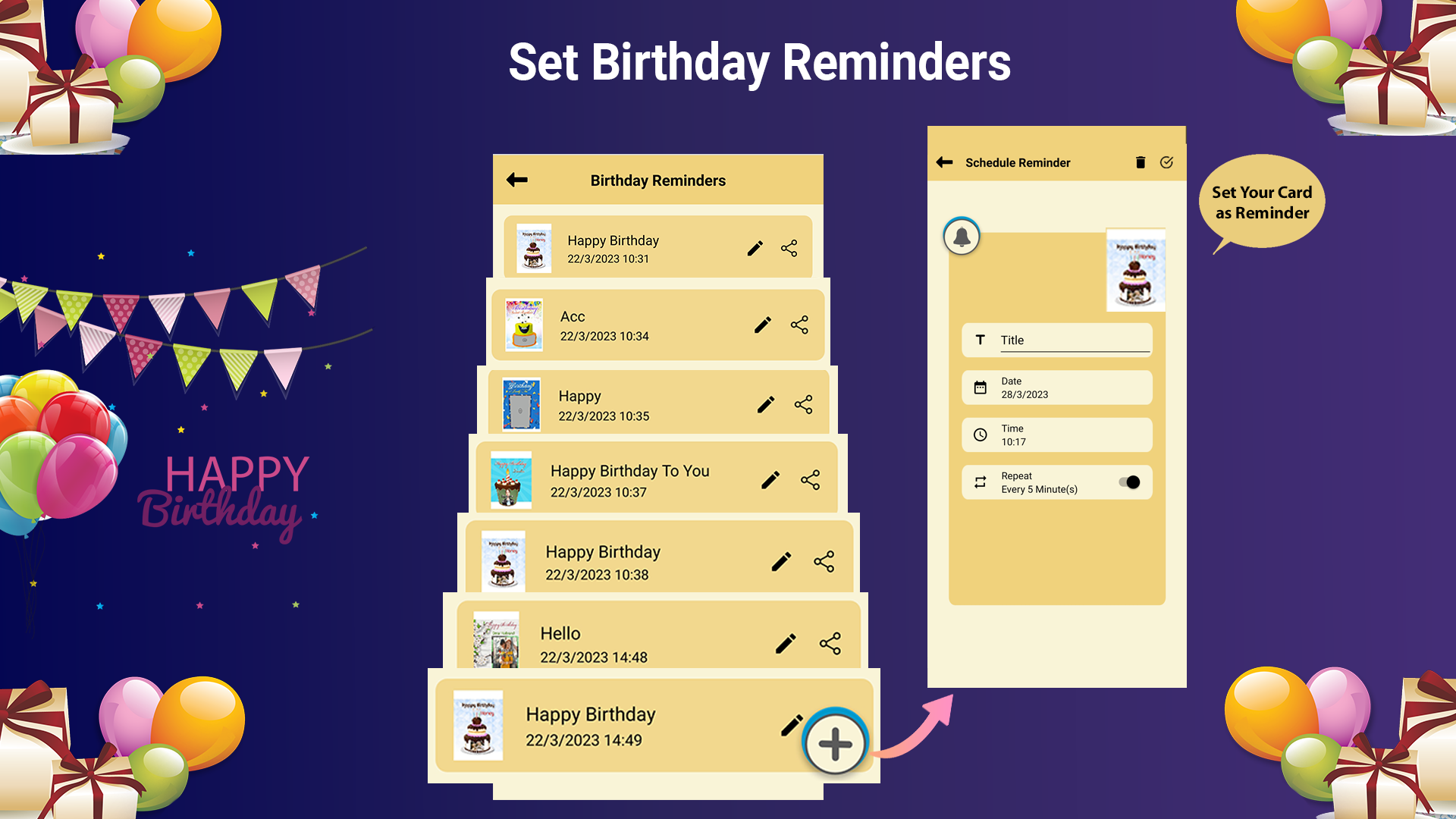 Você está procurando ideias únicas para comemorar o aniversário de seus entes queridos? Em caso afirmativo, pare de fazer brainstorming por causa deste aplicativo de editor de fotos de aniversário, que ajuda você a tornar seus aniversários especiais e lembranças. Suponhamos que se você mora no exterior, mas deseja desejar aniversário sem esquecer a data do aniversário, nesse caso, você tem a melhor ferramenta para tornar o aniversário memorável com cartões de aniversário personalizados com lembrete de aniversário. Você pode escolher seu cartão de aniversário ou cartão de convite favorito da categoria e editar esse cartão com várias ferramentas de edição avançadas. Você pode Lembrete especificamente para aniversários, aniversários e eventos gerais também. Do que você tem lista de músicas de aniversário, você pode compartilhar músicas de feliz aniversário para seus amigos e familiares a partir desta lista de reprodução.