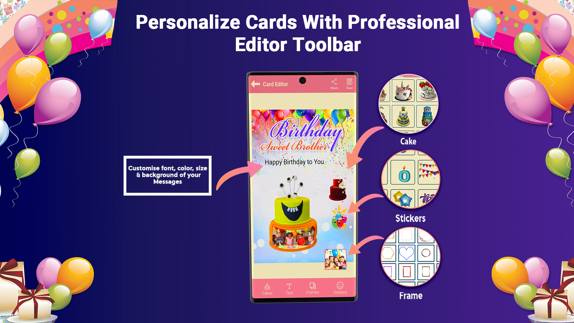 Melhore a qualidade da criação usando ferramentas de edição com tecnologia AI para aprimorar cartões e molduras com melhor cor e contraste. Use sobreposições, aplique desfoque, texto, corte, gire molduras de aniversário para edição de fotos, adesivos felizes como balões, bolos, estrelas, coração, contagem regressiva de presentes e. Por último, mas não menos importante, você também pode tirar uma foto para a galeria e editá-la. Compartilhe sua criação com sua família, amigos e salve o cartão no Álbum para que você possa enviar quando receber um lembrete.