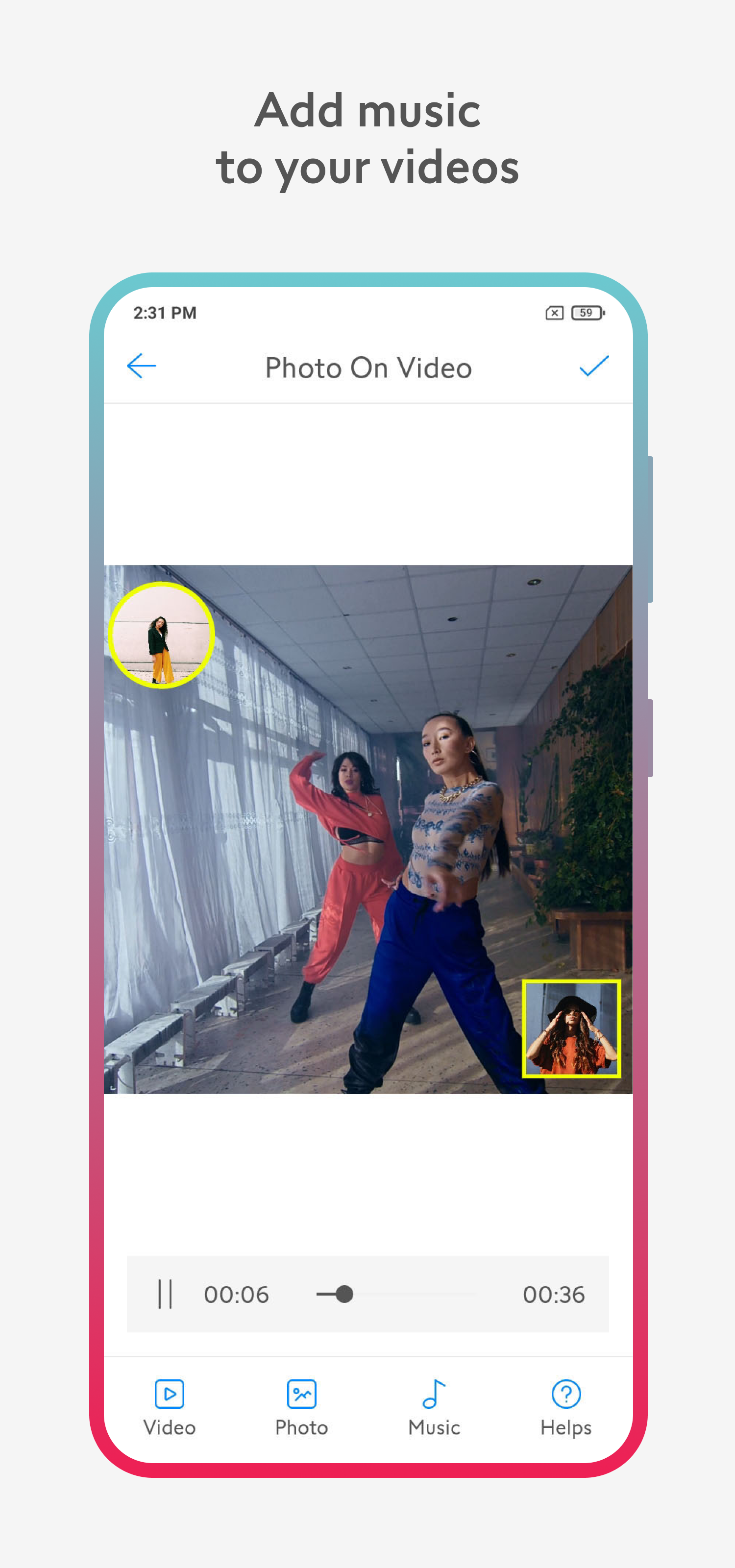 Este aplicativo ajuda você a inserir várias imagens em vídeos com facilidade e rapidez. Você pode escolher uma variedade de imagens, audios e fazer um vídeo personalizado incrível para compartilhar com seus amigos e familiares. Basta selecionar um vídeo da sua galeria, em seguida, adicione foto ao vídeo e termine. Além disso, você pode adicionar foto em várias partes do mesmo vídeo. Visualize e salve seu novo vídeo sem perder qualidade de vídeo. Principais características: - Fácil e rápido para inserir fotos em vídeos. - Adicione imagens ilimitadas aos vídeos. - Faça cópias de imagens já adicionadas (foto duplicada). - Selecione o tempo de exibição para cada imagem. - Imagens de colheita com várias proporções. - Gire, reposicione e amplie a imagem para que seja perfeita. - Remova o fundo das imagens (faça o fundo da foto transparente). - Altere os efeitos da cor para tornar as imagens mais bonitas. - Altere a opacidade para imagens. - Mude a forma para imagens (círculo, quadrado, triângulo, etc). - Altere a cor e o tamanho para a borda da imagem. - Vire a imagem horizontalmente, vira a imagem verticalmente. - Alinhe a imagem para o centro. - Mantenha a proporção original da imagem. - Insira a música no seu vídeo. - Corte sua música favorita em músicas. - Suporta todos os formatos de vídeo e áudio. - Visualize seu novo vídeo antes de salvá-lo. - Processamento rápido e saída de alta qualidade. - Interface de usuário simples fácil de usá-lo. Com este aplicativo, você pode: - inserir imagem em vídeo - Inserir o logotipo em vídeo. - Adicione a marca d'água em vídeos. - Adicione a marca d'água em um vídeos de peça. Como usar? - Selecione qualquer vídeo da sua galeria. - basta simplesmente adicionar foto como por sua escolha. - Alterar o tamanho da foto, forma, fronteira, ... - Também você pode inserir música em vídeos. - Salve o vídeo na sua galeria do telefone. - Compartilhe em muitas plataformas de mídia social. Depois de criar o vídeo desejado, você pode compartilhá-lo para Tiktok, YouTube, Facebook, Instagram, Twitter e todas as outras plataformas de redes sociais. Você gosta deste aplicativo? Por favor, deixe suas revisões e sugestões, isso nos ajudará a tornar este aplicativo melhor nas próximas versões! Obrigado!