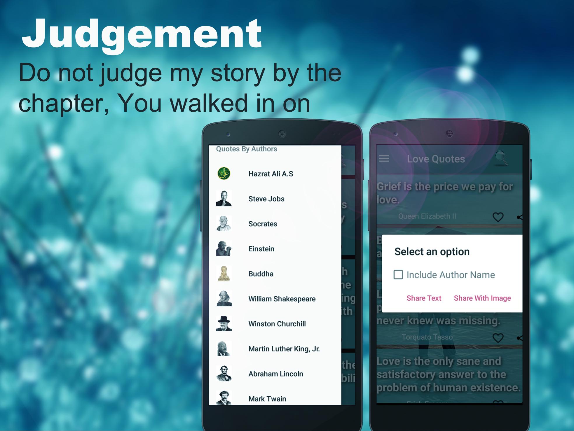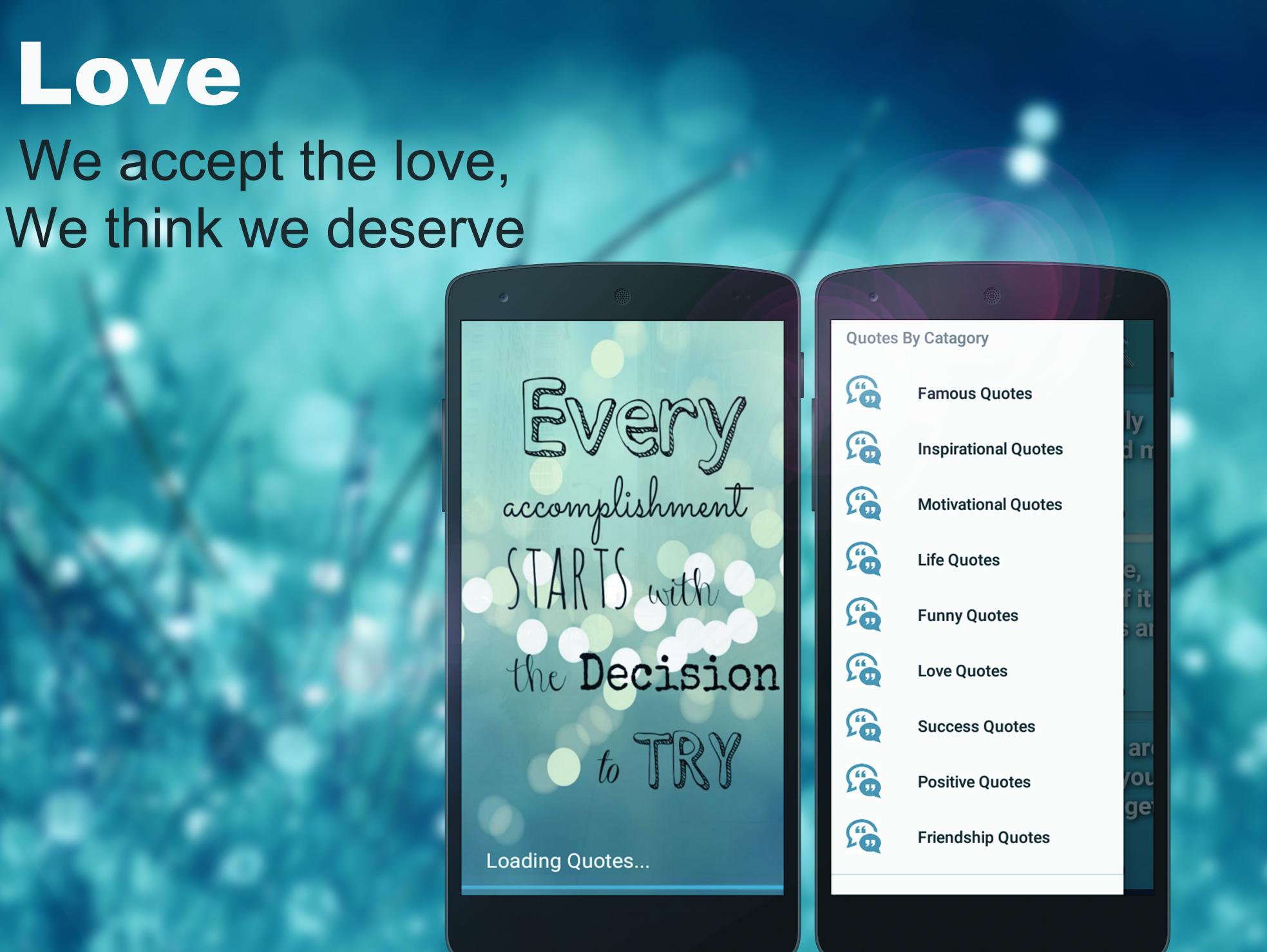 Picture Quotes Creator is complete text editor which has lot of edit options such as text size, cool fonts, font color photo makeup. The app has all the popular and most used fonts, colors and styling options for that. Quotes Creator module allows you to create an image with quote written on it. So you can add photo albums, wedding photo albums and more than one text to the background image, you can add other images to the background image and also you can add blank background image for quotes and quote of the day desktop gadget. You can also change the background of the quote. This app has some of the great background that suits your quote. You can also add your own background from gallery. Having Picture Quotes creator, you're having an encyclopedia containing tons of amazing quotes in different categories such as Inspirational, Success, Love, Life, Advice, Funny, Friendship, Hope, AND MANY MORE. By using this app will be no longer to find the amazing quotes with attracting and suitable images related to quotes. Photo Quotes creator are one of the tools you can use to regain that focus you need to accomplish your life goals. Create a photo quotes daughters that are wonderful moms, and create social media cover photo quotes about love. You don't waste too much time reading them and they are effective. We provide photo quotes love, photo quotes for friends, photo quote about life, photo quotes couple, photo quotes girls, photo quotes gym, photo quotes happy birthday, photo quotes on life, visual quote maker and inspirational, motivational, funny and love quotes by authors. So, you can put your own background on this quotes. All languages are supported. Writers on Photo Quotes creator are writing poetry and quotes together in many languages including English, Hindi, Urdu, French, German, Spanish and many more. Features: - Beautiful and User friendly design. - Set amazing background from gallery and put your precious words on picture and share with world. - Choose backgrounds from high quality background collections - 55+ Amazing in built fonts and background templates. - You can set Font colors and Size. - Customize your Inspiring words – font size, color, alignment, position & line spacing - Use clever caption generator - you can give photo effects like Blur, Brightness, Saturation, Contrast and Colors to your background. - You can set Shadow in text - Background Color you can set your favorite color as a background - Share with Instagram, Facebook, Twitter, WhatsApp and other apps. - 100+ unique and creative font choices - You can Choose backgrounds from high quality background collections. - You can save your own template - Manage template: Put your favorite template first. - Choose fantastic quotes randomly - Extensive collection of quotations by famous authors Photo Quotes Creator Having Some Main category Such as; - Photo Quotes For Friends - Photo quotes from kids - Photo quotes for volunteers - photo quotes couples - photo quotes Christmas - Funny Quotes with Images - Fitness quote - Motivational quotes - Love Picture Quotes - Birthday Picture Quotes - Photo Quotes about Lying - Photo Quotes About Dads - Photo Quotes about lions - Quotes about Mom - Photo quotes about Class - Photo quotes death in a moment - Photo Quotes about gym - Photo quotes about girls - Photo quotes about gratitude - Photo quotes for goodbyes - Photo quotes for promotion - photo quotes for Monday - photo quotes good night - photo quotes cute - photo quotes comedy - photo courtesy quotes Download it today and create own quotes, and Inspire the world with your words.