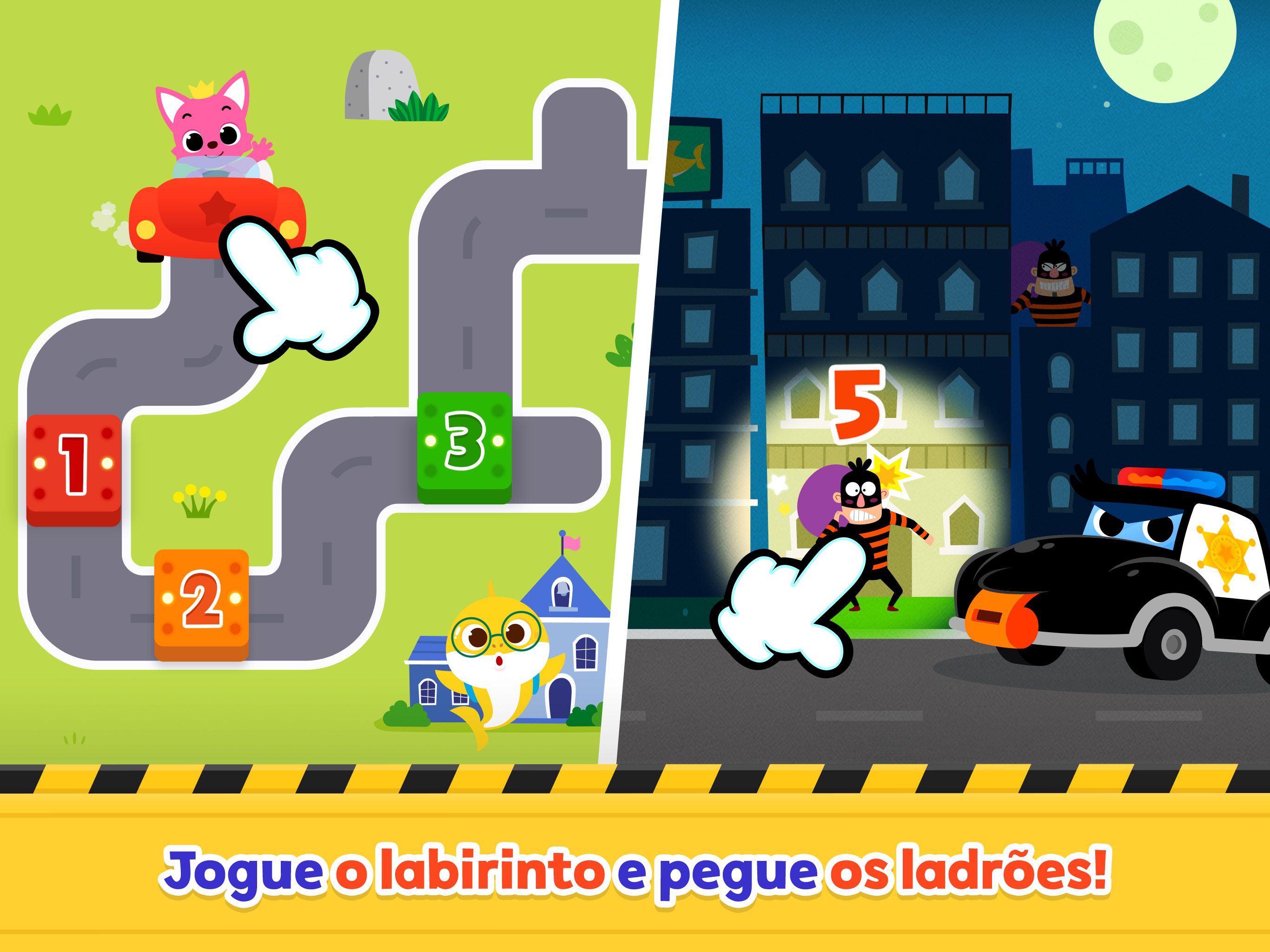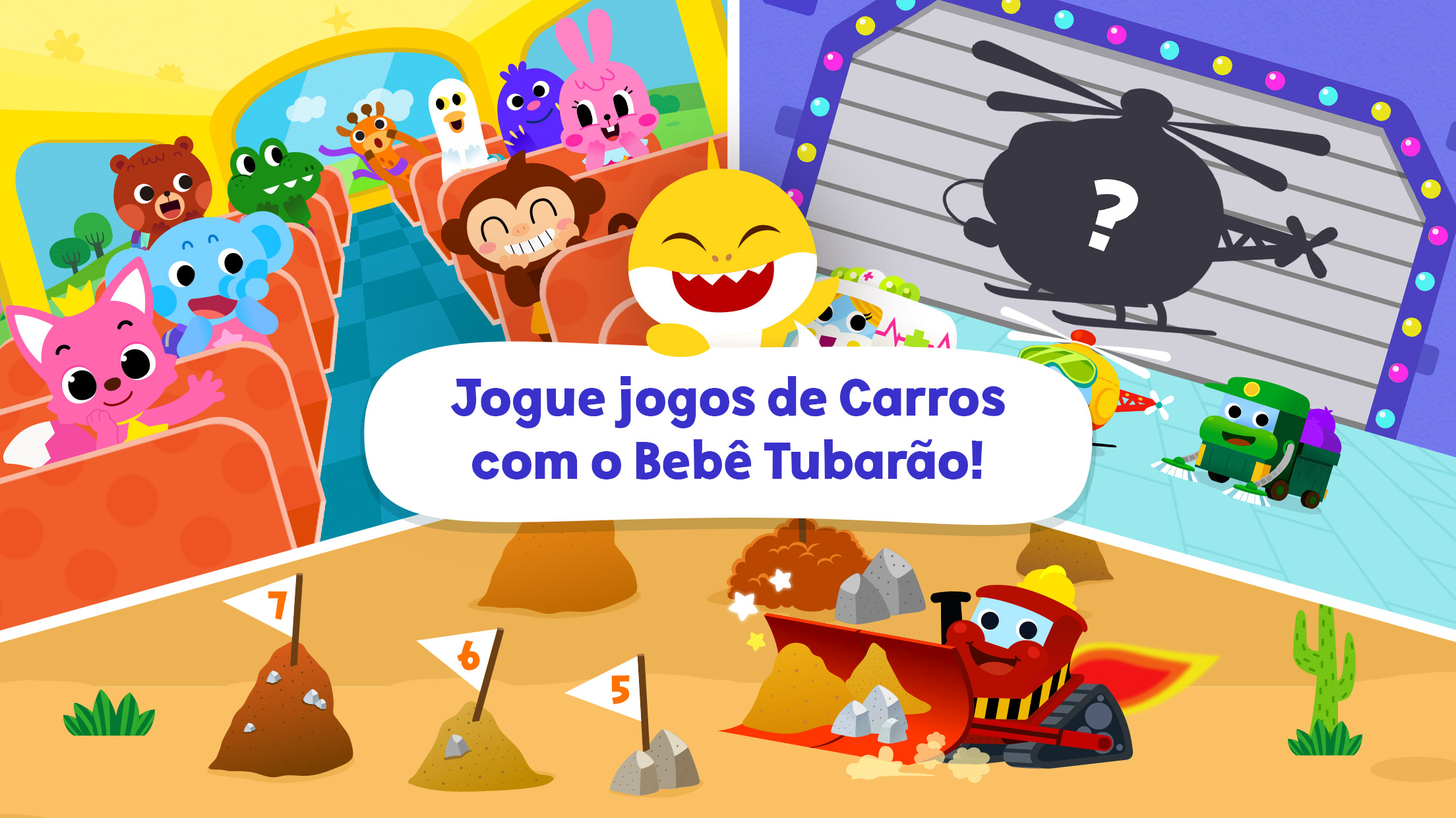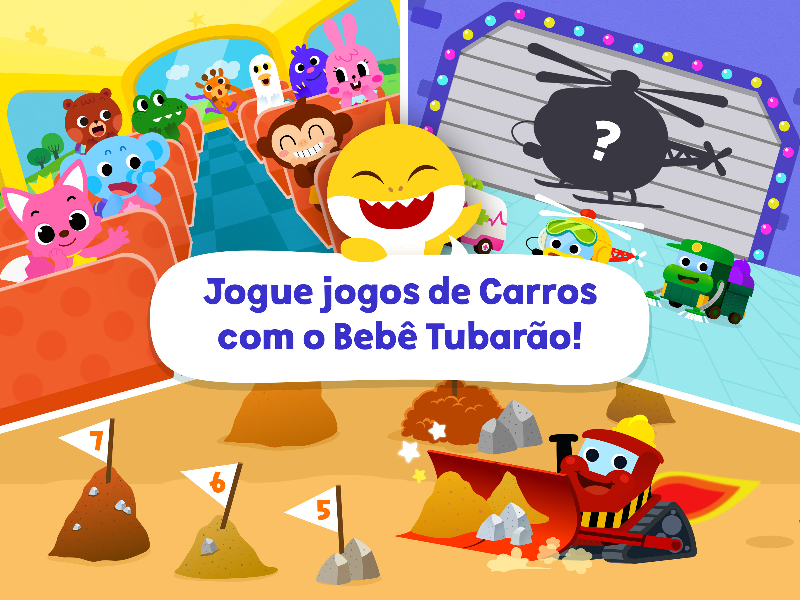 Jogue jogos de corrida para crianças, monte quebra-cabeças e resolva o labirinto no recém-desenvolvido "Bebê Tubarão Cidade dos Carros"! Qual é o seu carro favorito? O carro de Polícia? Ambulância? Caminhão Monstro? Ou o Melicóptero? Venha brincar com todos eles! CARROS DE POLÍCIA E CAMINHÕES DE BOMBEIRO: Proteja a cidade! - Uma urgência! Escolha um carro para manter a segurança da cidade. - Use o carro de polícia para pegar os ladrões e dirigir pela cidade. - Dirija o caminhão de bombeiros para apagar o fogo. AMBULÂNCIA E HELICÓPTEROS: Corra para o resgate! - Socorro! Dirija a ambulância ou o helicóptero para resgatar amigos que precisam de ajuda! - Limpe cada carro e descubra os nomes deles! - Lave e pinte os carros e incentive sua curiosidade! CAMINHÕES MONSTROS: Somos Super Mega Fortes! - Qual é o nome e a função do carro que consegue cavar fundo no chão? Jogue jogos de perguntas! - Siga os números e cave o chão com o caminhão monstro. - Aprenda suas características com jogos infantis divertidos. CAMINHÕES DE ENTREGA E DE LIXO: Melhore a Comunidade! - Sua entrega está aqui! Ajude o carro a entregar as caixas aos nossos vizinhos. - Limpe a cidade e melhore o meio ambiente com o caminhão de lixo. - Aprenda as funções dos melhores amigos da nossa comunidade! ÔNIBUS ESCOLAR: Leve-nos a qualquer lugar! - Conte o número de amigos no ônibus escolar antes de partir. Aprenda os números de 1 a 10 ao mesmo tempo! - Siga os números na estrada com o super carro do Pinkfong! Jogue jogos de números! - Desenvolva habilidades motoras e sua criatividade com divertidos jogos de colorir. CANÇÕES DE RIMA - Assista aos 18 melhores vídeos animados do Pinkfong com os diferentes tipos de carros. - Cante junto com rimas populares e aprenda as características de diferentes carros naturalmente. - Todo o conteúdo está disponível em português, inglês, espanhol, coreano, chinês, japonês e russo. *Bebê Tubarão Cidade dos Carros é um aplicativo interativo repleto de divertidos jogos de carros para crianças na pré-escola. - Um Mundo de Brincadeira + Aprendizagem - Descubra uma assinatura premium para crianças projetada com a experiência única do Pinkfong! • Site oficial : https://fong.kr/pinkfongplus/ • O que há de bom no Pinkfong Plus: 1. Mais de 30 aplicativos com temas e níveis diferentes para cada etapa do desenvolvimento infantil! 2. Jogo interativo e conteúdo educacional que permite o aprendizado autodirigido! 3. Desbloqueie todo o conteúdo premium 4. Bloqueie anúncios inseguros e conteúdo impróprio 5. Conteúdo original exclusivo do Pinkfong Plus disponível apenas para membros! 6. Conecte-se a vários dispositivos, como smartphones, tablets e smart TVs 7. Certificado por professores e organizações profissionais! • Aplicativos ilimitados disponíveis com Pinkfong Plus: - Mundo Bebê Tubarão pra Criança,Aniversário do Bebefinn,Baby Shark em Inglês, Bebefinn Brincar de Celular, Baby Shark Jogo de Dentista, Baby Shark Vestir Princesas, Baby Shark Jogo de Culinária, Bebefinn, Cuidando do Bebê, Baby Shark Jogo do Hospital, Baby Shark Tacos e Sanduíches, Baby Shark Jogo de Doces, Pinkfong Bebê Tubarão, Bebê Tubarão Jogo de Pizza, Pinkfong Baby Shark Phone, Pinkfong Formas e Cores, Pinkfong Mundo Dino, Pinkfong Tracing World, Livro de Colorir Bebê Tubarão, Bebê Tubarão Quebra-cabeça, Bebê Tubarão ABC Phonics, Baby Shark Jogo de Makeover, Meu Corpo da Pinkfong, Bebê Tubarão Cidade de Carros, Pinkfong Números 123, Pinkfong Adivinhe o Animal, Pinkfong Numbers Zoo, , Pinkfong Learn Korean + more! - Mais aplicativos disponíveis serão atualizados em breve. - Clique no botão "More Apps" na tela principal de cada aplicativo ou pesquise o aplicativo no Google Play! - Privacy Policy: https://pid.pinkfong.com/terms?type=privacy-policy Terms of Use of Pinkfong Integrated Services: https://pid.pinkfong.com/terms?type=terms-and-conditions Terms of Use of Pinkfong Interactive App: https://pid.pinkfong.com/terms?type=interactive-terms-and-conditions