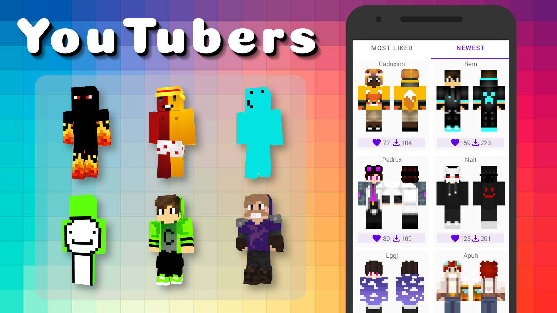 Principais recursos de "Skins para Minecraft": Vasta Seleção de Skins para Minecraft: Orgulhamo-nos da nossa vasta coleção projetada para atender às necessidades de todos os jogadores. Dentro do nosso aplicativo, você encontrará skin de minecraft masculino, skin de minecraft feminina, fofas, kawaii e skin de anime. Isso permite que todos descubram o visual perfeito que reflita o estilo de jogo deles. YouTubers Populares: Nossa coleção também inclui skins de YouTubers populares que se tornaram queridos por milhões de fãs. Entre eles estão Athos, Problems, Geleia, Cadres, Tonigon, Brizinhu, Mendrake, Ligonz, Onerb, Fixz, chip, Pedrux, Nait, Marcelodrv, Smartiel, Robin Hood Gamer, TazerCraft, Batatinha, JuliaMineGirl, Forever. Agora você pode fazer parte do mundo deles jogando como personagens que se tornaram lendas na comunidade de jogos. Instalação Fácil: A instalação no jogo nunca foi tão fácil! Nosso aplicativo oferece um processo simples e intuitivamente compreensível para aplicar skins ao seu personagem. Apenas alguns cliques e você está pronto para desfrutar do novo visual no Minecraft. Prévias: Antes de tomar uma decisão final, oferecemos a você a capacidade de visualizar as skin no seu personagem. Isso permite que você veja como ela ficará no jogo, ajudando você a fazer a escolha certa. Seleção de Categoria Conveniente: Para agilizar sua busca e encontrar a skin perfeita para o seu estilo de jogo, dividimos as skins em categorias convenientes. Você pode alternar facilmente entre skins para meninos, meninas, fofas, kawaii e skins de anime para encontrar rapidamente a variante que mais lhe convém. Atualizações Regulares: Nossa equipe trabalha constantemente na expansão da coleção de skins para oferecer novas opções e frescor. Mantemo-nos atualizados com as últimas tendências e atualizamos constantemente nossa biblioteca para mantê-lo informado sobre as skin mais atuais e estilosas. Favoritos para Acesso Fácil: Se você tem skin favoritas que deseja salvar para uso futuro, nosso aplicativo permite que você as marque facilmente. Isso garante conveniência e acesso rápido aos seus looks preferidos. "Skins para Minecraft" é mais do que apenas um aplicativo; é uma fonte de inspiração e criatividade que capacita você a transformar seu personagem em um herói verdadeiramente único. Seja você um jogador experiente ou um iniciante, nosso aplicativo tornará sua experiência de jogo ainda mais vibrante e emocionante. Expresse-se criando seu estilo distinto e transformando seu personagem em uma lenda no universo do Minecraft! Aviso Legal: Este aplicativo "Skins para Minecraft" não está de forma alguma conectado à Mojang AB. Todos os direitos reservados. De acordo com http://account.mojang.com/documents/brand_guidelines.