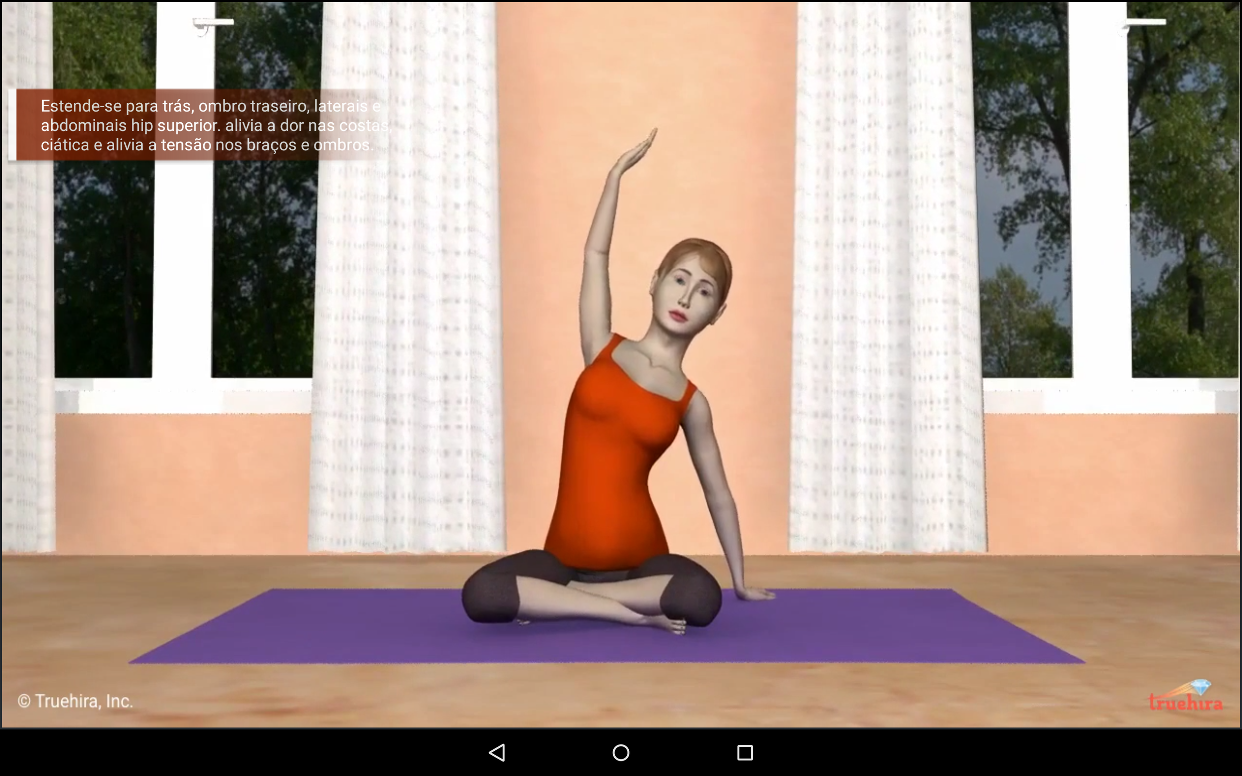 * Cada pose de ioga é detalhado com vídeo, realizando instruções, benefícios e precauções.
