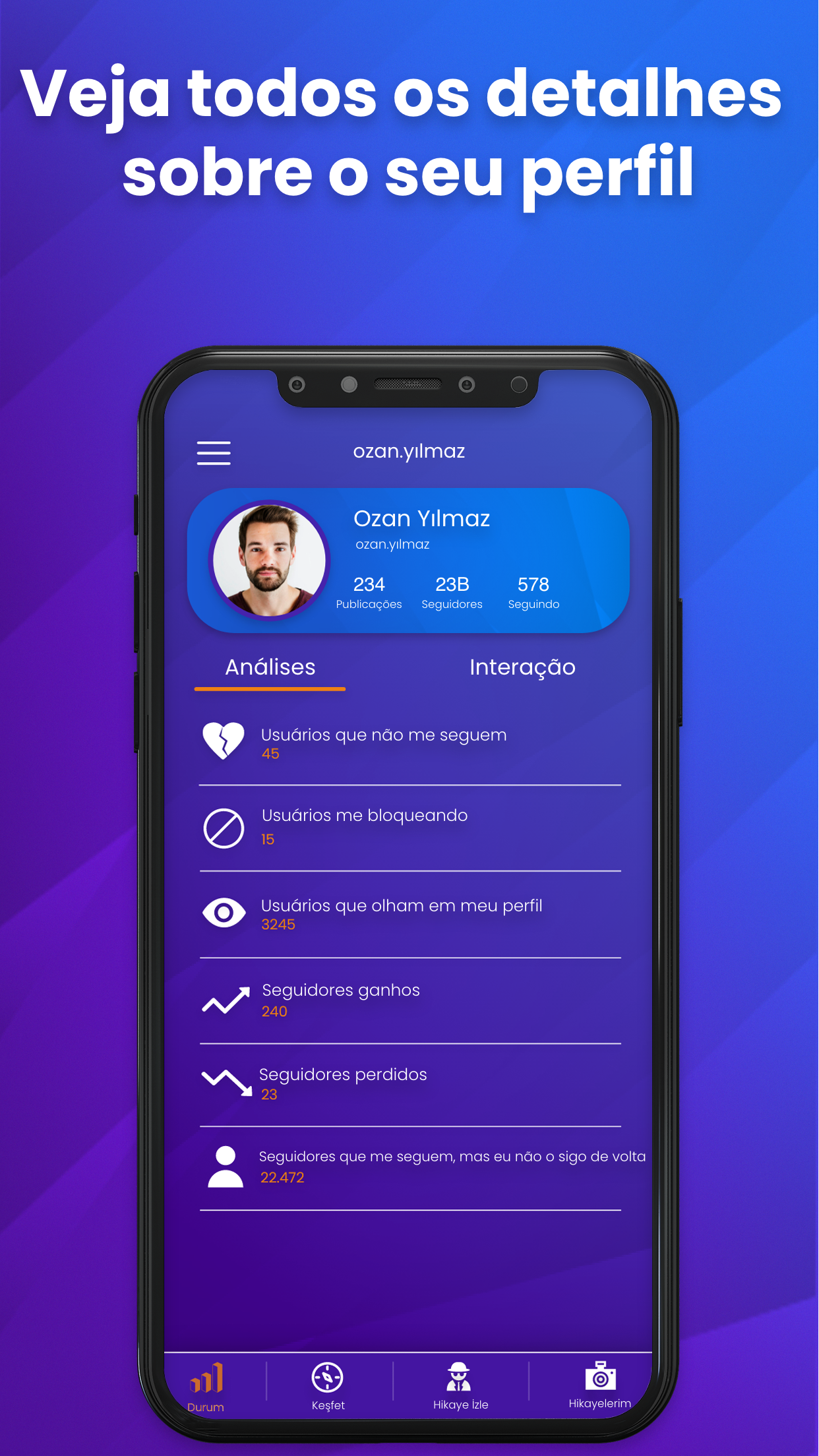 Acesse as estatísticas de sua atividade de mídia social imediatamente com o aplicativo Profile Pro - Seguidores no Instagram e Análise de Histórias. Profile Pro - Recursos do aplicativo para seguidores do Instagram e análise de histórias Você pode revisar a eficácia de sua conta e tomar medidas para aumentar as interações com os seguidores. 1- Análise Graças ao aplicativo de análise do Instagram, você pode ver instantaneamente quem não segue você de volta, as contas que o bloqueiam, os seguidores que você ganhou, bem como os seguidores que você perdeu, os seguidores que você não segue e examiná-los um por um. Com o aplicativo de análise de seguidores, você também pode conhecer as contas visualizando seu perfil com um único clique. Você pode ver imediatamente todas as fotos e vídeos que compartilhou, comentou, gostou e perdeu em sua conta, bem como ver suas próprias postagens imediatamente. Dessa forma, você pode comparar as postagens mais interativas de outras páginas com as suas. Graças ao programa de análise de seguidores do Instagram, você pode ver facilmente as interações de seus seguidores com seu perfil com parâmetros como comentários por postagem e curtidas por postagem. Todos nós temos seguidores que ficam nos porões de nossa lista de acompanhamento, que todos seguimos em um momento e esquecemos depois e às vezes porque eles não aparecem em nossa homepage. Nesses casos, você pode ver facilmente seus seguidores que não interagem com você na forma de curtidas ou comentários de nenhuma forma e removê-los da sua lista de seguidores. Você também pode ver quem lhe deu mais comentários e curtidas. Da mesma forma, você pode ver suas postagens com mais curtidas e comentários. Assim, você pode aumentar a interação do seguidor com postagens e postagens semelhantes. Você também pode fazer várias inferências sobre sua conta ou seus seguidores, aproveitando a capacidade de nosso aplicativo de visualizar quem exclui curtidas e comentários. 2- Descubra Nesta seção, você pode filtrar suas postagens com base em hashtags e acessar imediatamente a postagem que está procurando. 3- Assistir à história Como uma conta anônima, você pode acompanhar as histórias de seus seguidores com nosso programa de análise de seguidores. Aqui, sua identidade permanece confidencial e nenhuma notificação é enviada à outra parte. 4- Minhas histórias Você pode encontrar os melhores detalhes das histórias que compartilha em sua conta pessoal ou corporativa aqui: Aqui você pode ver instantaneamente quem não acompanhou suas histórias mais recentes, quem assistiu mais e quem assistiu menos. No entanto, você pode analisar as histórias mais assistidas, mais antigas e menos assistidas entre as histórias que você fez no passado. Você pode ver facilmente quem não segue suas histórias, quem assiste mais, quem assiste menos e quem você não segue, e pode aumentar sua atividade no aplicativo de mídia social Instagram acessando dados estatísticos. 5- Repost Quando quiser repassar uma postagem no Instagram, basta copiar o link. Você pode facilmente repassar com o aplicativo Profile Pro - Seguidores do Instagram e Análise de História. Por que você deve usar o aplicativo Profile Pro - Seguidores do Instagram e Análise de histórias? A mídia social se tornou parte de nossas vidas hoje. Entre eles, é o aplicativo de mídia social mais utilizado, com mais de 1,5 bilhão de usuários no Instagram. Todos desejam obter um alto nível de interação nas postagens feitas pessoalmente ou de contas corporativas ou corporativas. A maneira mais fácil de fazer isso é analisar a conta com o aplicativo de análise de seguidor e compartilhar os gostos dos seguidores. Se você quiser aumentar sua eficácia nas redes sociais, baixe o aplicativo Profile Pro - Seguidores no Instagram e Análise de histórias e experimente.