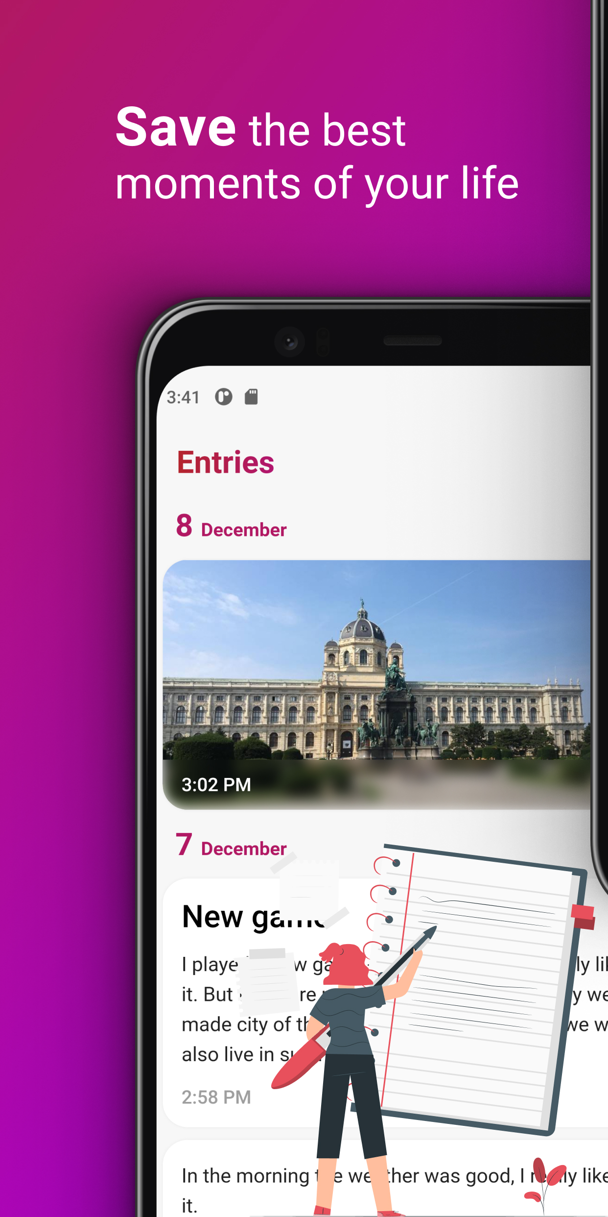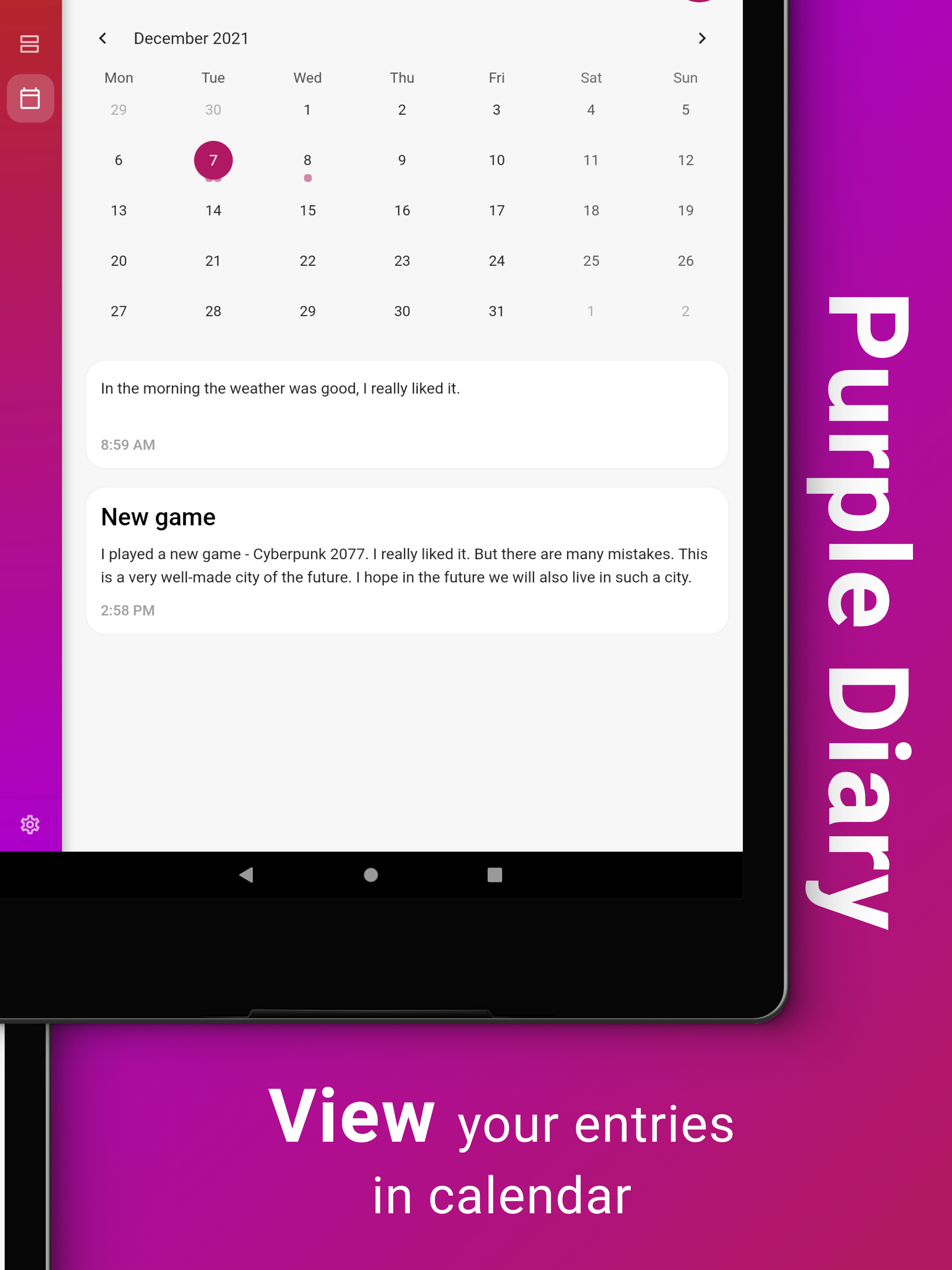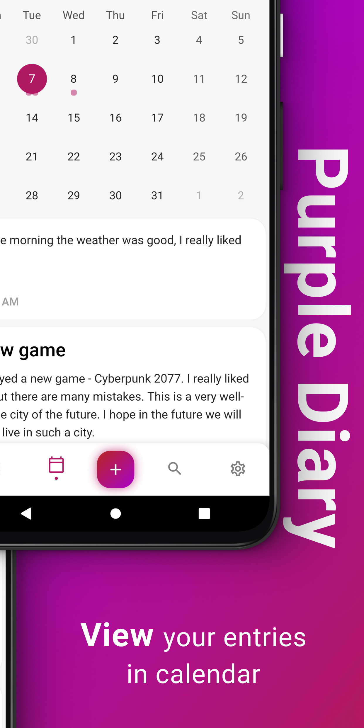 O Purple Diary é um aplicativo de diário pessoal lindamente projetado que permite que você registre e reflita facilmente sobre seus pensamentos e experiências. Com sua interface intuitiva e rico conjunto de recursos, o Purple Diary simplifica a captura dos momentos importantes para você, seja anotando eventos diários, monitorando seu humor ou usando-o como uma ferramenta para autocuidado e crescimento pessoal. Com proteção por senha e a capacidade de adicionar fotos, o Purple Diary oferece um espaço seguro e privado para escrever e se expressar. Experimente o Purple Diary hoje e comece a explorar seu mundo interior de uma maneira totalmente nova. Também disponível no Wear OS.