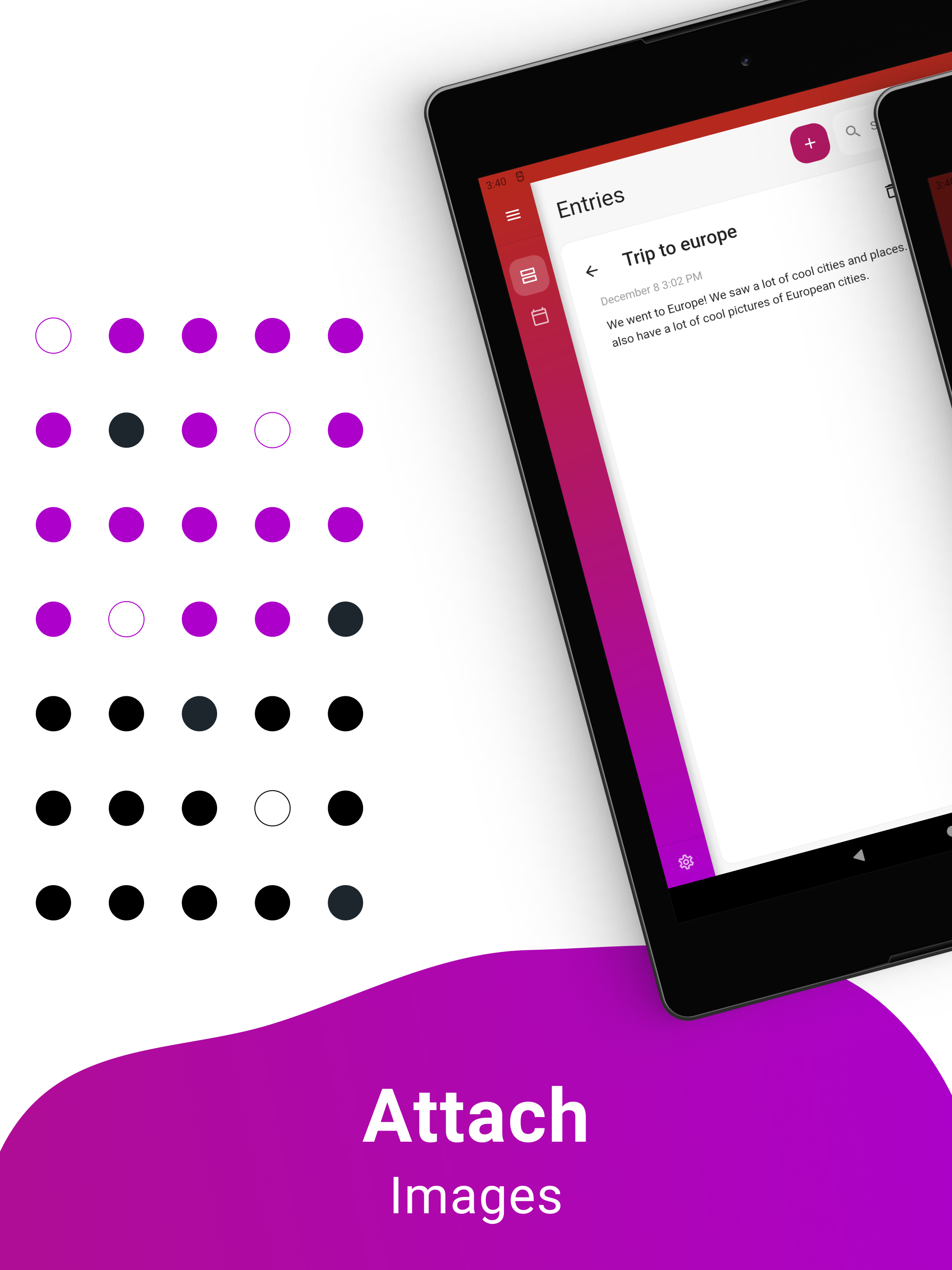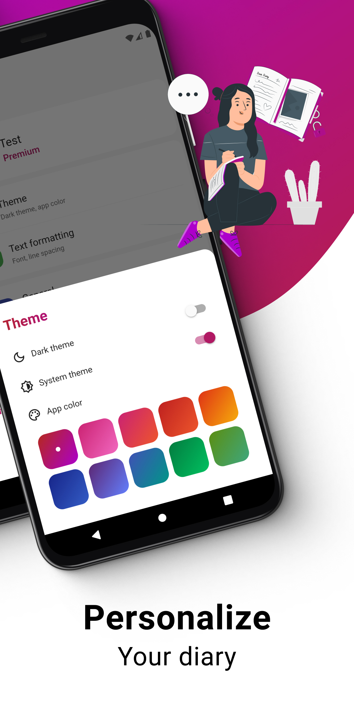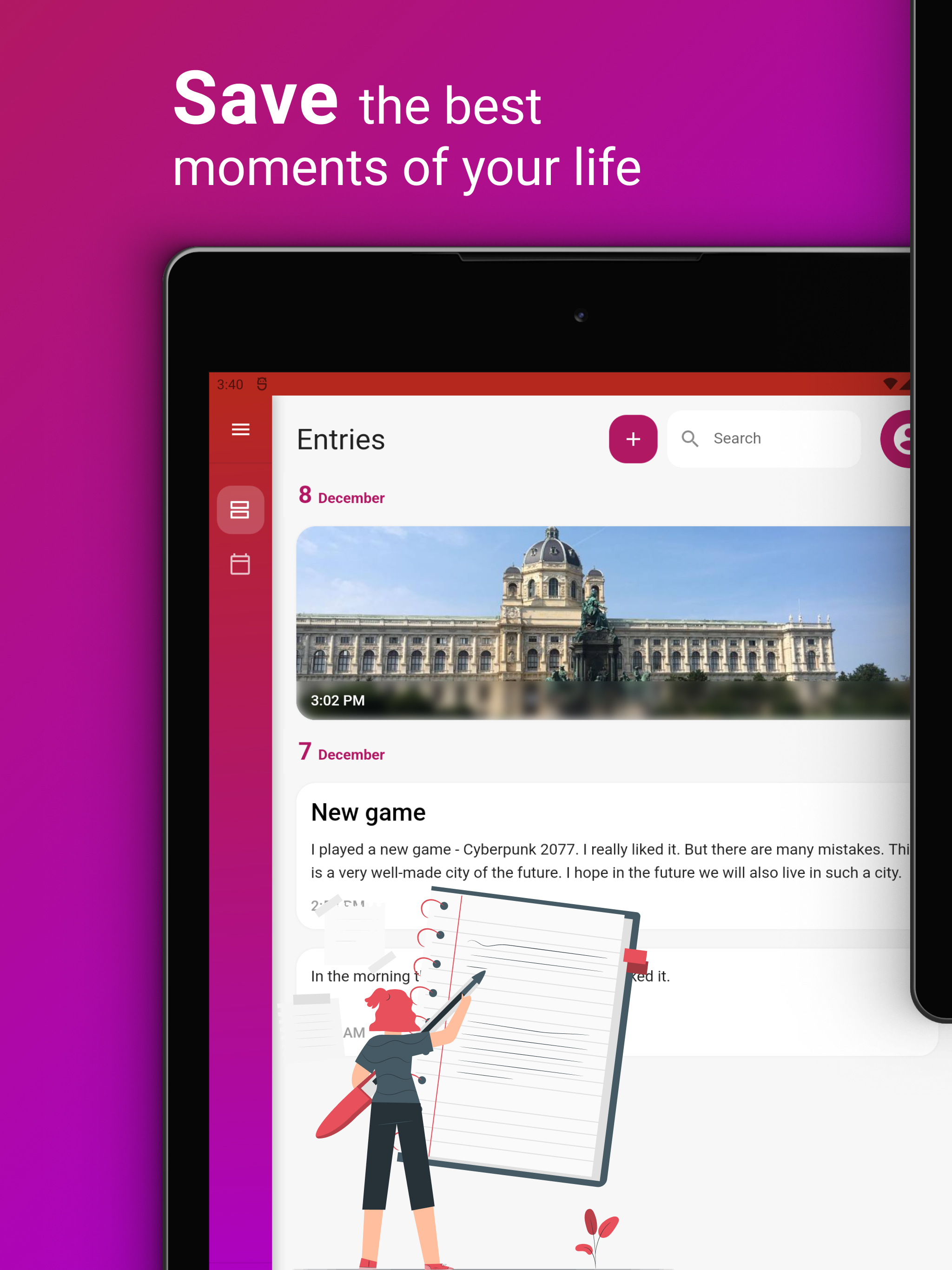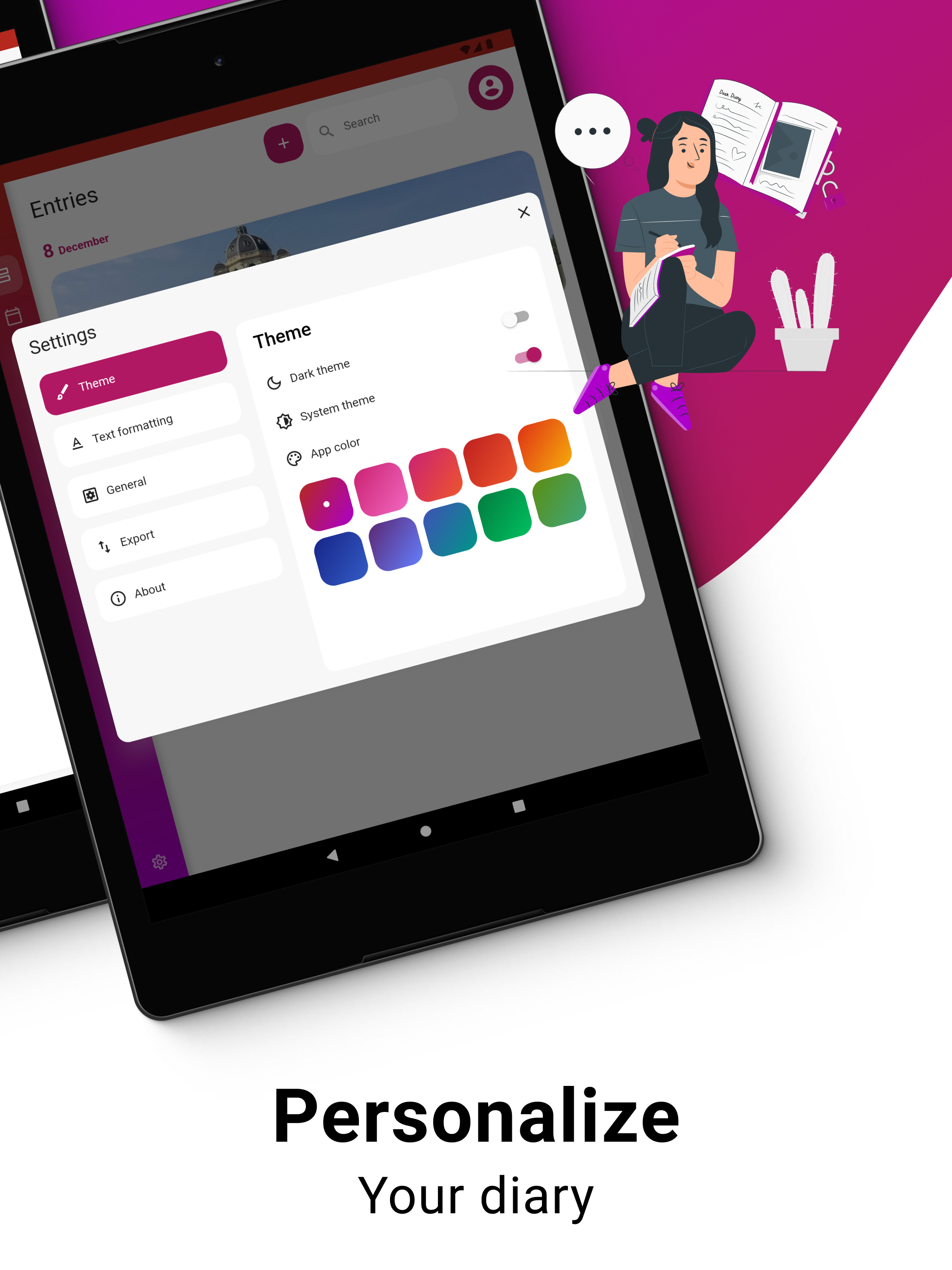 O Purple Diary é um aplicativo de diário pessoal lindamente projetado que permite que você registre e reflita facilmente sobre seus pensamentos e experiências. Com sua interface intuitiva e rico conjunto de recursos, o Purple Diary simplifica a captura dos momentos importantes para você, seja anotando eventos diários, monitorando seu humor ou usando-o como uma ferramenta para autocuidado e crescimento pessoal. Com proteção por senha e a capacidade de adicionar fotos, o Purple Diary oferece um espaço seguro e privado para escrever e se expressar. Experimente o Purple Diary hoje e comece a explorar seu mundo interior de uma maneira totalmente nova. Também disponível no Wear OS.