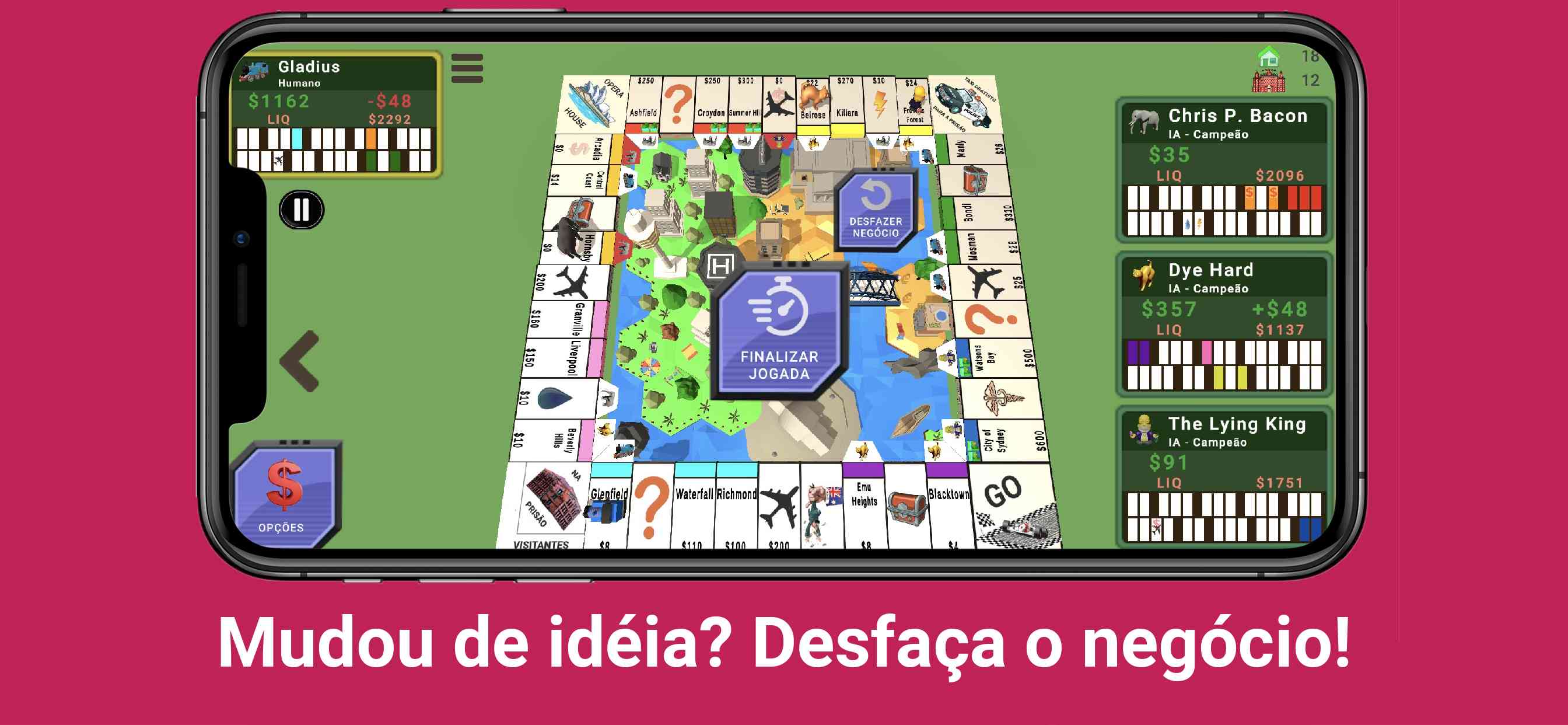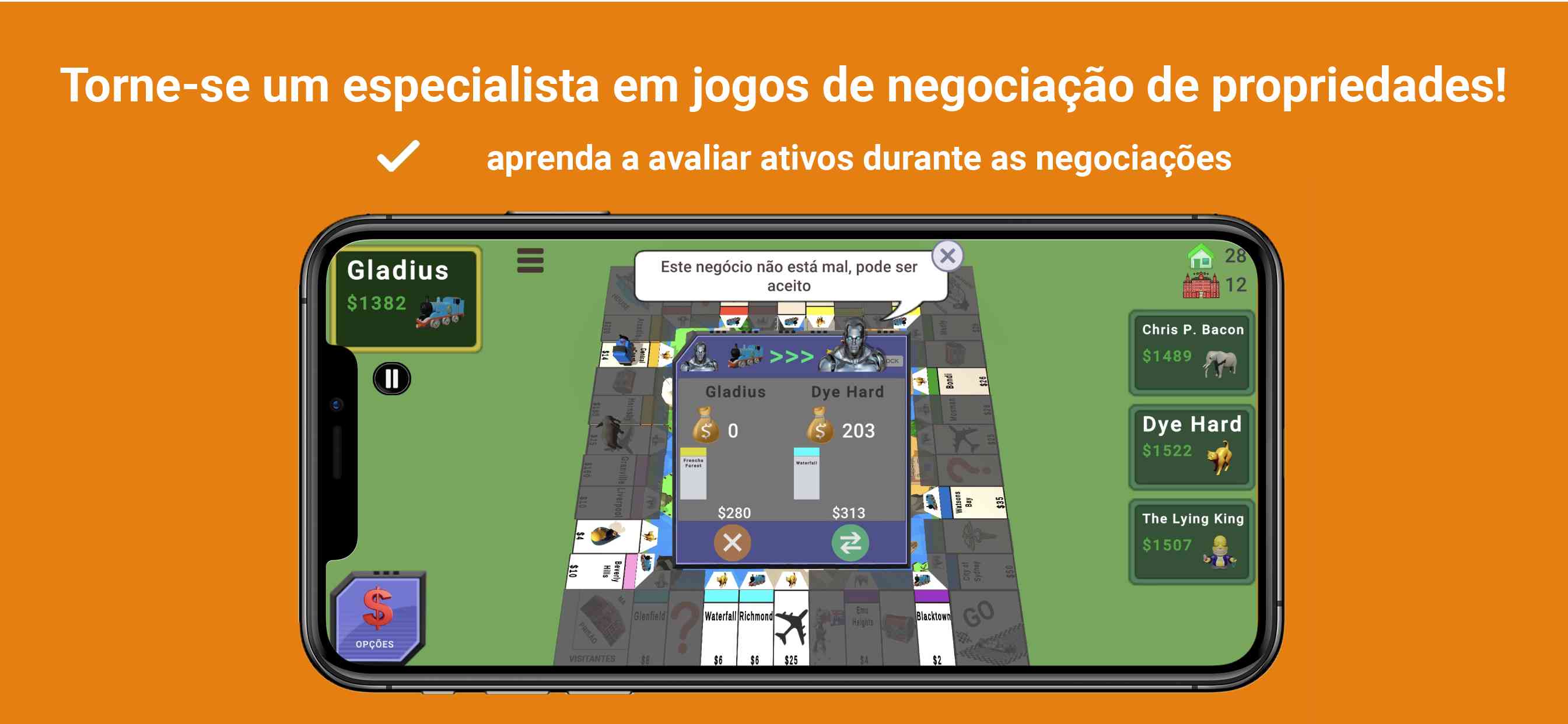 Bem-vindo ao Quadropoly, a variante única e melhorada do clássico jogo de tabuleiro de troca de cartas de propriedades que conquistou o coração e a mente de milhões de famílias em todos os países. O Quadropoly oferece uma reviravolta única no clássico jogo de tabuleiro empresarial: a possibilidade de os jogadores aperfeiçoarem as suas capacidades de gestão financeira e de negociação e aprenderem estratégias empresariais com o professor mais paciente e experiente de todos - uma Inteligência Artificial. A IA foi treinada com modelos de aprendizagem automática em todos os jogos jogados por milhões de jogadores desde 2016. Esta tecnologia inovadora garante que o jogo é desafiante e cativante para jogadores de todos os níveis de competência. Gráficos impressionantes e uma interface de utilizador simples, concebidos para proporcionar aos jogadores uma excelente forma de passar tempo de qualidade com a família e os amigos, quer offline quer online no modo multijogador. O jogo irá melhorar a sua confiança financeira e as suas capacidades de gestão empresarial, competindo com outros jogadores e tornando-se um monopolista do tabuleiro. Quadropoly não é apenas um jogo, é um exercício de simulação estratégica que pode ajudar jogadores de todas as idades e classes sociais a melhorar as suas capacidades de investimento e negociação. 🔵 Um dos principais fundamentos do Quadropoly é o seu compromisso com o jogo limpo. Não há batota, nem re-lançamento, nem parâmetros de sorte ocultos. Em vez disso, os jogadores confiam nas suas capacidades comerciais e de negociação para terem sucesso. A IA não sabe se o seu parceiro comercial é outra IA ou um humano, nem a sua inteligência, independentemente da dificuldade: as avaliações das ofertas comerciais dependem de praticamente tudo no tabuleiro, mas não de quem é o seu adversário. 📇 O Quadropoly também é único no facto de suportar todas as regras oficiais de acordo com o livro. Com os conselhos da IA disponíveis a qualquer momento durante o jogo, os jogadores podem melhorar rapidamente as suas próprias capacidades em qualquer jogo de comércio online. Qualquer pessoa pode aprender o valor real das propriedades, melhorar as suas capacidades de negociação e gerir o seu fluxo de caixa de forma mais eficaz. 🎥 Uma das características mais interessantes do Quadropoly é a possibilidade de ver repetições de jogos concluídos jogados pelos melhores jogadores a partir das Tabelas de Classificação. Esta é uma excelente forma de aprender novas tácticas e de se tornar um melhor jogador. Com extensas opções de personalização, incluindo suporte para centenas de regras da casa, o Quadropoly é um jogo que podes jogar vezes sem conta durante anos. 🌠 As variantes de velocidade de animação do jogo tornam possível terminá-lo em 6-15 minutos, estabelecendo-o como uma escolha perfeita para aqueles que desejam uma experiência rápida e emocionante. Cada IA do jogo é única, com a sua personalidade a definir as suas tendências para assumir riscos, bem como a sua atitude em relação à propriedade. As IAs são ótimas em imitar pessoas reais, com a capacidade de ficarem irritadas, desesperadas ou gananciosas. 🎭 Com oito níveis de dificuldade disponíveis, os jogadores podem parar num nível em que se sintam confortáveis e avançar ao seu próprio ritmo. O número de pontuações atribuídas por jogo depende do número de tácticas utilizadas. Isto garante aos melhores jogadores a capacidade de obter uma pontuação mais elevada por jogo, podendo avançar 10 a 50 vezes mais depressa do que os principiantes e desbloquear rapidamente os níveis superiores. Quadropoly não é apenas um jogo de tabuleiro, é uma verdadeira experiência. Com as suas características inovadoras, jogabilidade emocionante e compromisso com o fair play, é um jogo que não vai querer largar. Por isso, junte-se à diversão e experimente a emoção de dominar a concorrência e de se tornar o derradeiro monopolista no mundo do Quadropoly!