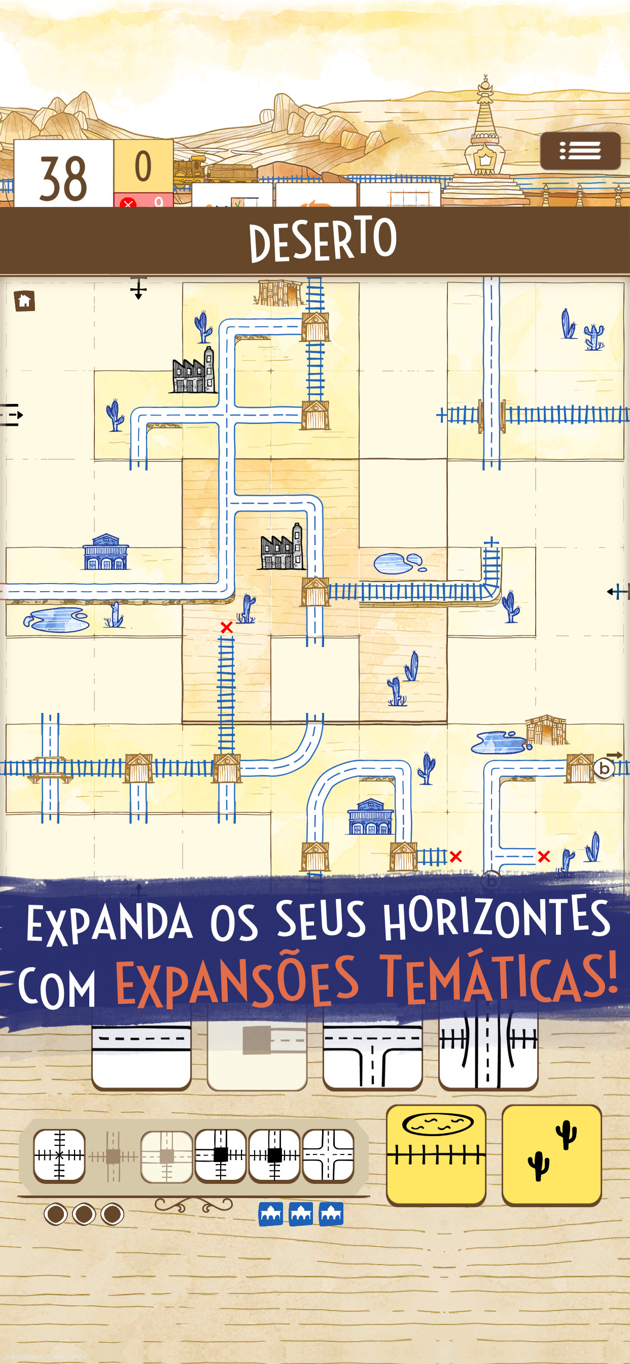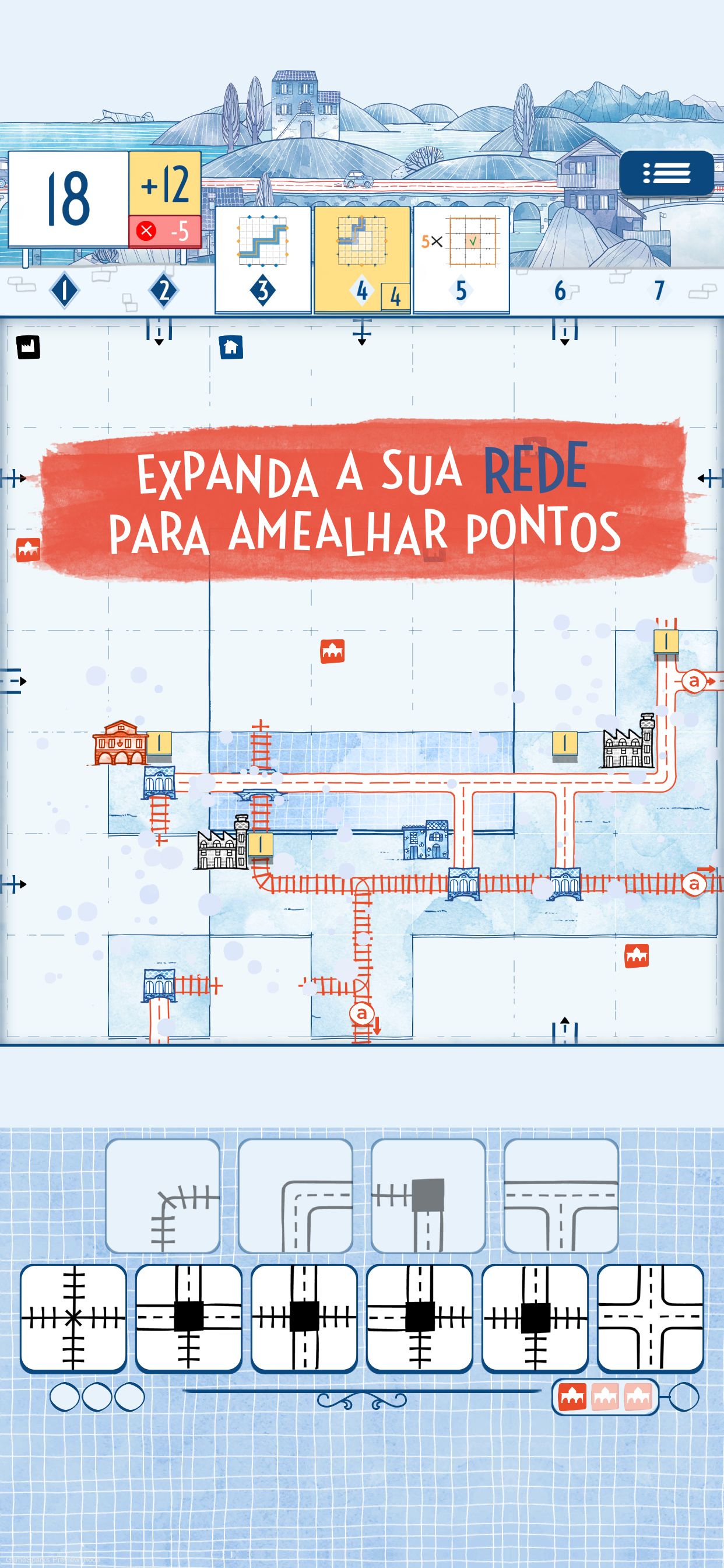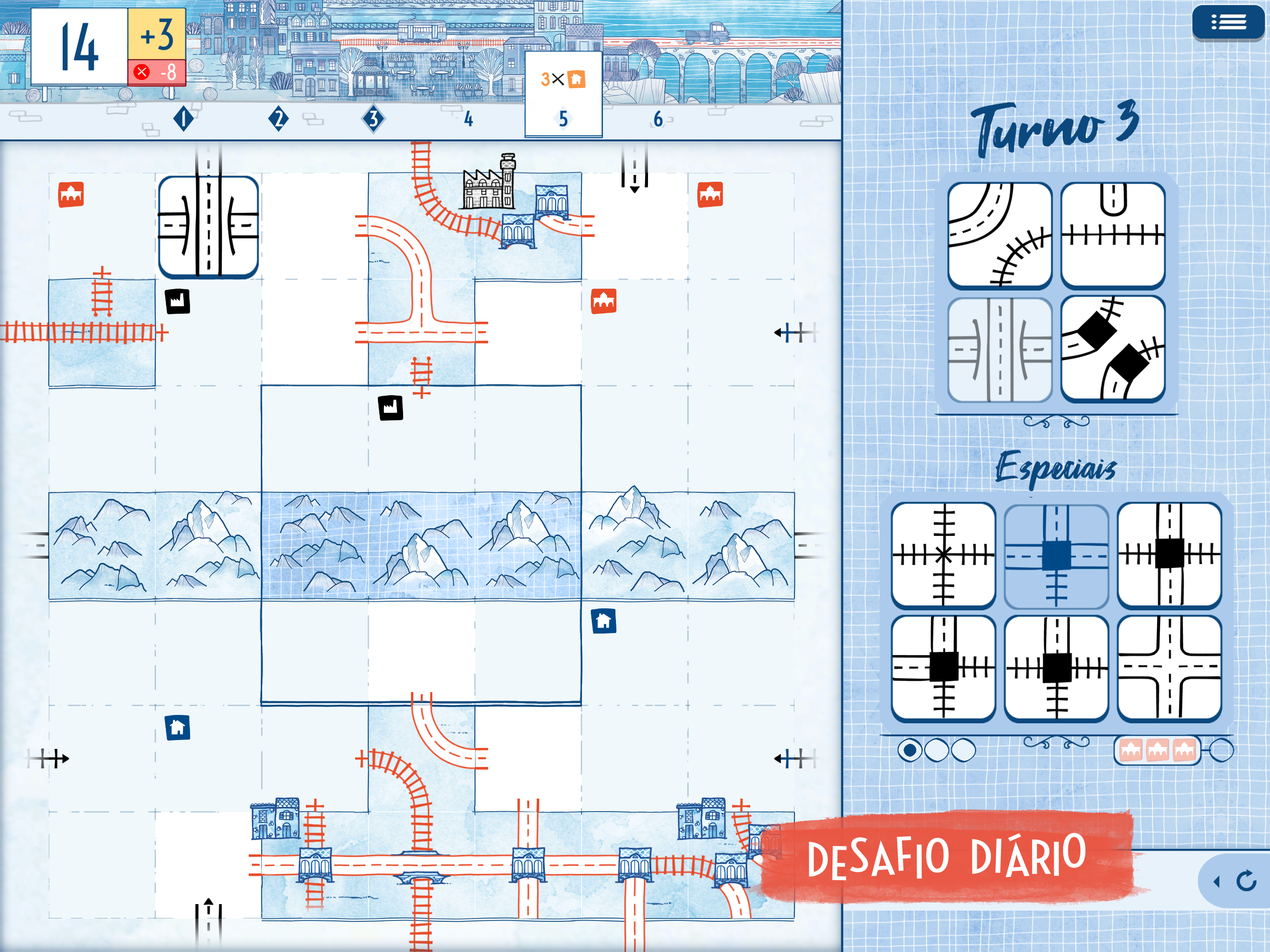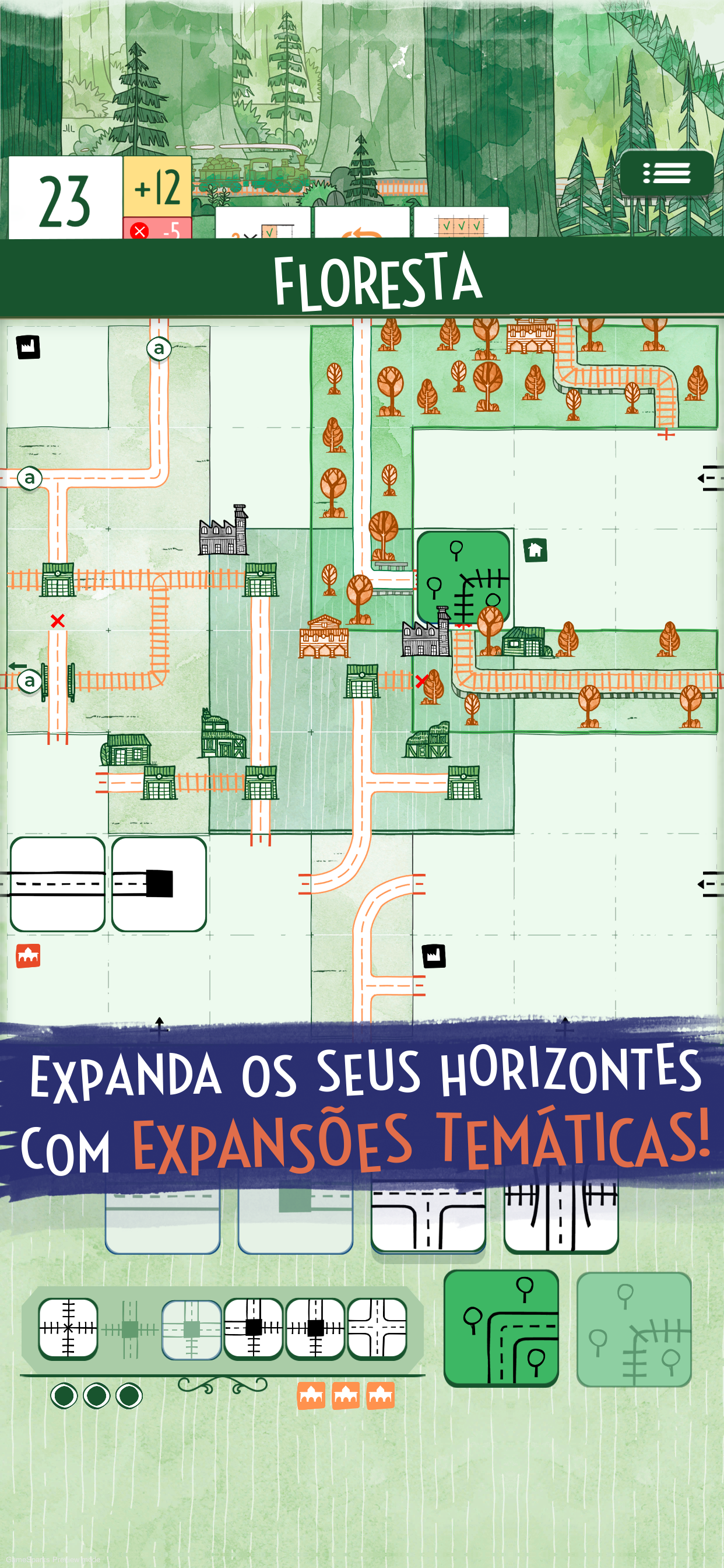 Em Railroad Ink Challenge, dispõe de 7 rondas para conseguir o maior número de pontos possíveis. Lance os dados e desenhe as rotas para ligar as saídas à volta do tabuleiro. Expanda a sua rede com ferrovias, autoestradas e estações para amealhar pontos, mas também será penalizado por qualquer ligação aberta, por isso planeia cuidadosamente! Jogue sozinho para melhorar o seu record, ou desafie jogadores de todo o mundo! COMO JOGAR Em cada ronda terá de lançar os dados e usar as rotas disponíveis para contruir a sua rede de transportee ligar o maior número de saídas que conseguir. Expanda a sua rede para ganhar pontos. Também ganhará pontos bónus pela autoestrada e ferrovia mais longa, por construir nos espaços centrais do mapa e por concluir objetivos opcionais antes do tempo terminar. Também pode ligar estruturas especiais à sua rede para ativar os seus efeitos especiais, como duplicar rotas, desbloquear rotas especiais poderosas, e mais. Mas atenção: Tente não deixar nenhuma ligação aberta, uma vez que cada uma delas lhe irá custar pontos no final do jogo. EXPANSÕES Floresta, Deserto e mais expansões baseadas no jogo físico estão planeadas e estarão disponíveis brevemente como DLC nos meses seguints após o lançamento! Estas expansões adicionam dados e regras especiais para criar paisagens ainda mais complexas para as suas ferrovias e autoestradas. MODOS Jogue sozinho com objetivos aleatórios e junte-se às classificações online ou desafie jogadores de todo o mundo com jogos personalizados! As tabelas de classificação online (Diária, Mensal e De Sempre) são completamente multi-plataforma! • A maravilhosa arte do jogo de Marta Tranquilli, desenvolvida e aprimorada digitalmente • Planeamento de Redes: tente utilizar da melhor maneira as rotas disponíveis em cada ronda para criar a rede de transportes perfeita • Tente conquistar o topo da tabela de classificação online (Diária, Mensal, e De Sempre)! • Desafios assíncronos multi-jogador e multi-plataforma com os seus amigos! Desafios multi-jogador 100% assíncronos Não gosta de esperar enquanto os seus oponentes terminam o seu turno? Não se preocupe! Com desafios multi-jogador 100% assíncronos, isso é uma coisa do passado! Jogue um jogo inteiro sozinho, depois coloque o desafio online! Jogadores de todo o mundo conseguirão jogar os mesmos dados e objetivos que teve e tentarão bater a sua pontuação! Quem conseguirá o melhor resultado? Railroad Ink Challenge é a adaptação oficial do aclamado jogo roll and write criado pelos designers premiados Hjalmar Hach e Lorenzo Silva e ilustrado pela artista Marta Tranquilli.
