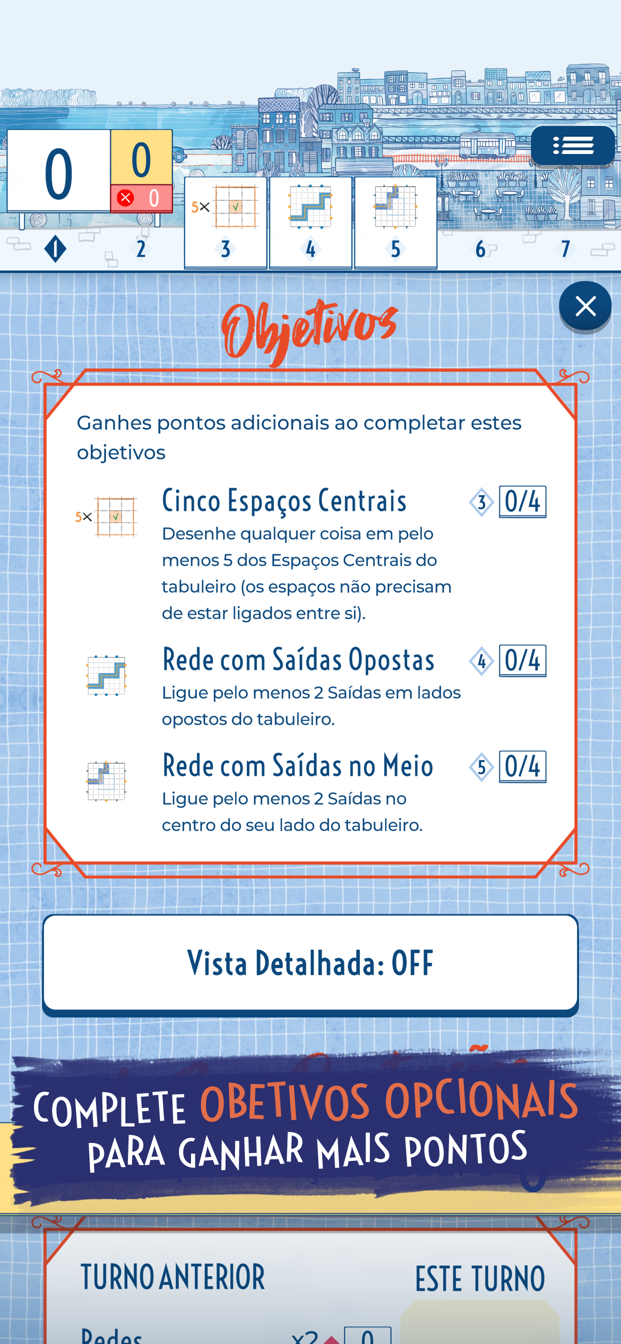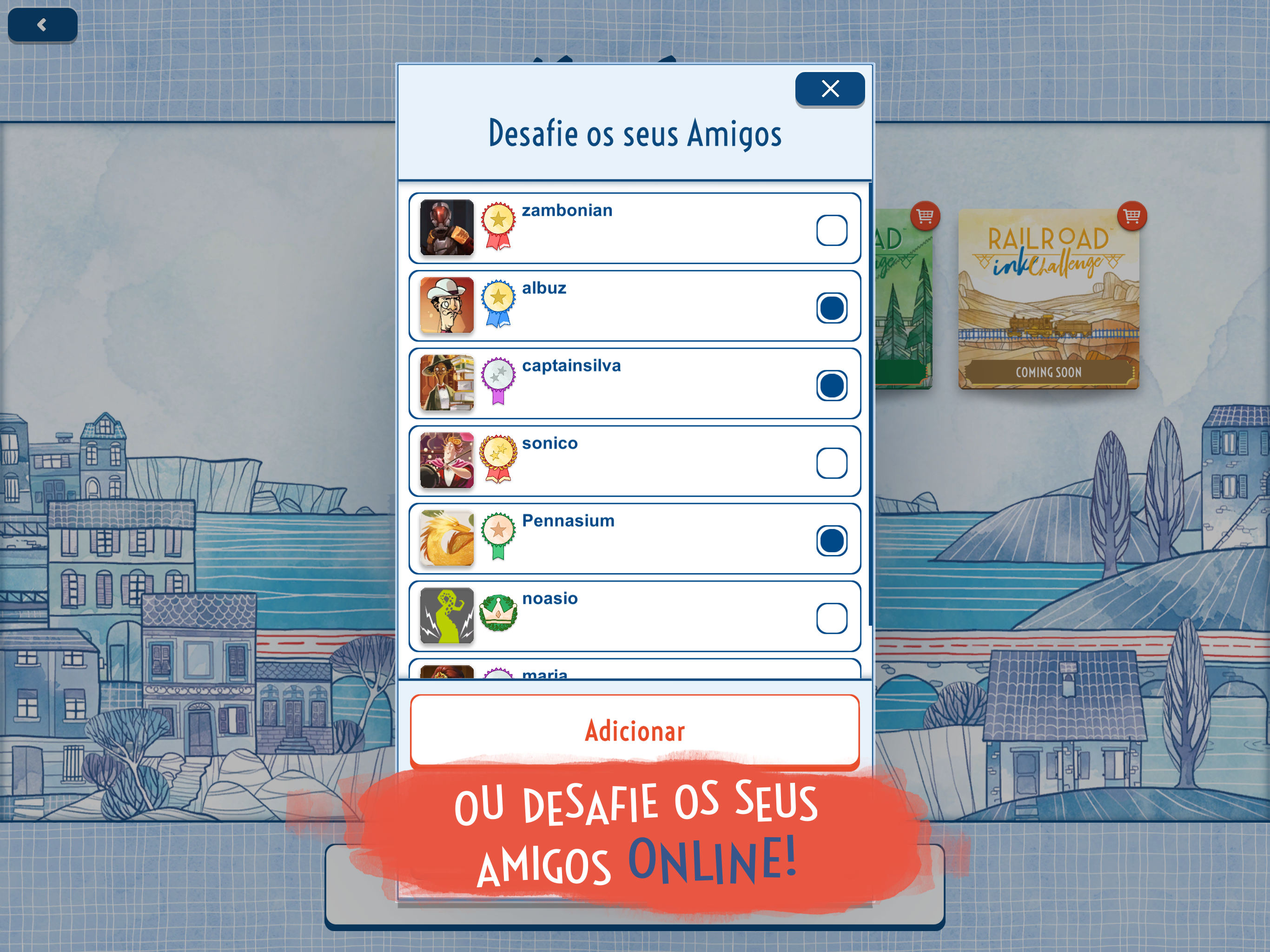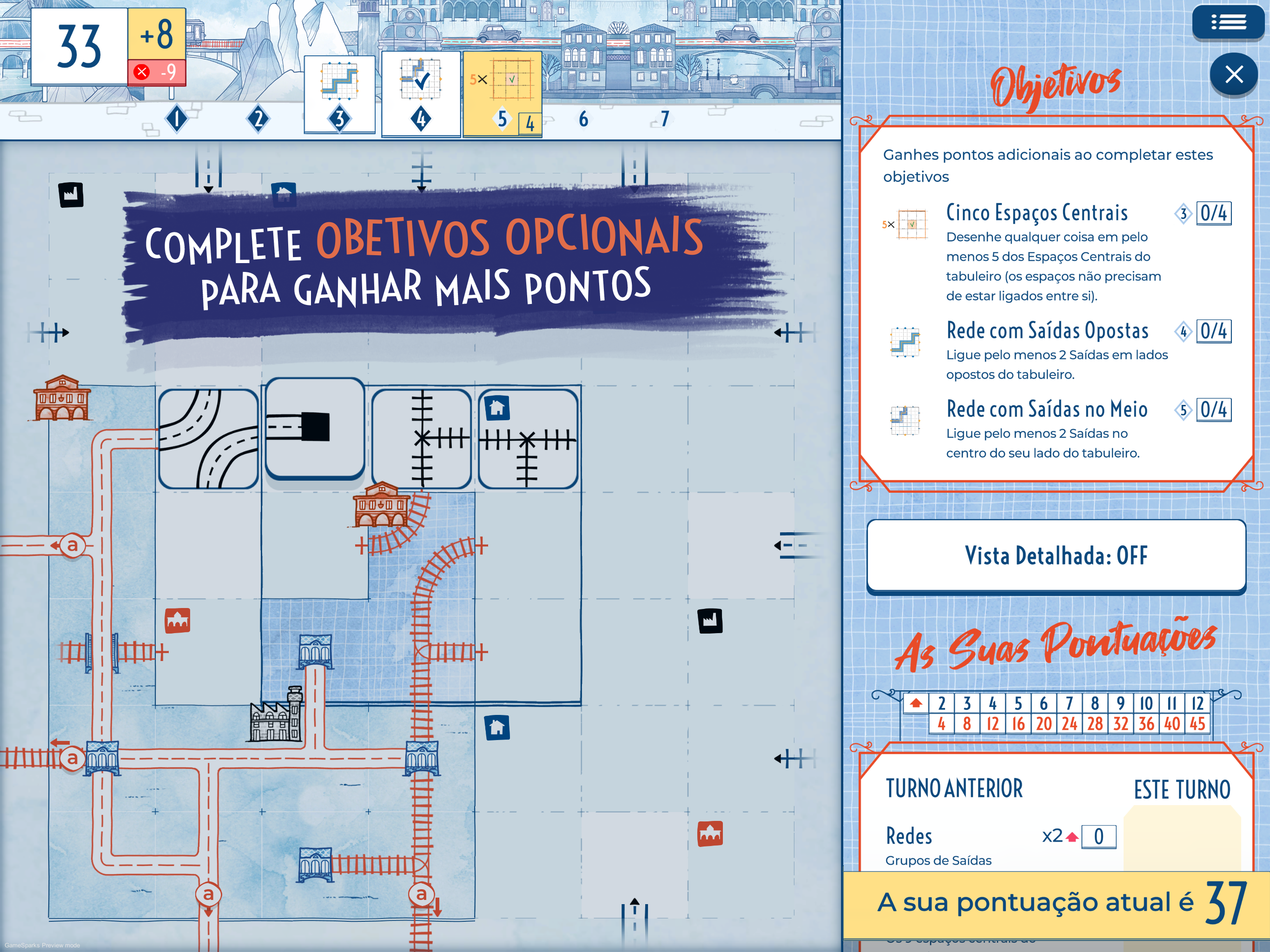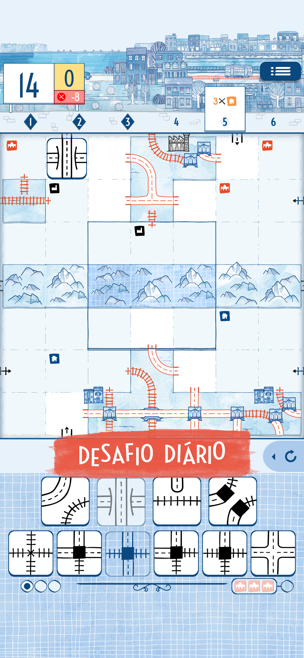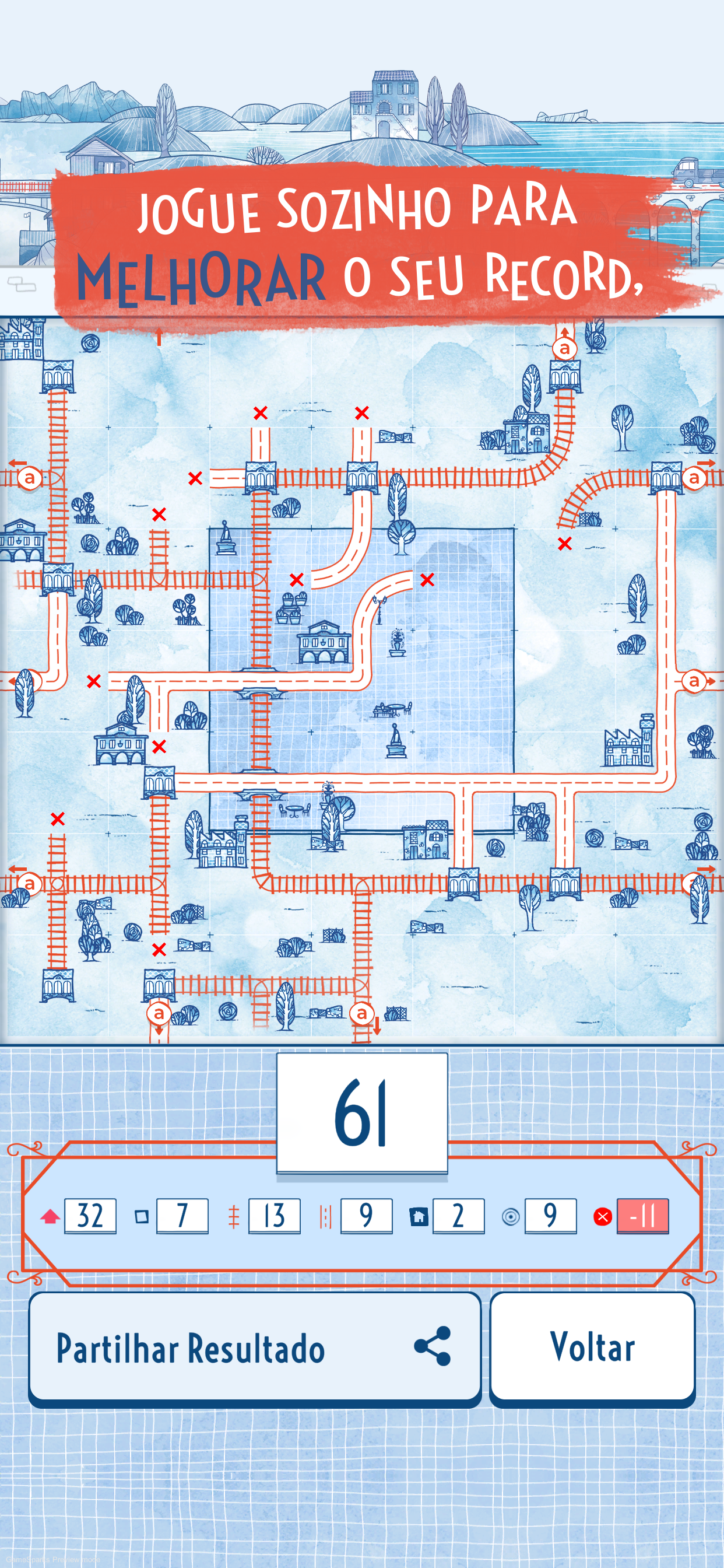 Em Railroad Ink Challenge, dispõe de 7 rondas para conseguir o maior número de pontos possíveis. Lance os dados e desenhe as rotas para ligar as saídas à volta do tabuleiro. Expanda a sua rede com ferrovias, autoestradas e estações para amealhar pontos, mas também será penalizado por qualquer ligação aberta, por isso planeia cuidadosamente! Jogue sozinho para melhorar o seu record, ou desafie jogadores de todo o mundo! COMO JOGAR Em cada ronda terá de lançar os dados e usar as rotas disponíveis para contruir a sua rede de transportee ligar o maior número de saídas que conseguir. Expanda a sua rede para ganhar pontos. Também ganhará pontos bónus pela autoestrada e ferrovia mais longa, por construir nos espaços centrais do mapa e por concluir objetivos opcionais antes do tempo terminar. Também pode ligar estruturas especiais à sua rede para ativar os seus efeitos especiais, como duplicar rotas, desbloquear rotas especiais poderosas, e mais. Mas atenção: Tente não deixar nenhuma ligação aberta, uma vez que cada uma delas lhe irá custar pontos no final do jogo. EXPANSÕES Floresta, Deserto e mais expansões baseadas no jogo físico estão planeadas e estarão disponíveis brevemente como DLC nos meses seguints após o lançamento! Estas expansões adicionam dados e regras especiais para criar paisagens ainda mais complexas para as suas ferrovias e autoestradas. MODOS Jogue sozinho com objetivos aleatórios e junte-se às classificações online ou desafie jogadores de todo o mundo com jogos personalizados! As tabelas de classificação online (Diária, Mensal e De Sempre) são completamente multi-plataforma! • A maravilhosa arte do jogo de Marta Tranquilli, desenvolvida e aprimorada digitalmente • Planeamento de Redes: tente utilizar da melhor maneira as rotas disponíveis em cada ronda para criar a rede de transportes perfeita • Tente conquistar o topo da tabela de classificação online (Diária, Mensal, e De Sempre)! • Desafios assíncronos multi-jogador e multi-plataforma com os seus amigos! Desafios multi-jogador 100% assíncronos Não gosta de esperar enquanto os seus oponentes terminam o seu turno? Não se preocupe! Com desafios multi-jogador 100% assíncronos, isso é uma coisa do passado! Jogue um jogo inteiro sozinho, depois coloque o desafio online! Jogadores de todo o mundo conseguirão jogar os mesmos dados e objetivos que teve e tentarão bater a sua pontuação! Quem conseguirá o melhor resultado? Railroad Ink Challenge é a adaptação oficial do aclamado jogo roll and write criado pelos designers premiados Hjalmar Hach e Lorenzo Silva e ilustrado pela artista Marta Tranquilli.