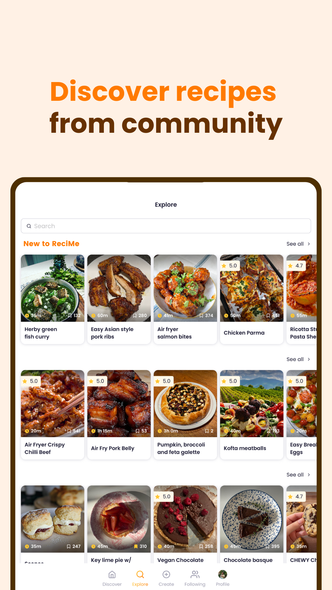 Os cozinheiros do ReciMe estão compartilhando suas receitas favoritas que farão várias vezes e recomendarão à sua comunidade. Existem milhares de receitas para você experimentar, independentemente do seu nível de habilidade. Pesquise receitas por preferências, dietas e ingredientes.