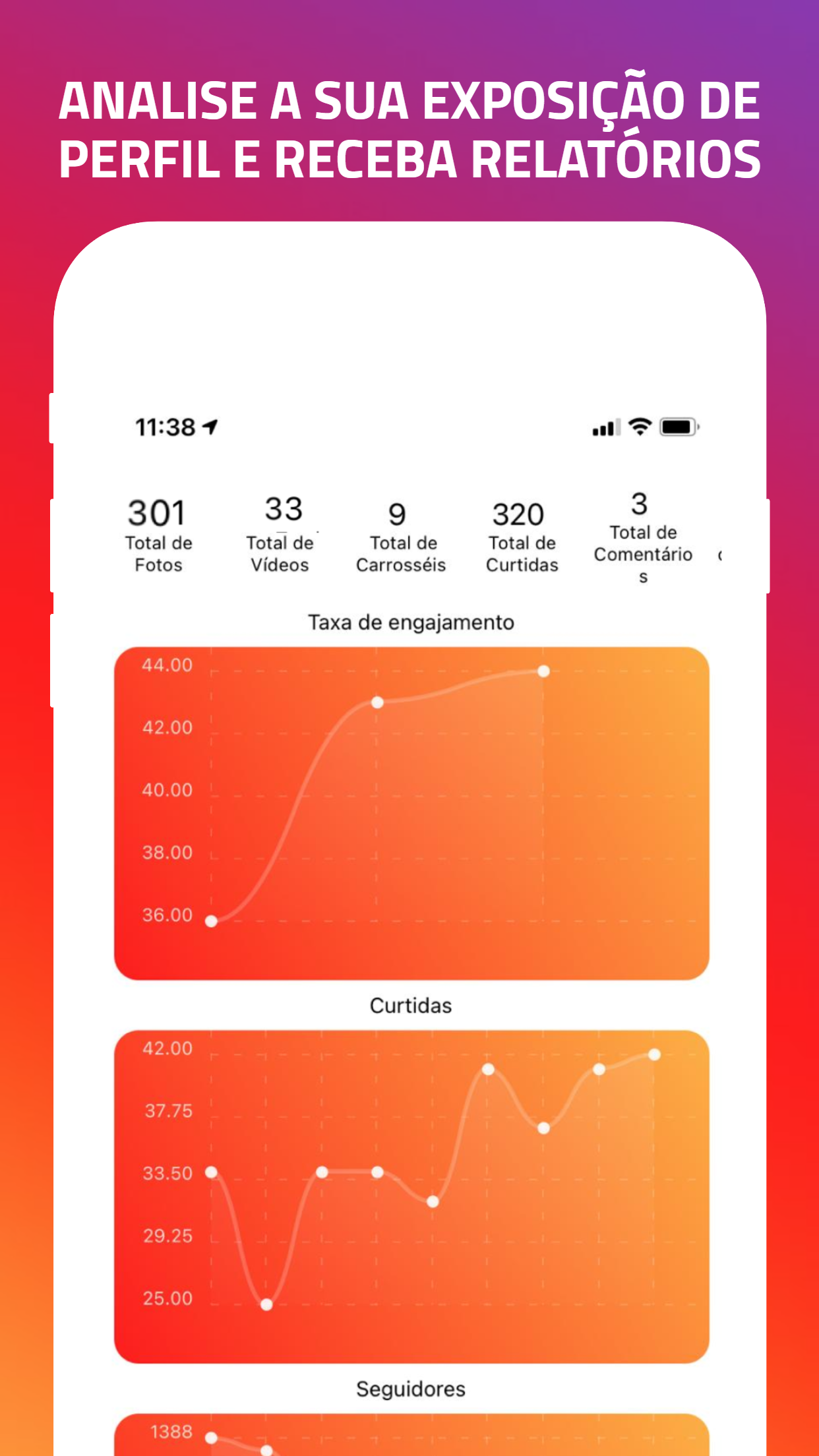 Acompanhe seus principais seguidores, seguidores perdidos, seguidores fantasmas, bloqueadores, seguidores mútuos - curtidas, comentários, tags removidos e contas excluídas. Descubra quem gosta e / ou comenta em suas postagens, mas não segue você. Descubra quais seguidores gostam mais de suas postagens e muito mais!