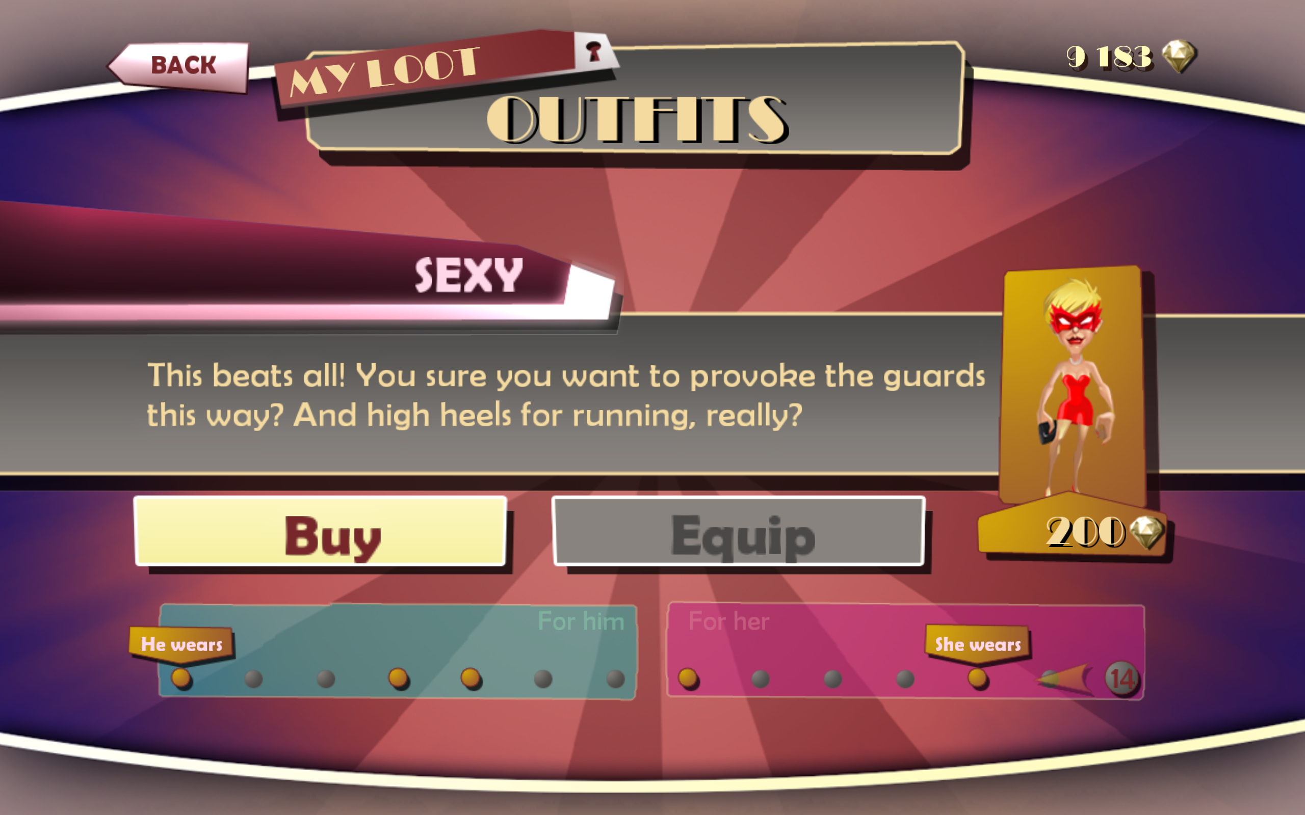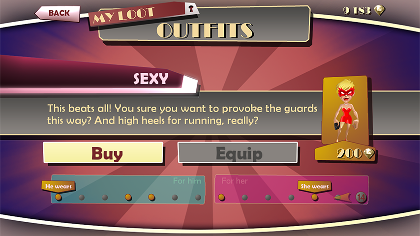 - “No problems, an arsenal of bonuses and gears is at your disposal to help you in your evil deeds. Hey there is no good robber without a good stuff after all!”