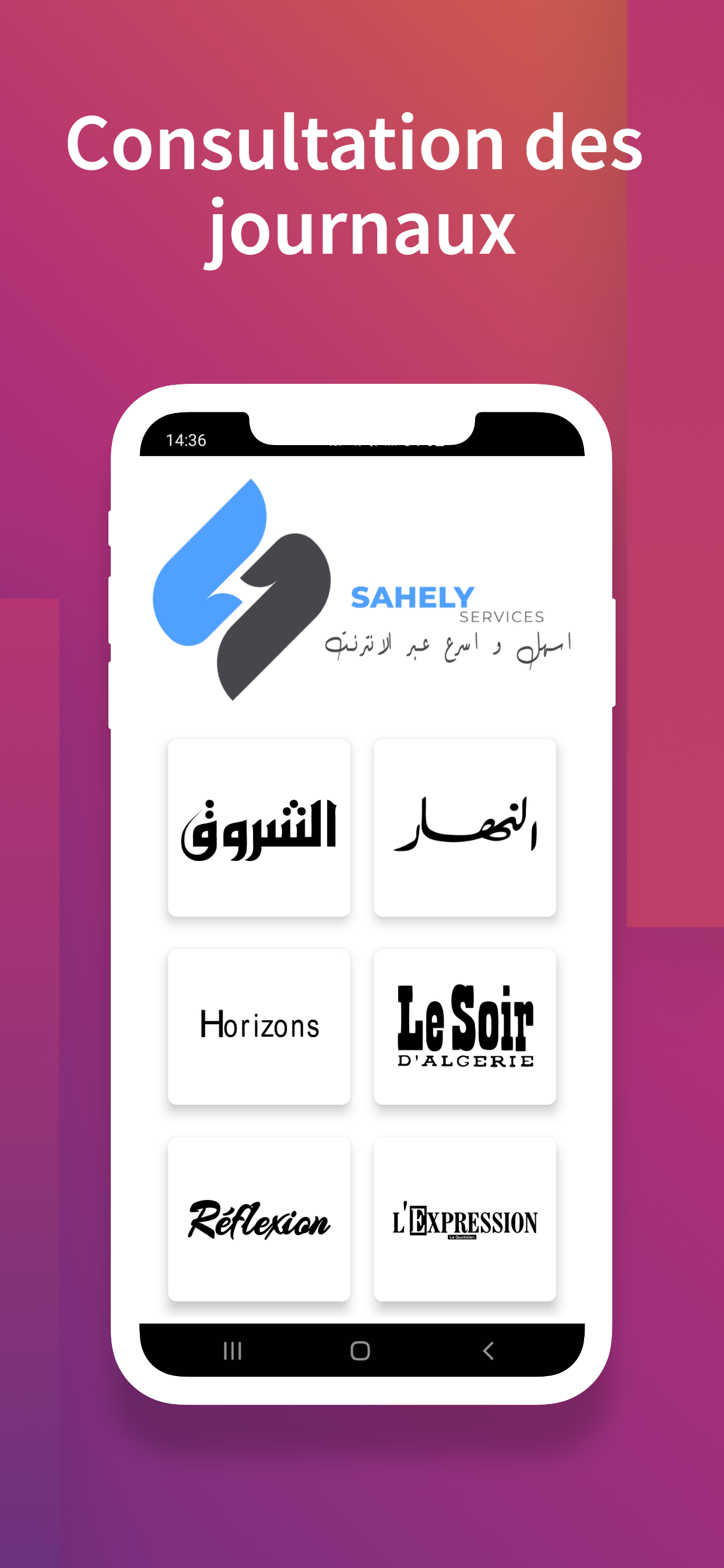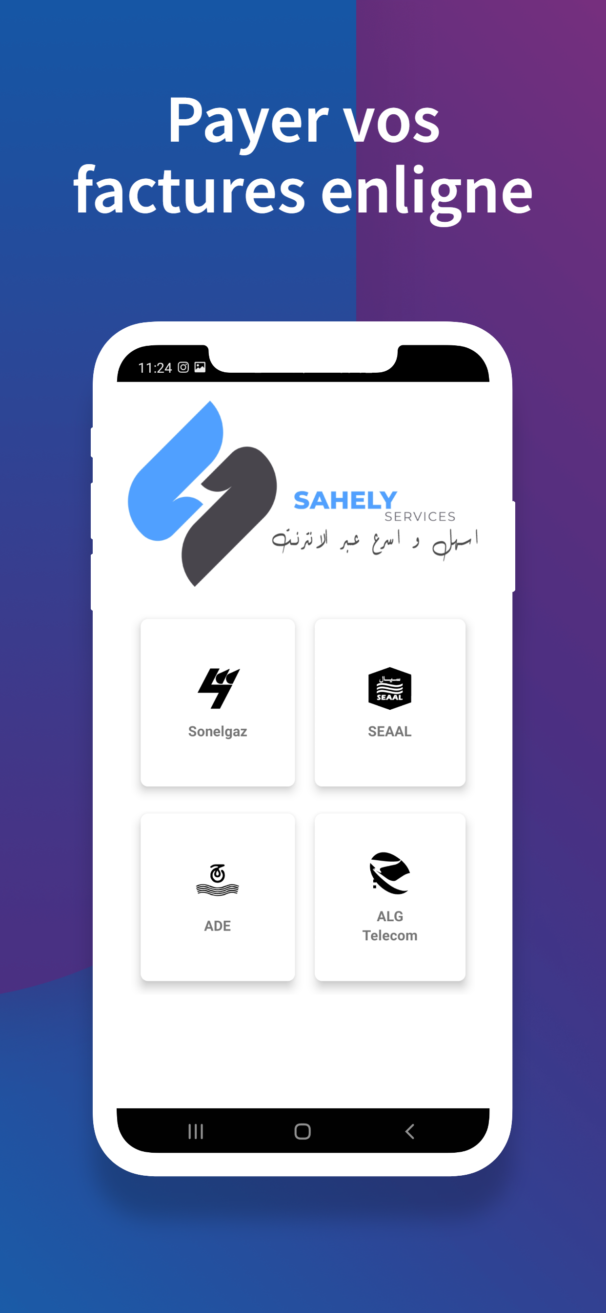 O Sahely Net facilita a acessibilidade aos serviços online de maneira rápida. Serviços que oferecemos: - Pague suas faturas online (ADE, SONELGAZ, SEAAL, ALGERIE TELECOM). - Recarregue sua linha móvel (Flexy) Djezzy, Mobilis e Ooredoo. - Consulte sua conta CCP. - Rastreie sua remessa (MAIL & PARCEL). - Consulta de jornais argelinos. - Taxa de câmbio no mercado paralelo e oficial.