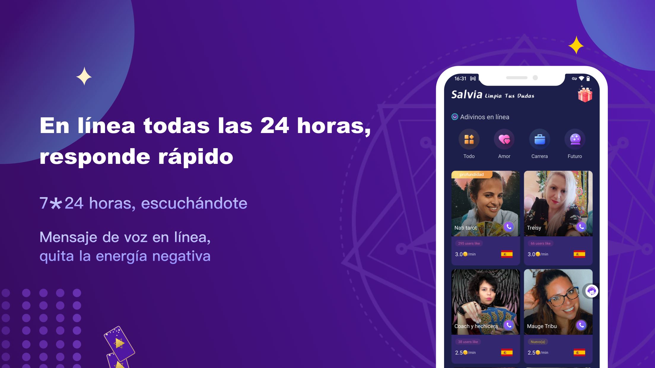 🔮Salvia é um aplicativo profissional de tarô e astrologia espanhola no México e outros países da América Latina, é popular entre os usuários ☎️Entre em contato com nossos adivinhos cara a cara de diferentes maneiras 🤔️ Esclareça suas DÚVIDAS e tenha um FUTURO MELHOR! 🎁Desconto e ligação extra na primeira recarga! 🔒Com garantia de privacidade, você pode se expressar livremente! ----- Aplicativo Sábio ----- Salvia é um aplicativo profissional de tarô e astrologia espanhola, aqui você pode nos contar seus problemas sobre temas como amor, relacionamentos, casamento, psicologia, família e carreira e fazer uma consulta pessoalmente com nossos consultores, que podem lhe dar conselhos valiosos. Você pode encontrar facilmente os melhores adivinhos aqui e encontrá-los cara a cara, temos muitos leitores de tarô, astrólogos estritamente certificados, eles são profissionais e podem ajudá-lo a fazer previsões precisas e dar conselhos de vida, protegendo sua privacidade por meio de tarô, mapa astral e horóscopos. ----- Sobre o aplicativo ----- 👀 Conheça o seu futuro a qualquer momento O melhor de tudo é que nossos adivinhos podem ajudá-lo a fazer adivinhações por meio de cartas de tarô, dados de astrólogos, mapas astrais e muito mais. Tarot: Em Salvia, você pode fazer uma pergunta depois de tirar 3 cartas de tarô, os adivinhos lhe darão uma resposta em um momento. Além disso, todos os dias, você pode receber uma carta diária para adivinhar sua sorte e dar conselhos. Dados Astrólogos: Você também pode usar os dados astrólogos para consultar nossos astrólogos com sua dúvida. Mapa Astral: Quer saber se é a pessoa certa para você, pode usar o mapa astral, escreva sua pergunta e selecione seus dados e os do casal e aguarde as leituras dos videntes. 💬Converse pessoalmente com verdadeiros adivinhos A melhor parte do aplicativo Salvia é que você pode conversar com nossos videntes a qualquer hora, em qualquer lugar, apenas com a opção de chamada, é simples e rápido. Aqui você pode falar com eles de várias maneiras, incluindo, entre outros, perguntas, ligações, mensagens de texto. Também oferecemos transmissão ao vivo, você pode entrar na sala ao vivo dos adivinhos e assistir todo o processo de leitura, você também pode ligar ao vivo, os adivinhos e o público vão ouvir e te ajudar! 🔒Proteja sua privacidade Salvia não só oferece a oportunidade de fazer perguntas anonimamente, mas também a oportunidade de fazer chamadas privadas com os consultores, sua privacidade é totalmente protegida aqui. Você também é livre para mudar seu apelido e avatar. Somos uma organização confiável. 🧙♀️Conselheiros profissionais Até agora, o aplicativo Salvia já conta com mais de 100 consultores profissionais, a maioria deles com mais de 10 anos de experiência e atendendo a milhares de clientes, você pode encontrar diferentes adivinhos com diversas habilidades, incluindo astrologia, tarô, horóscopo, numerologia, médiuns e muito mais. 💯Serviço garantido Cada cartomante passou por nada menos que 3 rodadas de testes de habilidade rigorosos e fornecemos atendimento ao cliente profissional para responder às suas perguntas sobre o uso do aplicativo. 🇧🇷Idioma Salvia é um aplicativo dedicado a fornecer um melhor serviço aos países da América Latina. Todo o serviço do app é em espanhol, temos cartomantes que vêm do México, Argentina, Colômbia, Chile, etc. Baixe hoje mesmo o app Salvia para começar a usufruir do nosso serviço e esclarecer as dúvidas da sua vida!