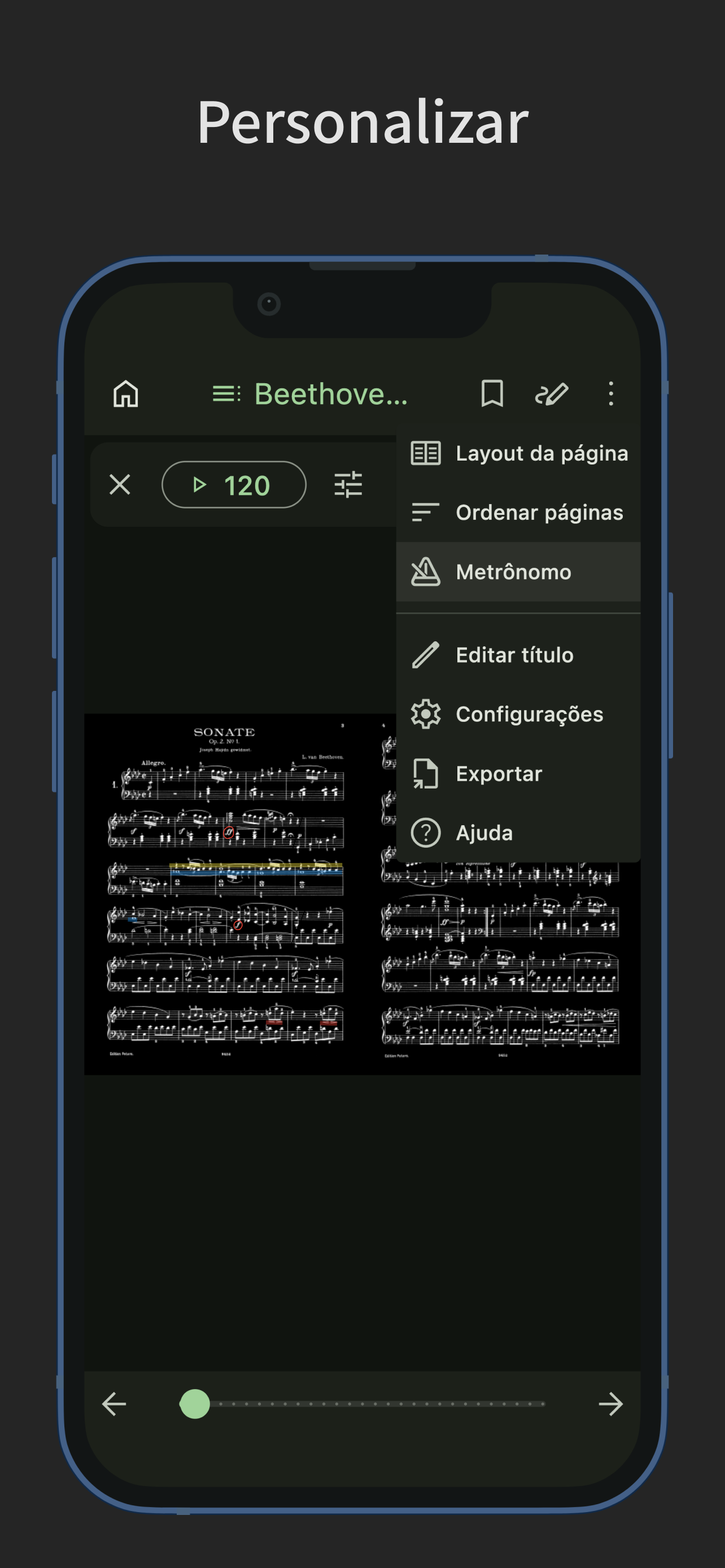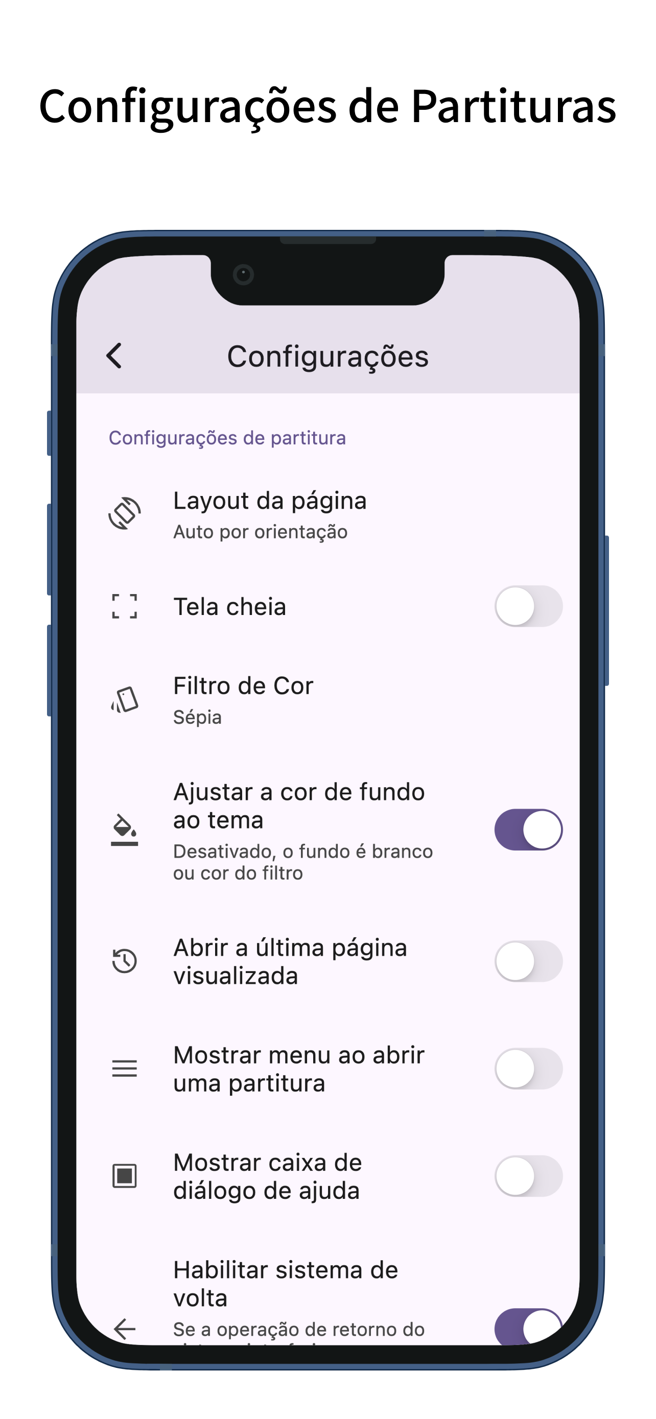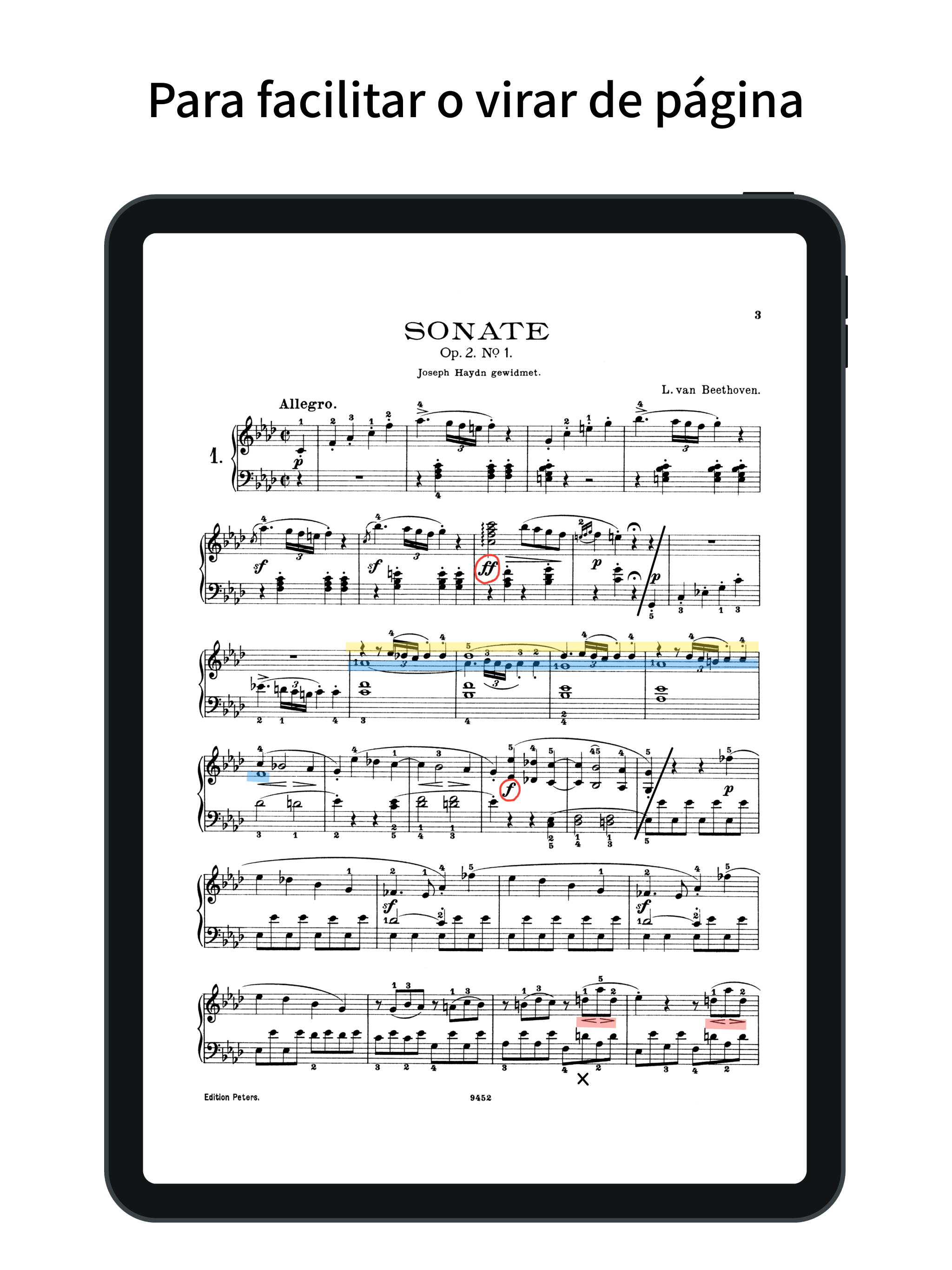Aplicativo de visualização de partituras com fácil virada de página. Vire as páginas com toques e deslizes. Você também pode reordenar as páginas da sua partitura. Virada de Página Fácil - Você pode virar as páginas com toques e deslizes. - Suporta pedais Bluetooth para virada de página. - As configurações de toque podem ser definidas como: página anterior, esquerda/direita, superior/inferior, página seguinte ou desativado. - Os gestos de deslize podem ser ativados ou desativados individualmente para cima, para baixo, para a esquerda e para a direita. - Ações que não sejam a virada de página (como exibir o menu ou escrever anotações) podem ser atribuídas a gestos que não interfiram com a virada de página, como manter pressionado ou tocar nas bordas superior ou inferior. - A operação de zoom (pinça ou duplo toque) na partitura também pode ser ativada ou desativada. Reordenação de Páginas - Reordenar as páginas da partitura facilita a virada de página durante repetições, dal segno, codas e situações semelhantes. - Ao adicionar páginas via reordenação, você pode adicionar e arrastar várias páginas de uma vez – não apenas uma. - Você também pode excluir páginas ou adicionar páginas em branco. Anotações na Partitura - Você pode escrever anotações à mão na partitura. - São disponibilizados dois tipos de canetas, marcadores e uma borracha, com funções de desfazer e refazer. - As canetas e os marcadores permitem escolher a espessura e a cor da linha, e você também pode desenhar linhas retas. - Uma ferramenta conta-gotas permite captar cores da tela. - Você pode exportar um PDF que inclua suas anotações. Setlist - Você pode agrupar várias partituras em um setlist para visualizá-las continuamente sem precisar reabri-las. - Ao tocar o título na barra de menu, é exibida a lista das partituras do setlist; ao tocar, você é direcionado para aquela partitura. Favoritos - Você pode adicionar favoritos às páginas da partitura. - Os favoritos podem ter títulos personalizados. - Ao tocar o título na barra de menu, uma lista de favoritos é exibida; ao tocar, você é direcionado para a página correspondente. Layout da Página - Você pode escolher entre os layouts de página única, página dupla, ajustar à largura, ajustar à altura, meia página (superior/inferior) ou meia página (esquerda/direita) para as suas partituras. - O layout pode ser alterado automaticamente com base na orientação da tela. - Ao selecionar "ajustar à largura", a partitura é exibida em toda a largura da tela, facilitando a visualização em dispositivos pequenos. Filtro de Cor - Você pode aplicar um filtro de cor à partitura, escolhendo entre sépia, verde ou invertido. - Se o branco da partitura parecer muito ofuscante, essa configuração pode melhorar a legibilidade. Adicionar Partituras - Você pode adicionar partituras em formato PDF. - Na tela de listagem das partituras, ao pressionar o botão de “mais” no canto inferior direito, você pode adicionar arquivos PDF do seu dispositivo. (Na tela do setlist, o botão de “mais” abre a tela para adicionar um setlist.) - Você também pode adicionar partituras compartilhando arquivos PDF de outros aplicativos. - É possível adicionar várias partituras de uma vez. Gerenciamento de Partituras - O recurso de etiquetas permite adicionar etiquetas às partituras ou setlists, possibilitando filtrá-las por múltiplas etiquetas. - Ao tocar na barra de pesquisa, você pode procurar partituras ou setlists pelo título. - As partituras e os setlists podem ser organizados por título, data de criação ou última visualização. Personalização - Suporta modo escuro. - Permite alterar a cor do tema. - Possui um design simples que segue os princípios do Material Design.