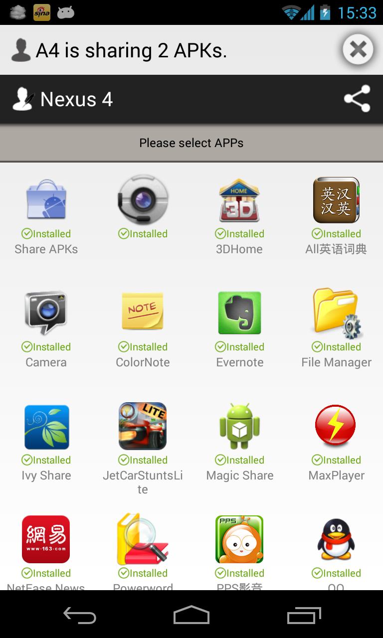 3, Bluetooth is an additional way for sharing APPs. But not all of Android system or mobiles support to share a APK directly, so it would be failed in them. :-(