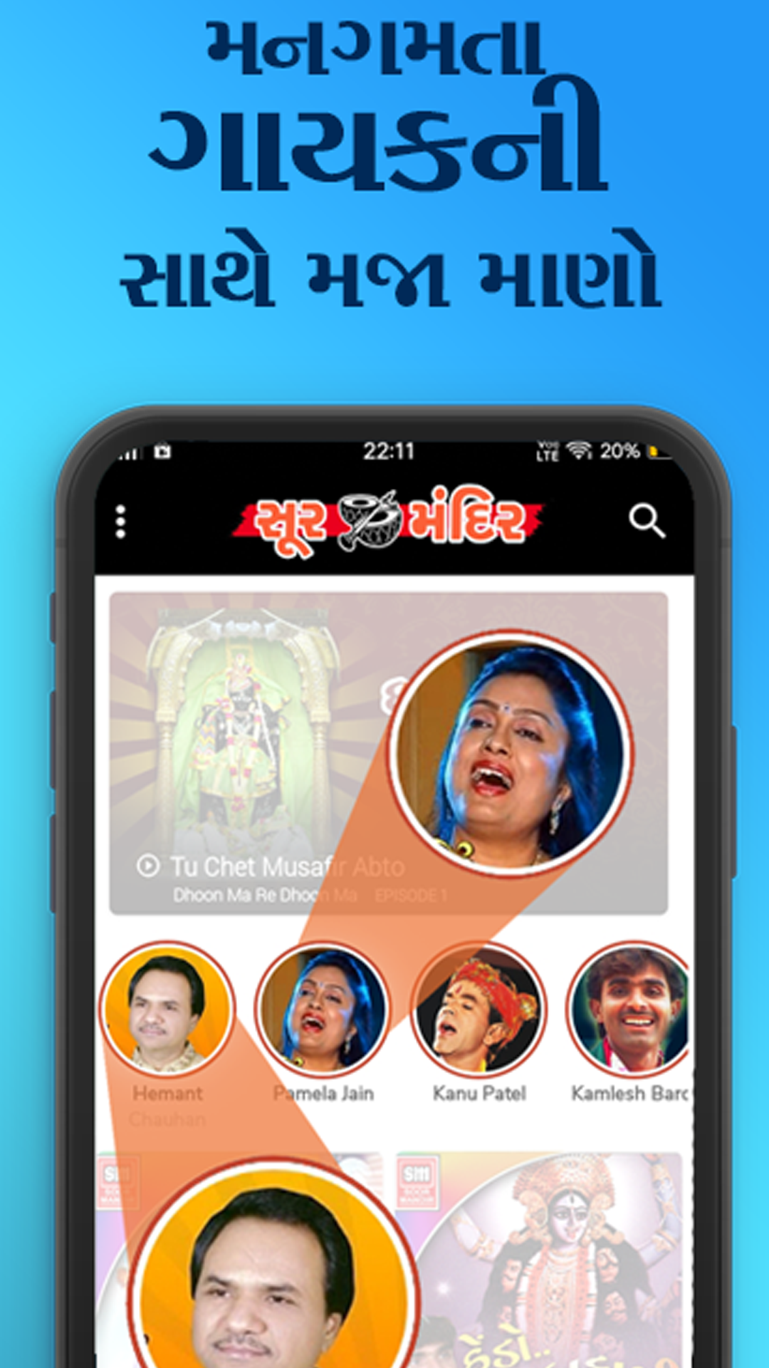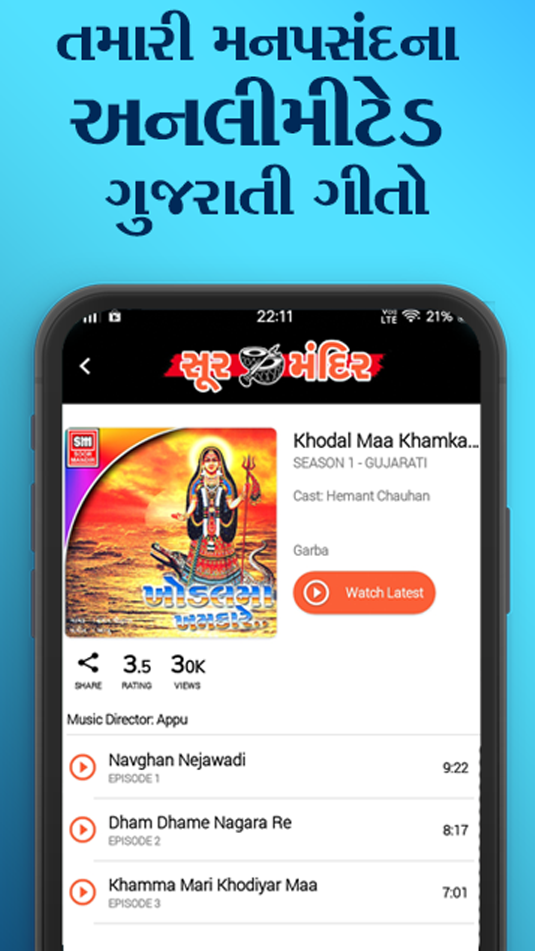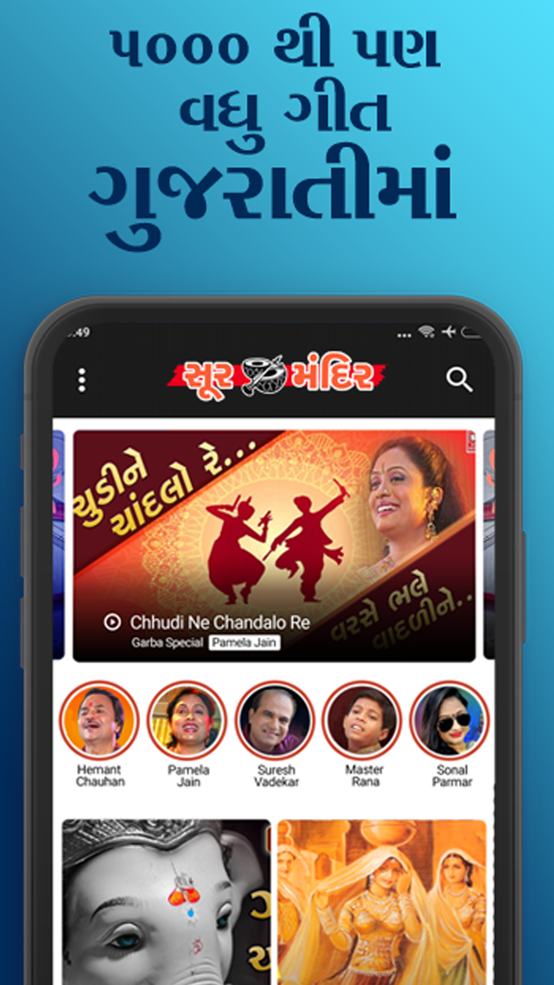 Soor mandir has a unique collection of exclusive Gujarati Video Songs with variety of genres like Devotional, Folk, etc. For Gujarati’s, any festival is incomplete without Gujarati Songs. Gujarati's are very popular for their Garba songs, Bhajan, Gazal, Dakla, Dayro etc. We included all this type of songs in our application. So, User can find all type of Gujarati songs in one place. We are providing best garba collection from popular gujarati singers like Hemant Chauhan, Vikram Thakor, Pamela Jain, Kanu Patel, Rekha Rawal, Kishor Manraja, Nisha Upadhyay, Kishor Manraja, Diwaliben Bhil, Sankar Mahadevan, Satish Dehra, Kamlesh Barot. Soor Mandir App is dedicated to all Gujarati Song lovers from all over the world. It provides the most popular Video Songs of all your favorite singers at a single place in your hands. Soor Mandir App is organized in a well-defined manner, therefore, you won't have to waste your FUN time searching for your favorite singer’s song. Navaratri Garba, dandiya rass, bhajan, aarti, mantra, stohtra, hanuman chalisa, and many more songs are included which is favorite in all generation.