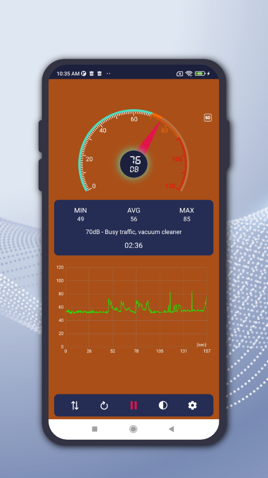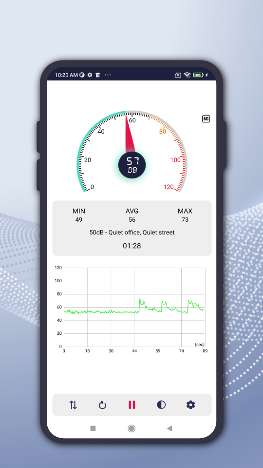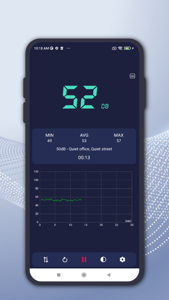 O aplicativo usa o microfone do seu dispositivo para medir a intensidade do som e exibi-lo em decibéis. Os valores medidos são exibidos visualmente e no gráfico que ajuda você a usar o aplicativo facilmente.