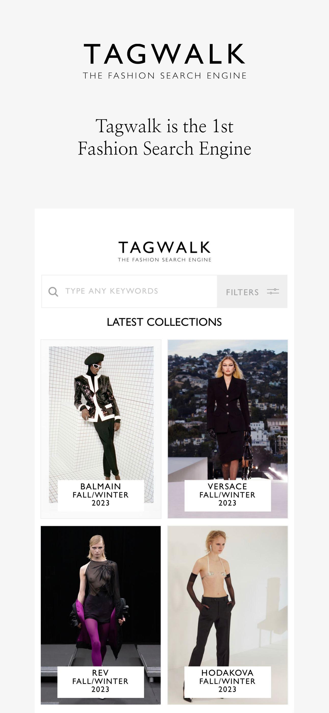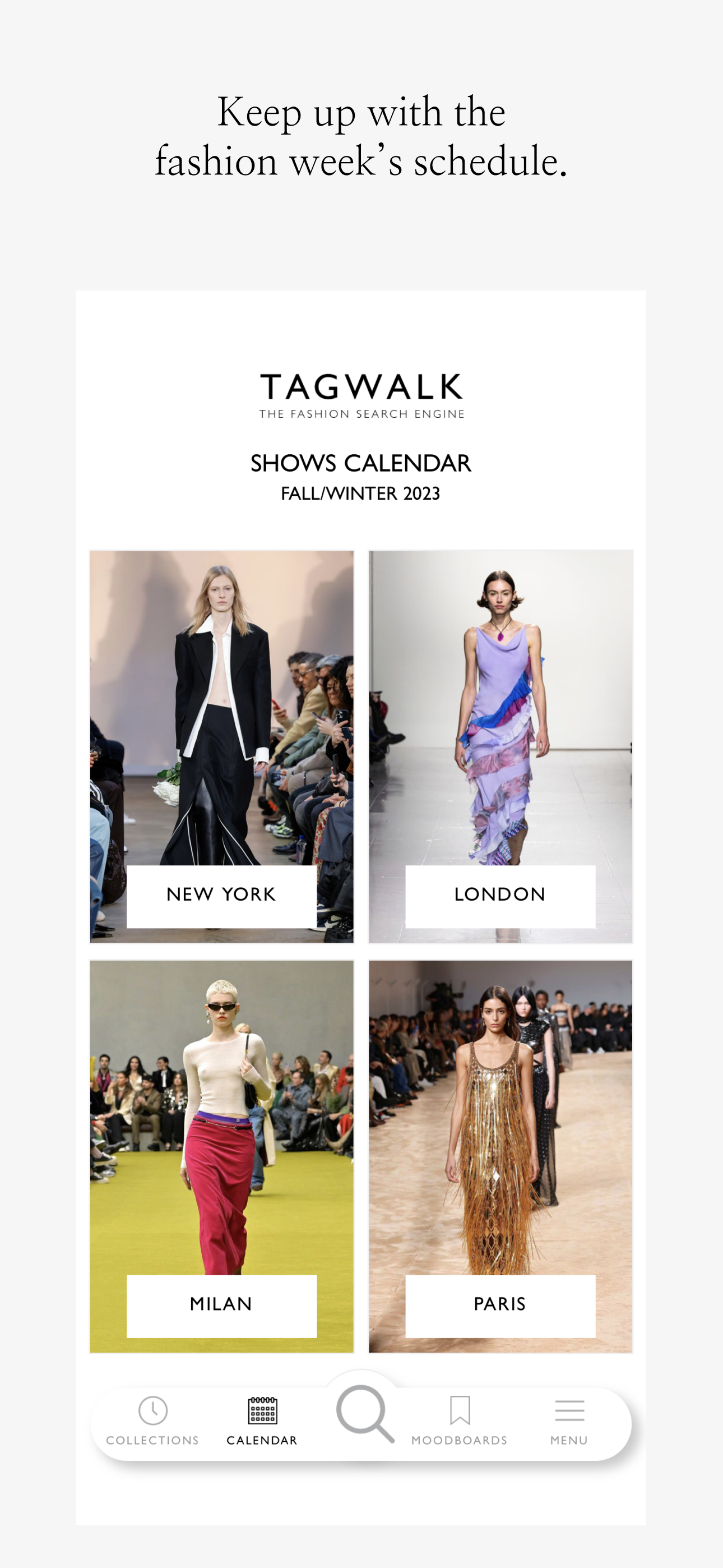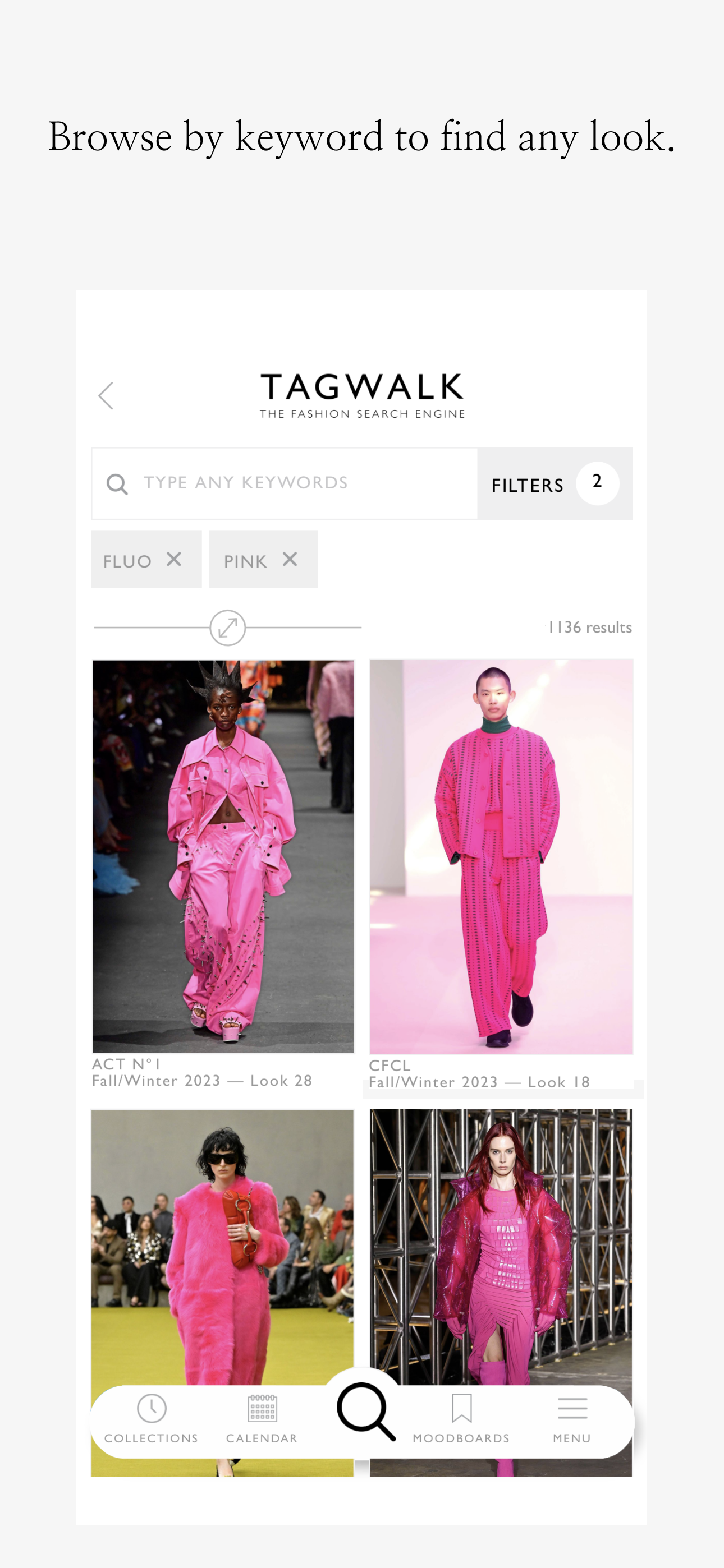 O aplicativo TAGWALK permite que os usuários pesquisem por palavra-chave em todos os desfiles de moda, de Maisons icônicas a jovens talentos, tudo de graça.