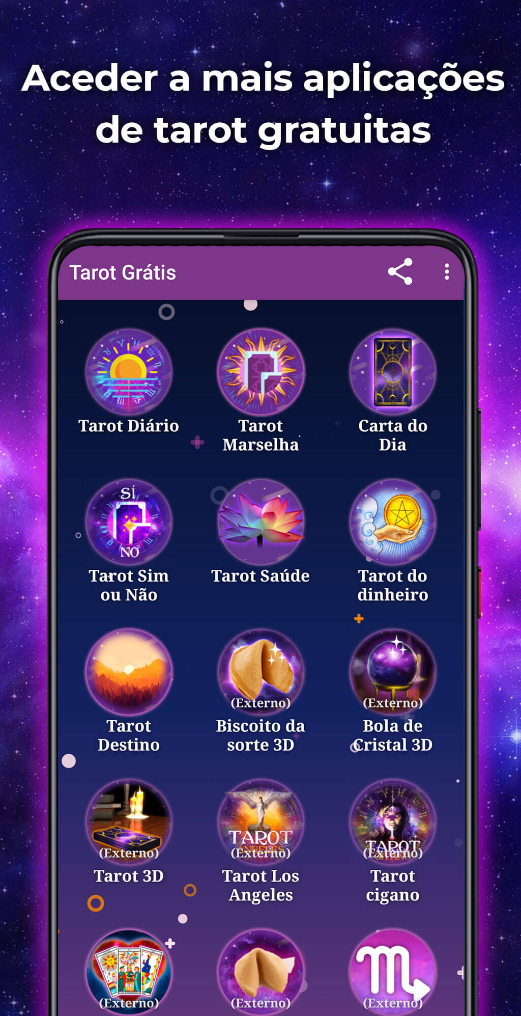Diferentes tipos de tarot no mesmo AppTodos nos cansamos de ter de usar múltiplas aplicações de cartoonismo e astrologia, por isso decidimos juntar tudo numa só aplicação: "Tarot Grátis".