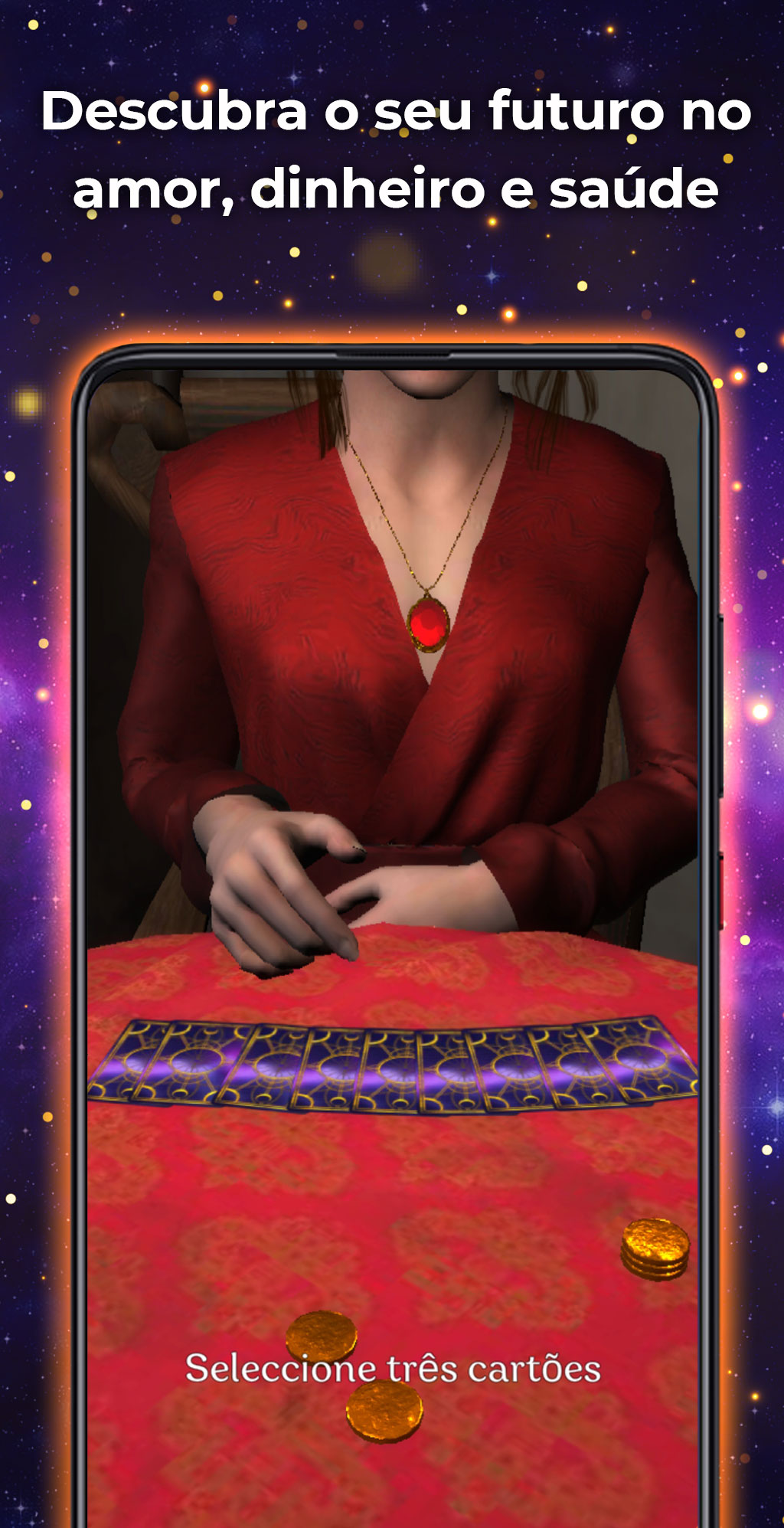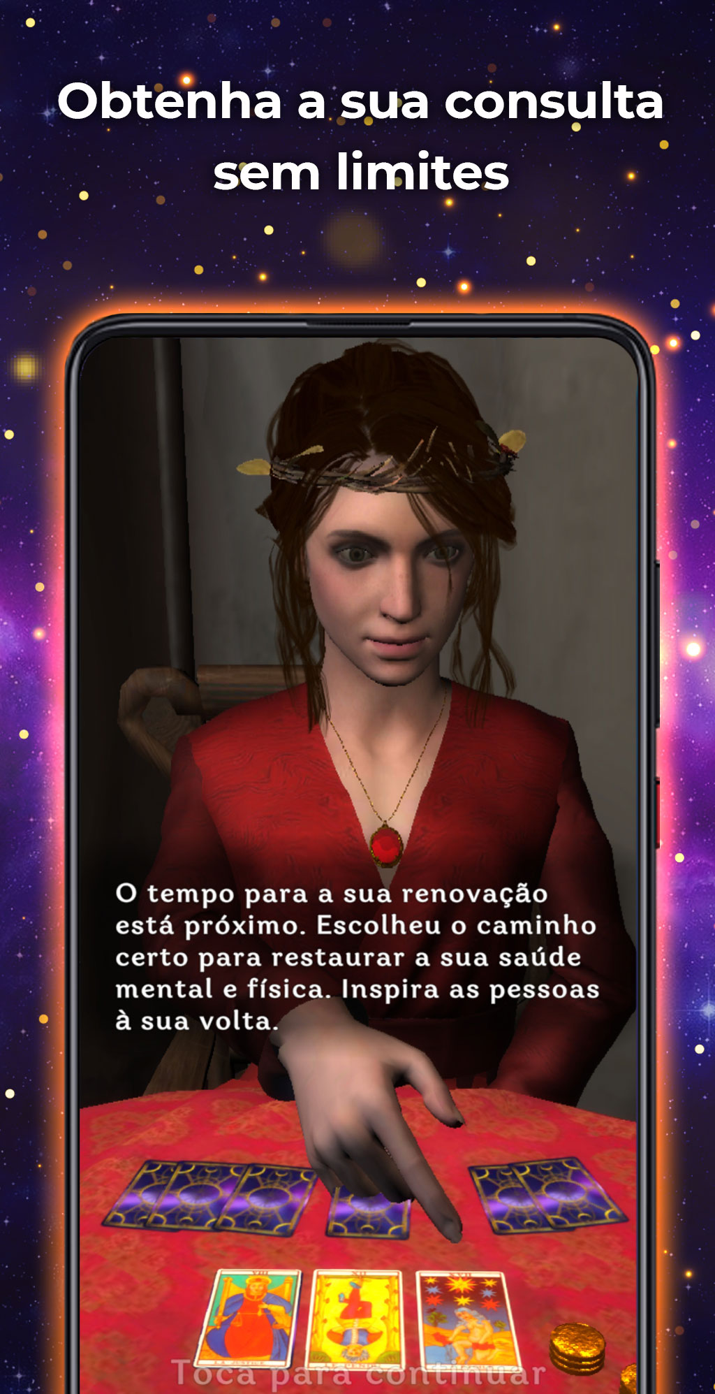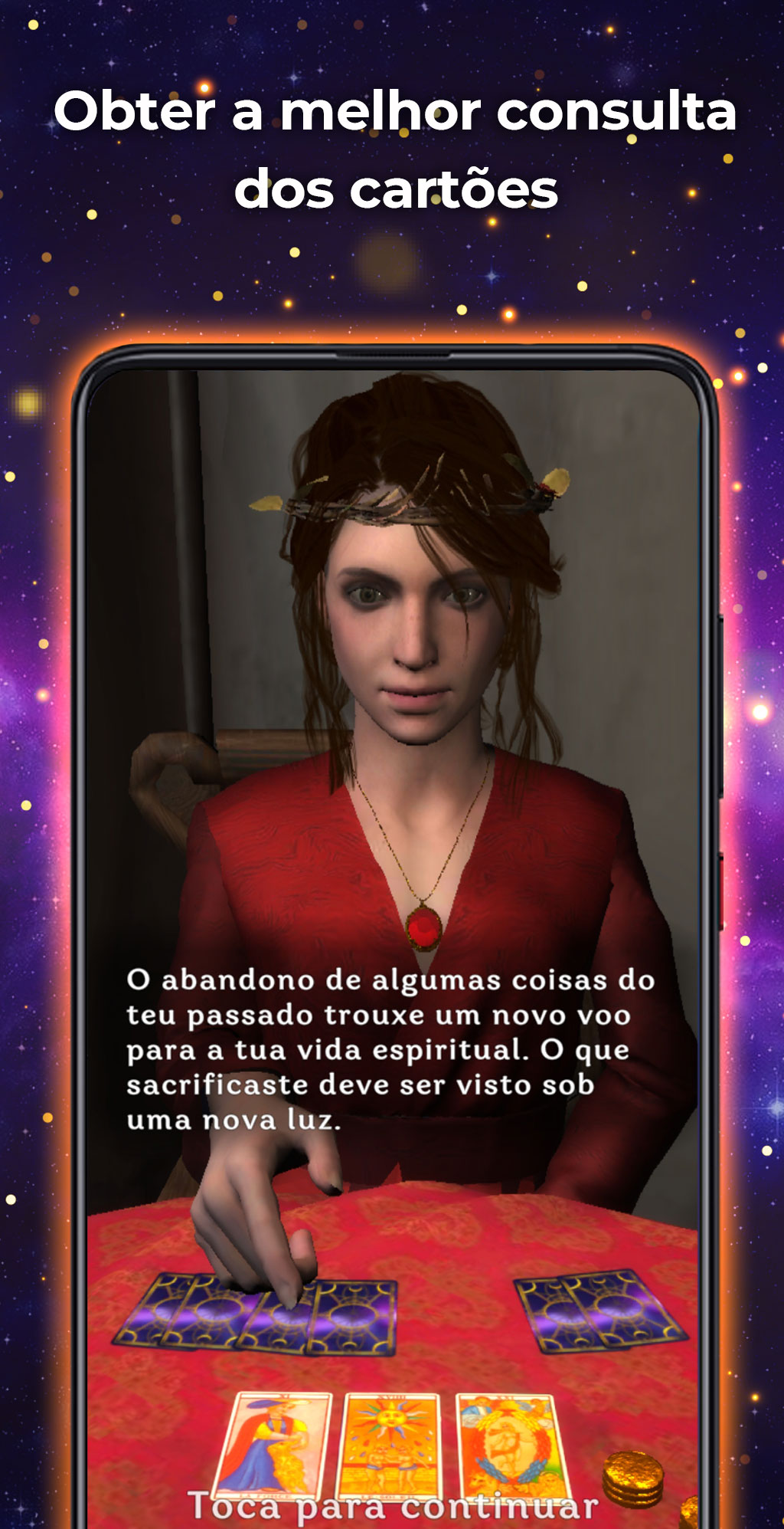 O leitor de tarot 3D é uma aplicação de tarot muito fiável em português que oferece um tipo de spread muito específico, mas muito preciso: um spread de três cartas do passado, presente e futuro.
