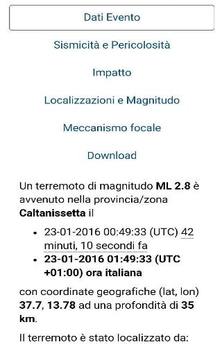 notifiche push, sono quelli pubblicati da INGV (Istituto Nazionale di Geofisica e Vulcanologia), © ISIDe Working Group (INGV, 2010); la pubblicazione di questi dati avviene solitamente dopo un ritardo di ca. 20 minuti dall'evento sismico.