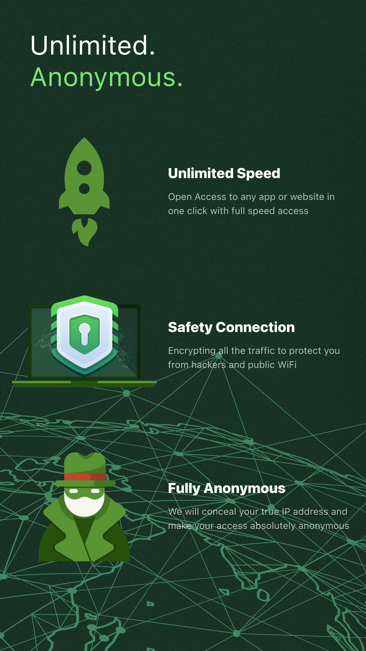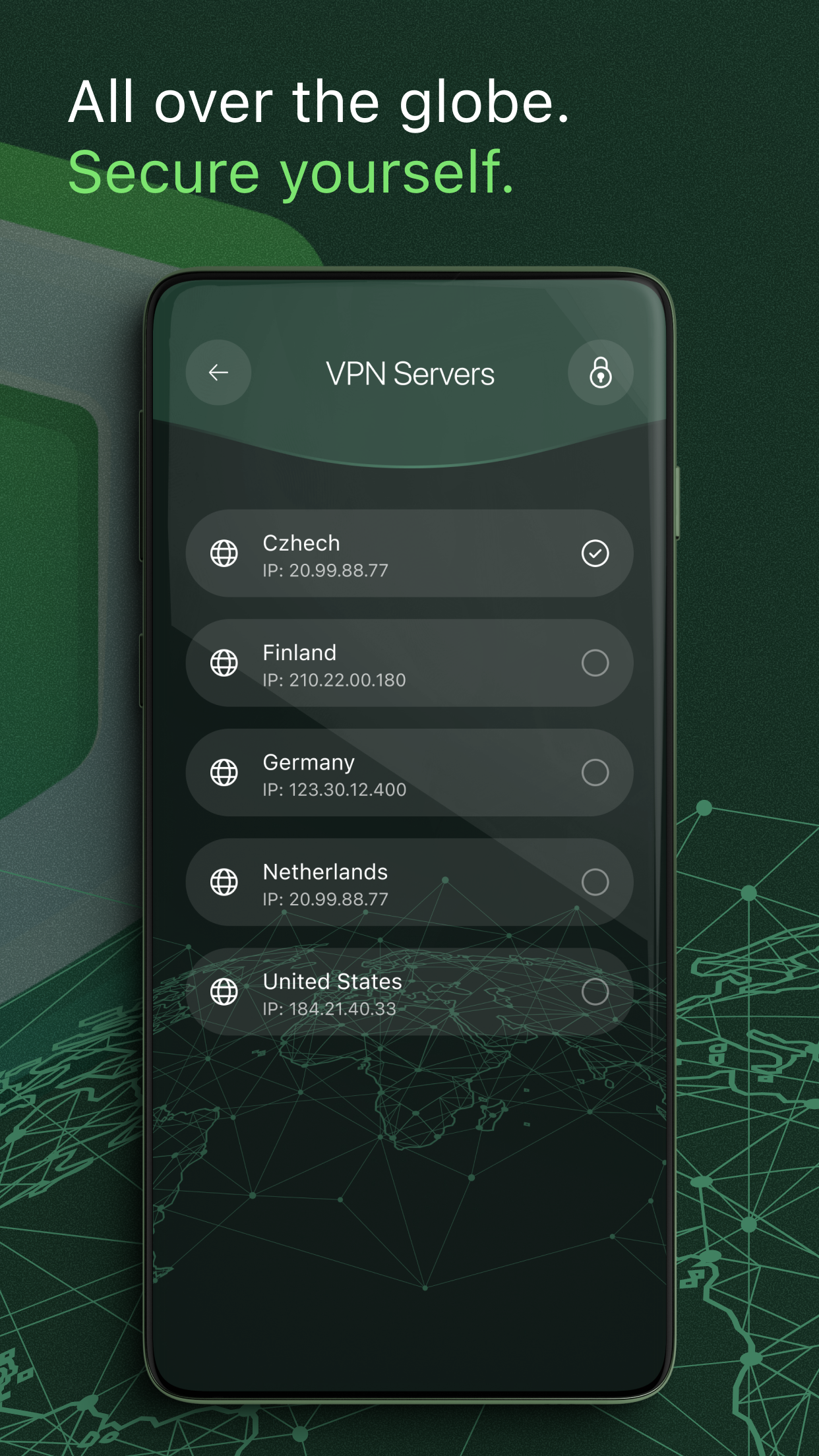 Sem necessidade de registro. Leva apenas um toque para escolher e um toque para conectar o servidor desejado.