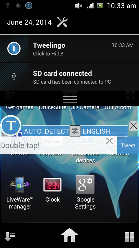 With Tweelingo, you can easily translate the tweets into your language without closing the active application; you can see the translated result at the same place! Also you can easily type in your response, translate and tweet the translated text! Tweelingo is the simplest and fastest way for sending your tweets out to a multilingual world.