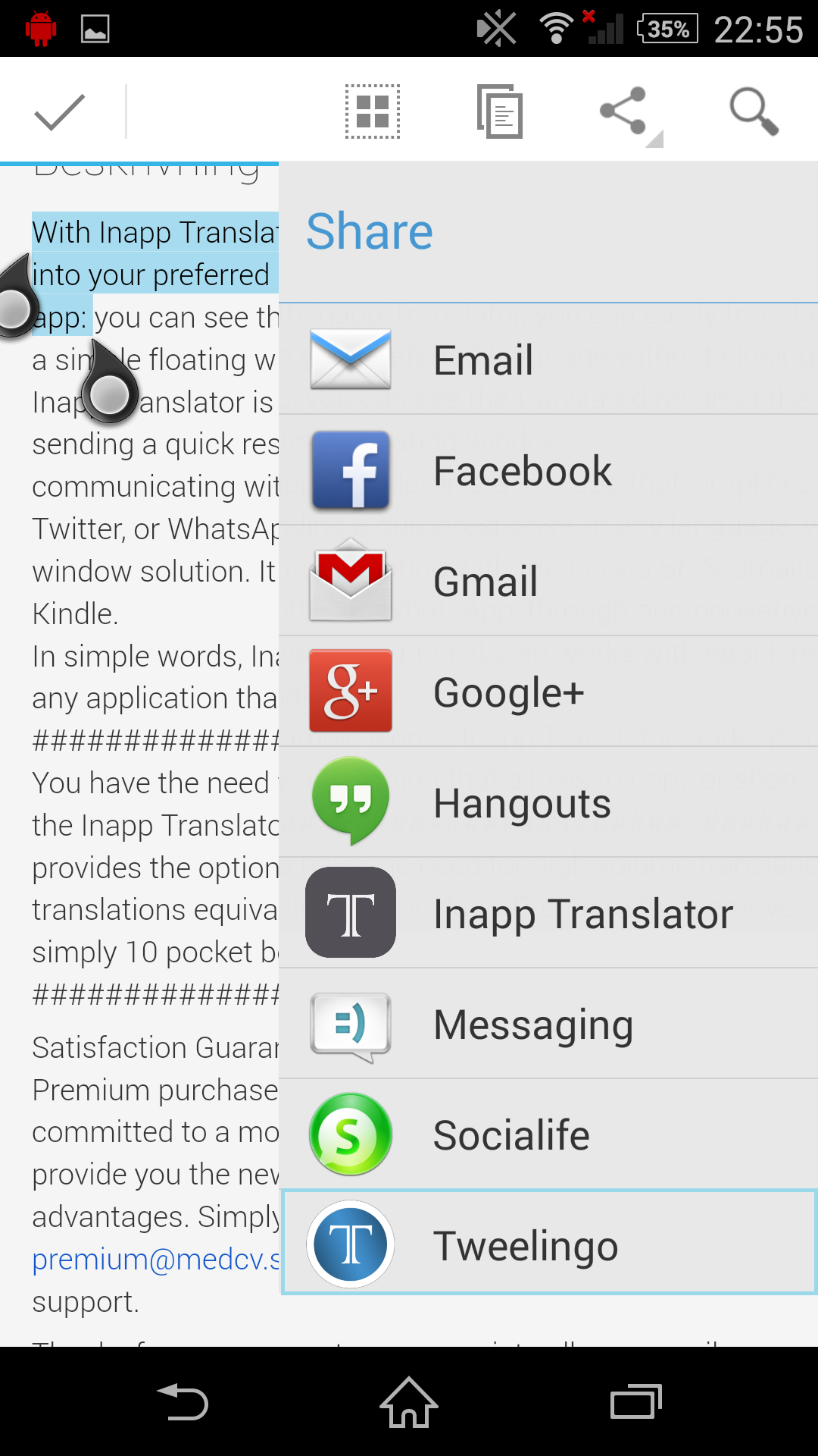 - Via Share option you can automatically translate the selected text without copy to clipboard-