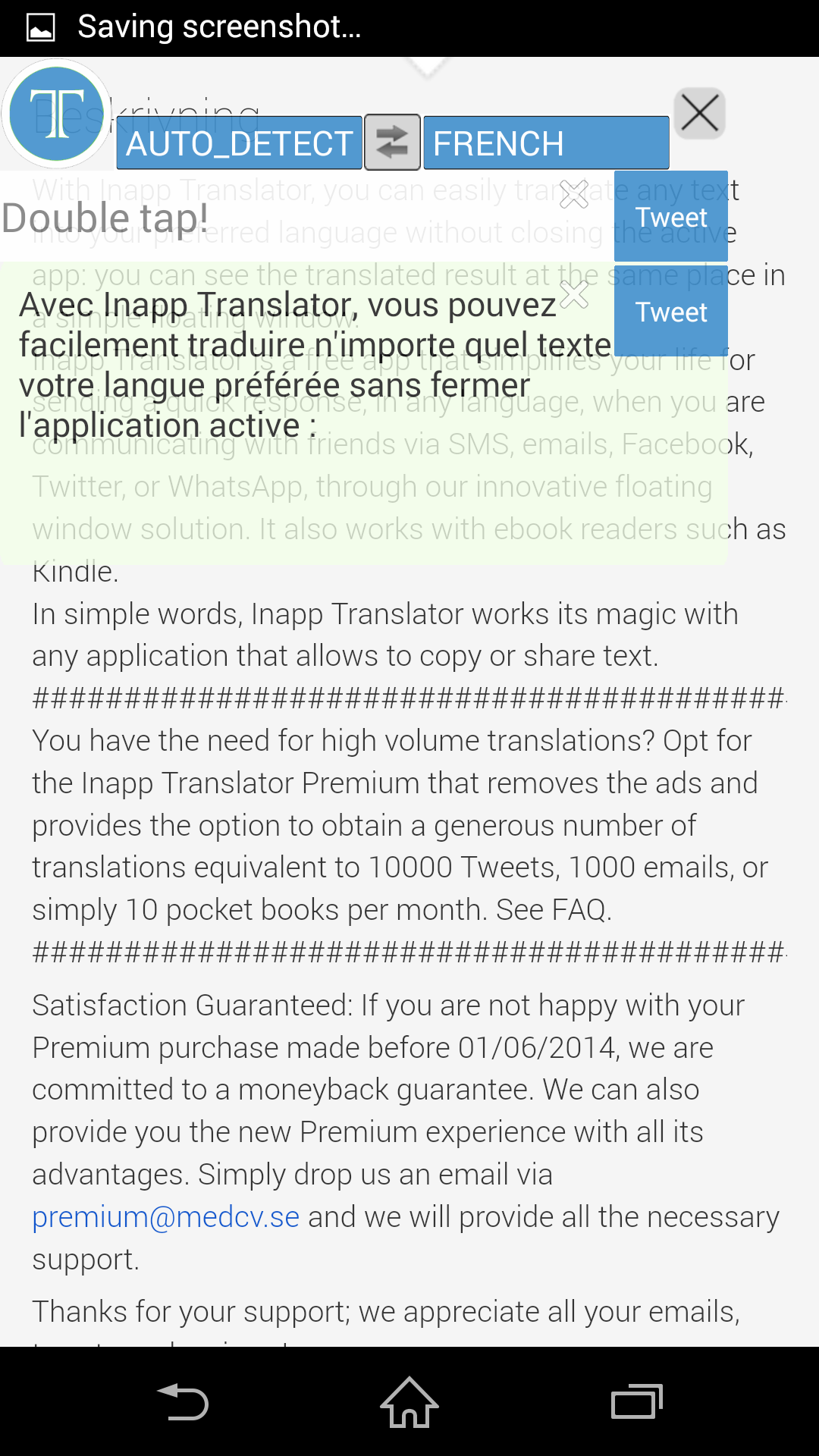 You have the need for high volume translations? Opt for the Tweelingo Premium that removes the ads and provides the option to obtain a generous number of translations equivalent to 10000 Tweets, 1000 emails, or simply 10 pocket books per month. See FAQ.